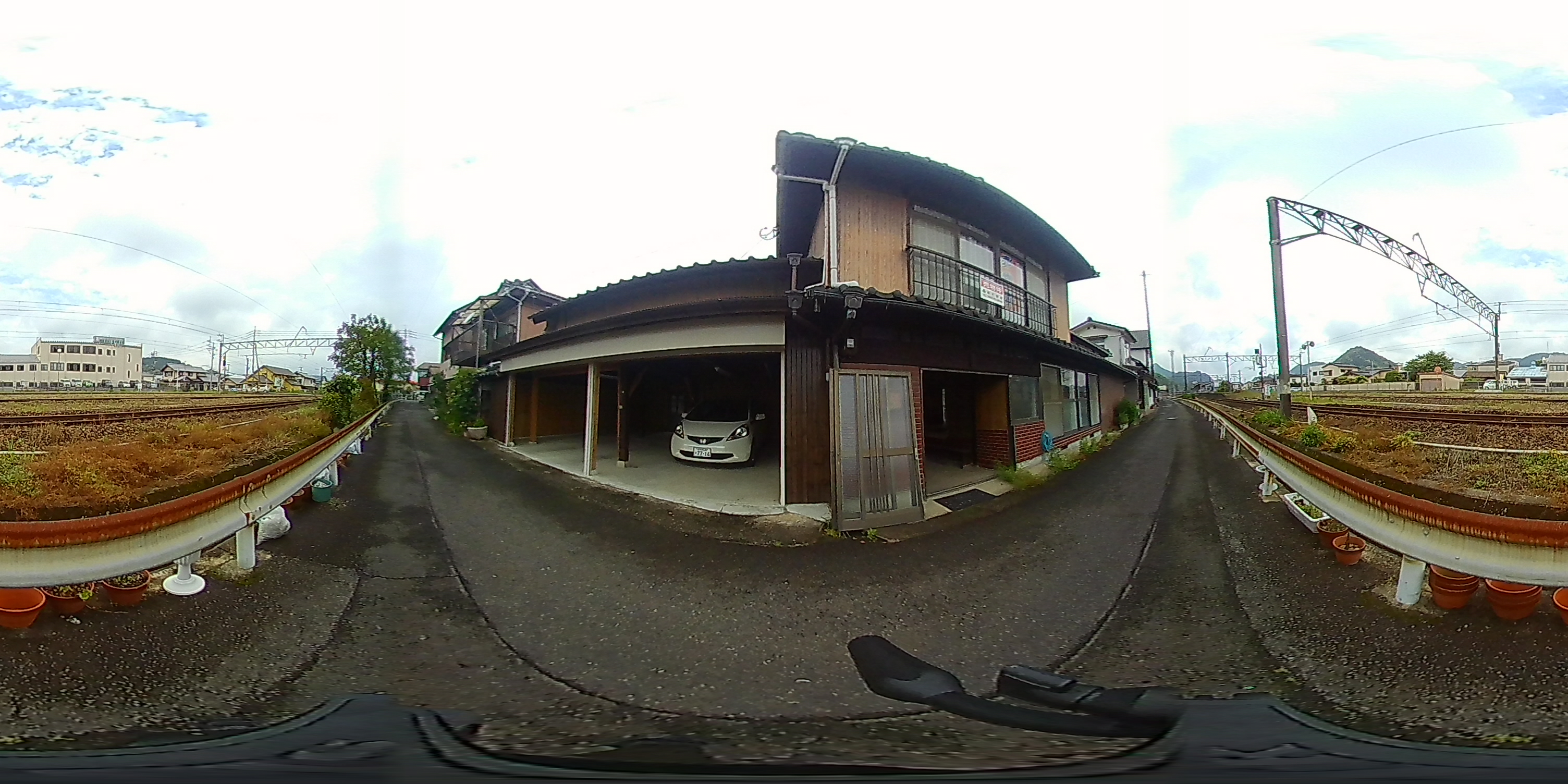 まずは周辺環境から。今回の物件、玄関側は線路沿い、裏口側は県道沿いという立地になっています。また、踏切までは50mほど。騒音や振動などを考えると、好立地とは言い難い場所ですが、駅が近く買い物も徒歩圏内というメリットも。電車の通過音や踏切の警報音などは、ぜひ現地で体感してみてください。