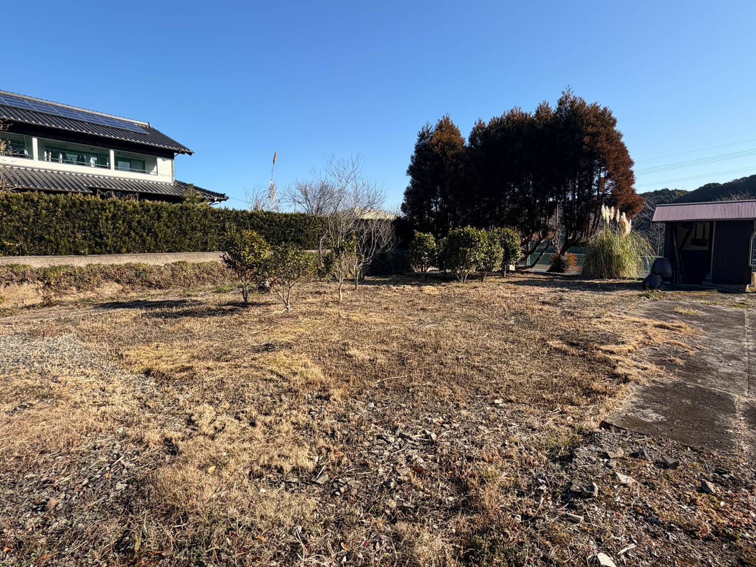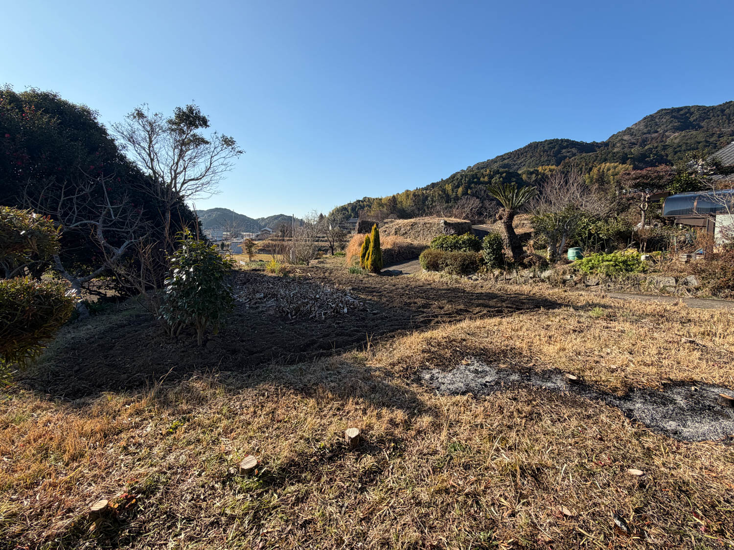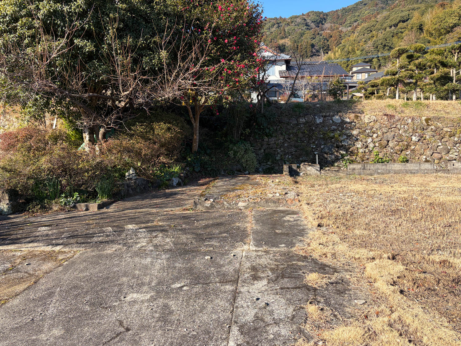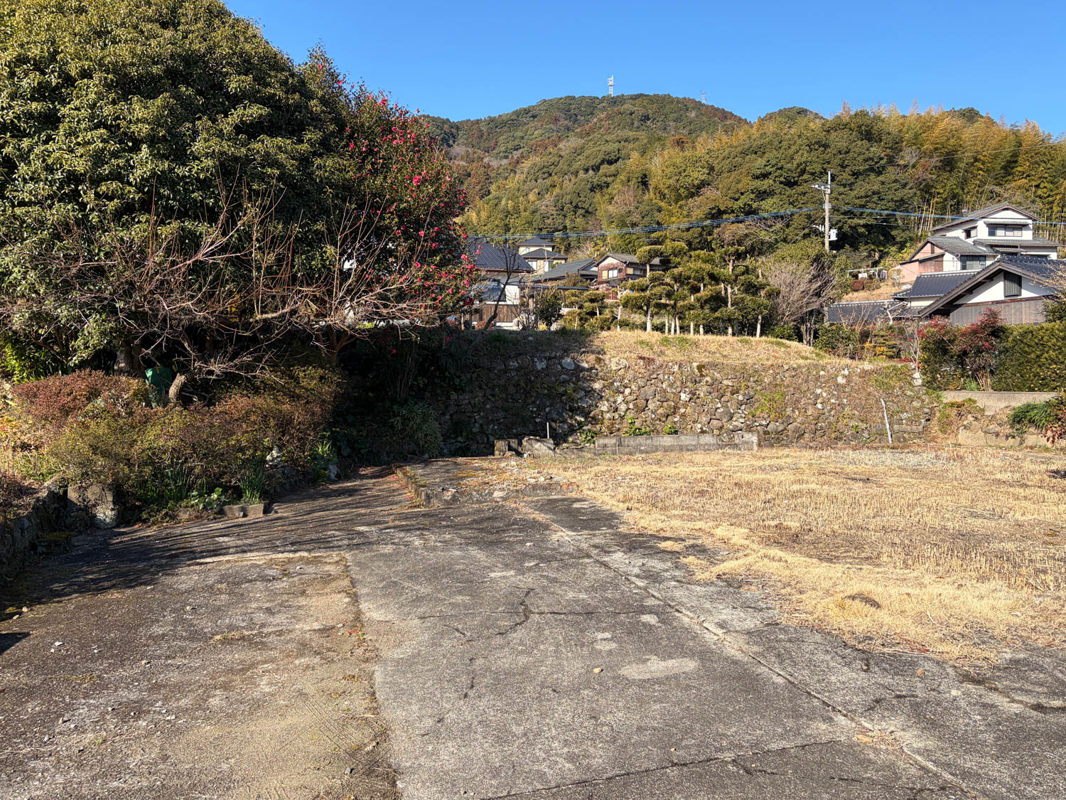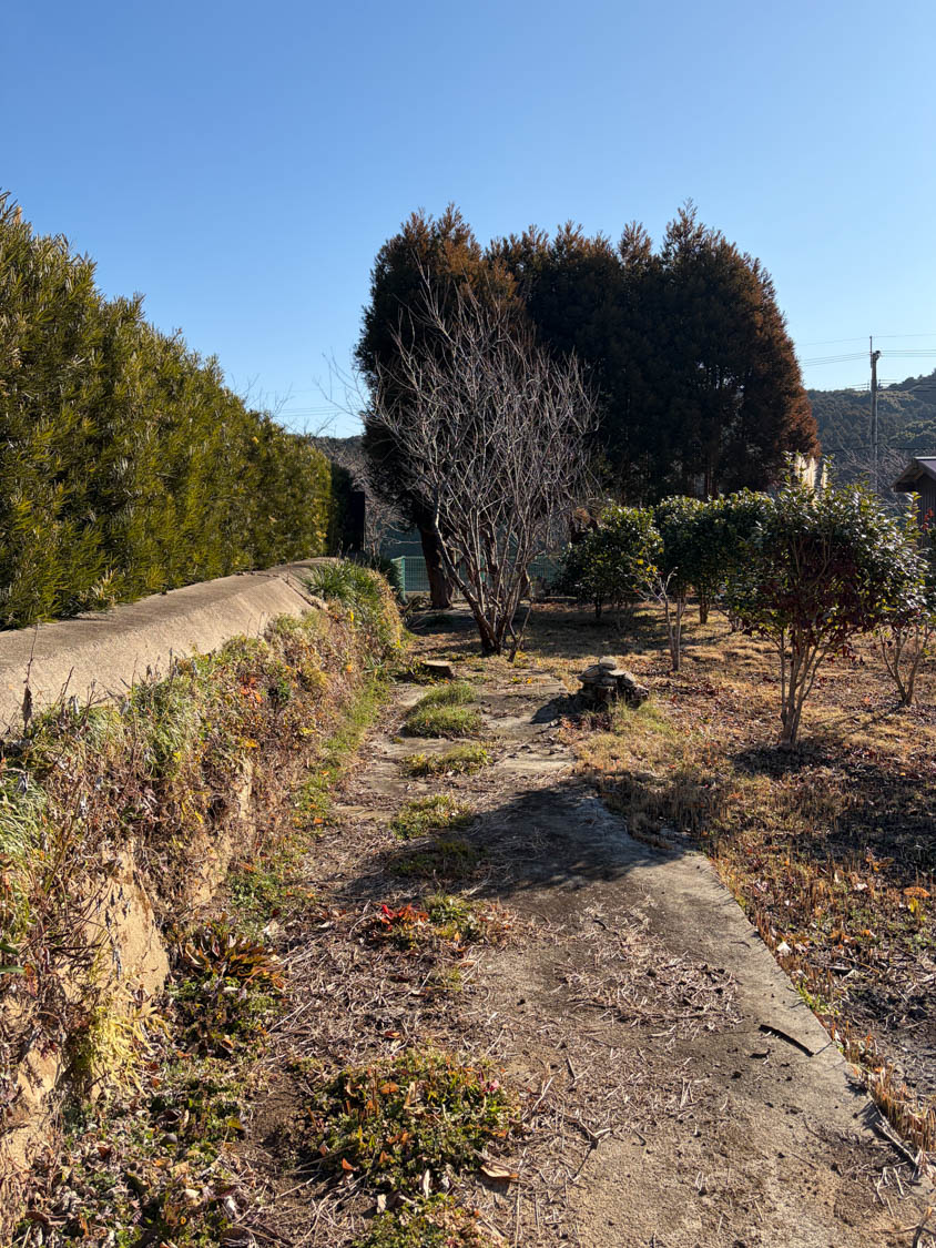 石積みから上が畑、生垣より向こうが隣家です。敷地の奥には、樹木が大きく育っていました。