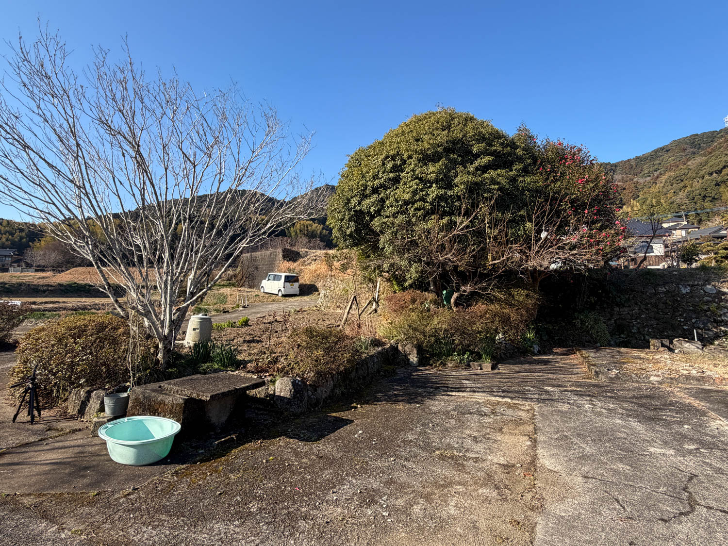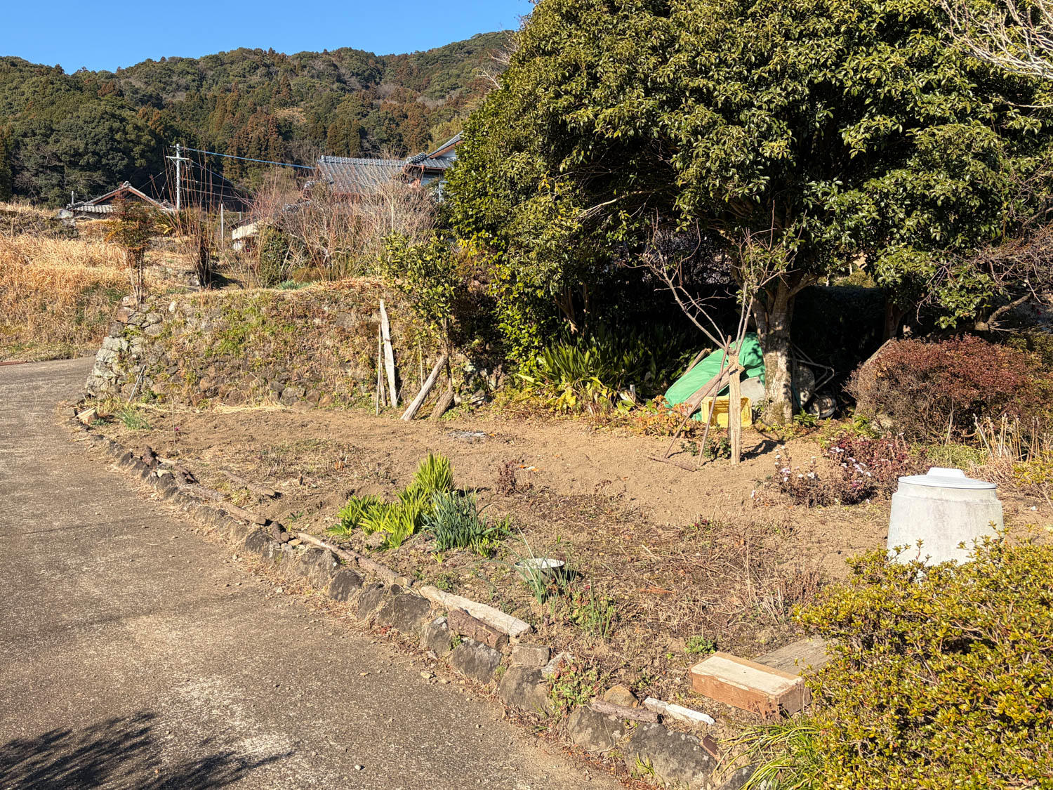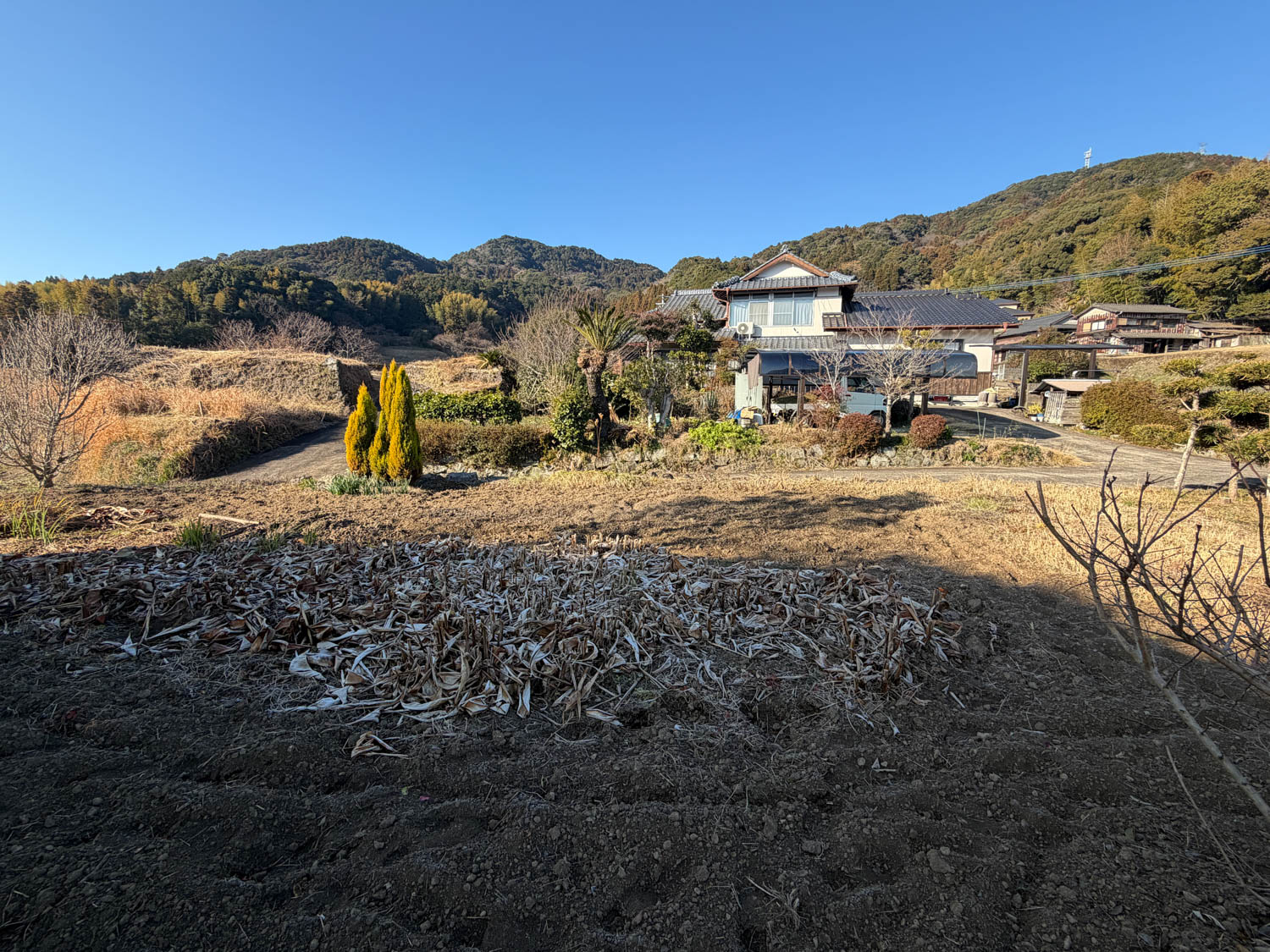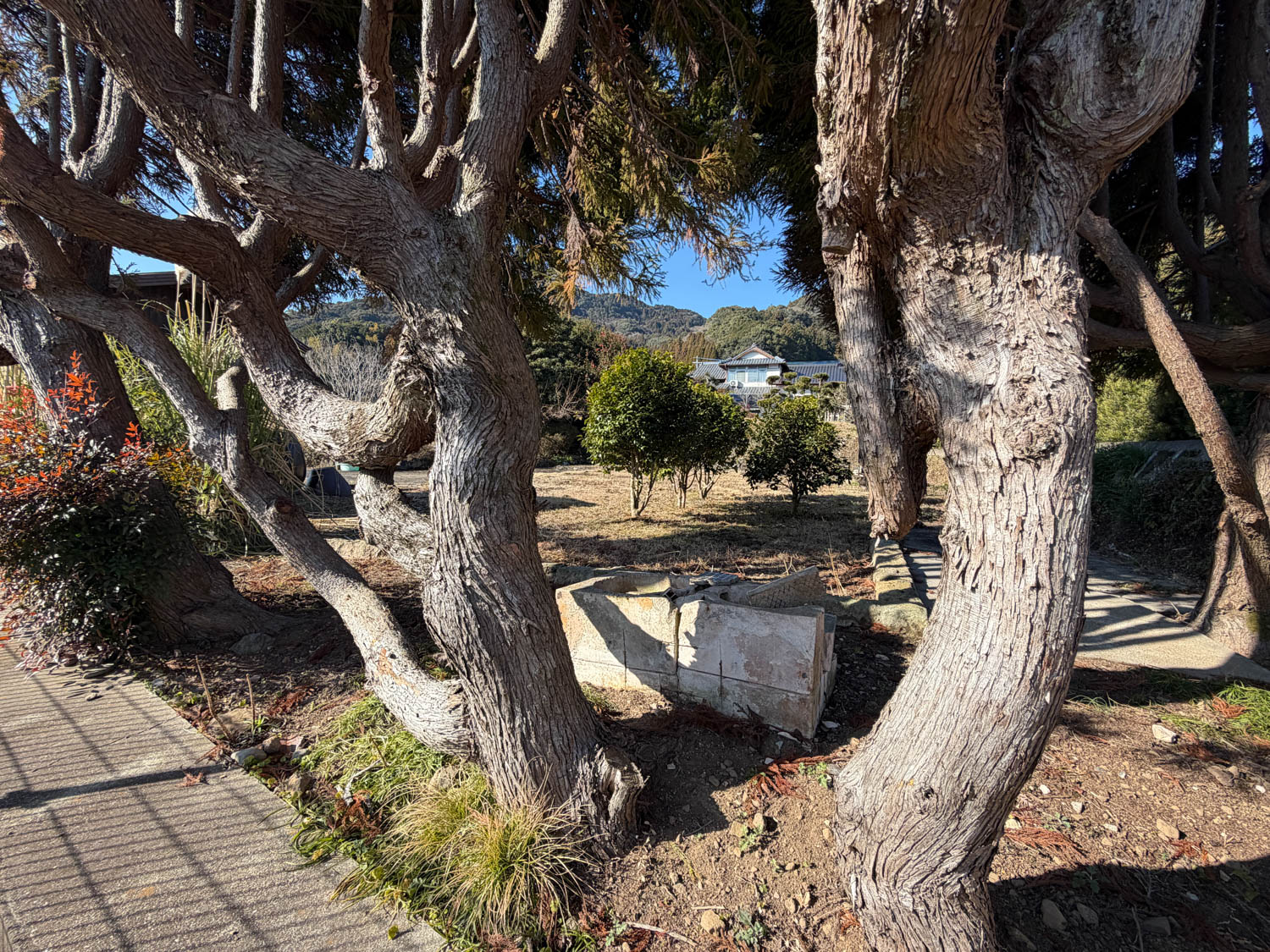 石積みから上が畑、生垣より向こうが隣家です。敷地の奥には、樹木が大きく育っていました。