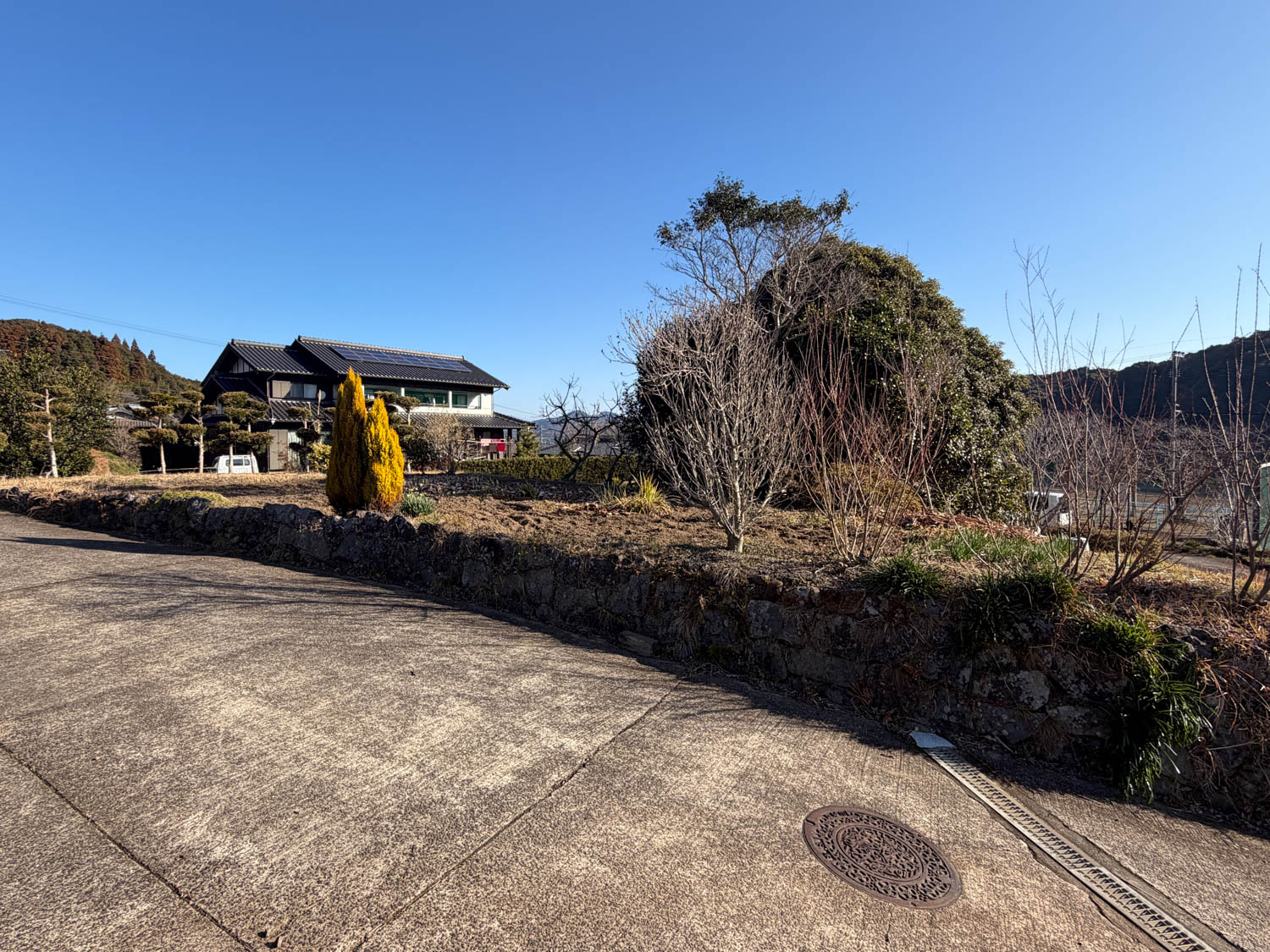側溝は石積みの端から端まで設けられていて、隣地際に沿って続いています。