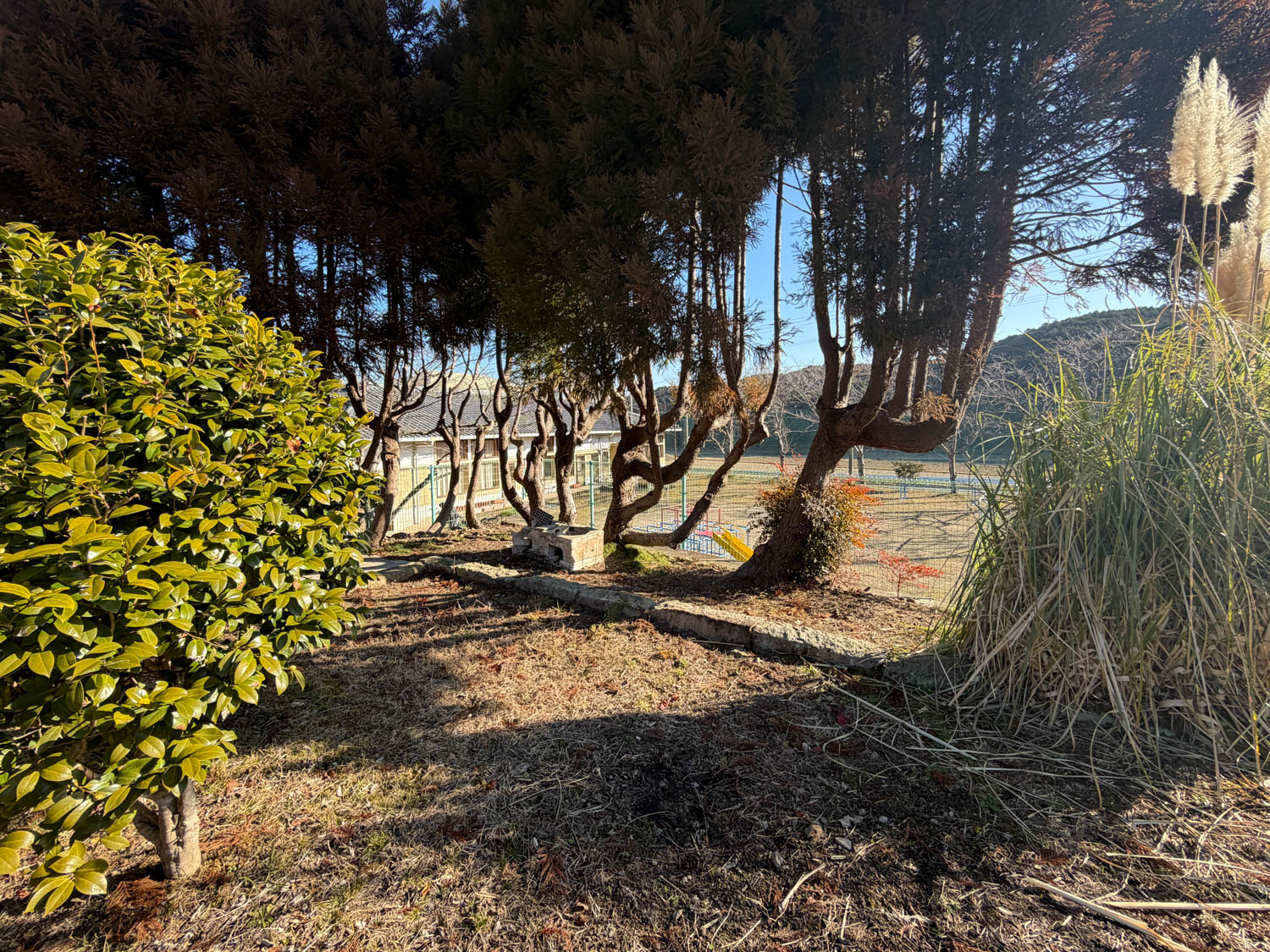 大きく育った木々達。目隠しや防風林の役割も果たしてくれそうですが、少し選定するとすっきりとした印象になるかもしれません。