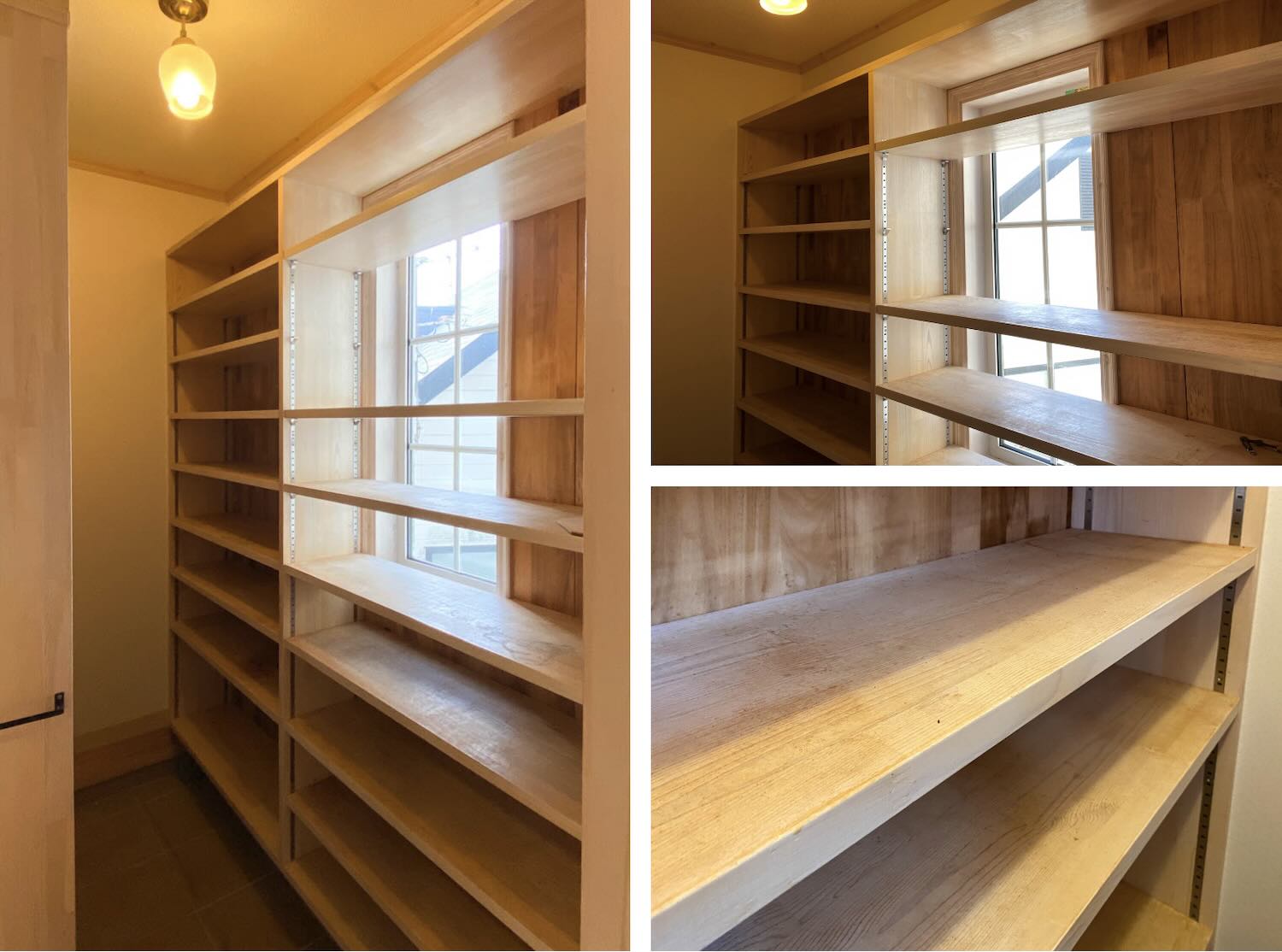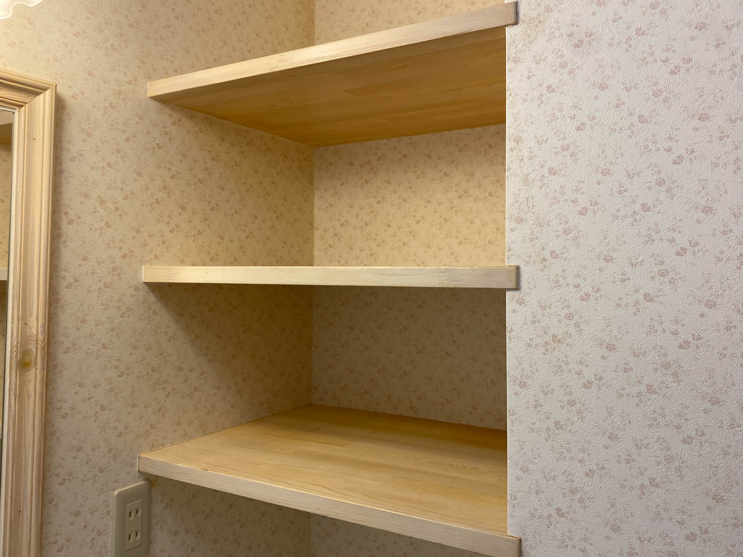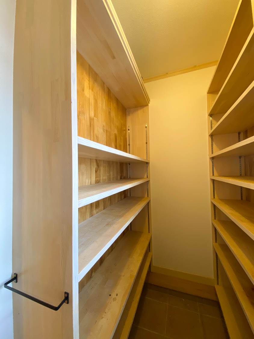 奥行き30cmほどの棚板が壁一面に設けられているので、収納力もバッチリです。