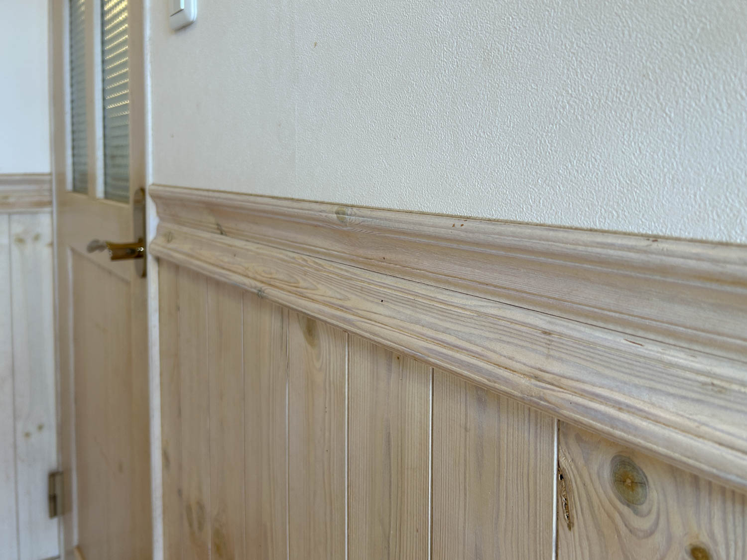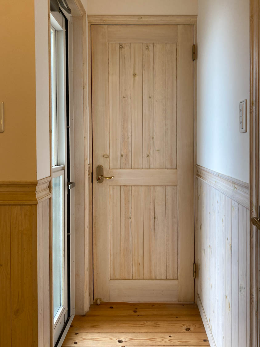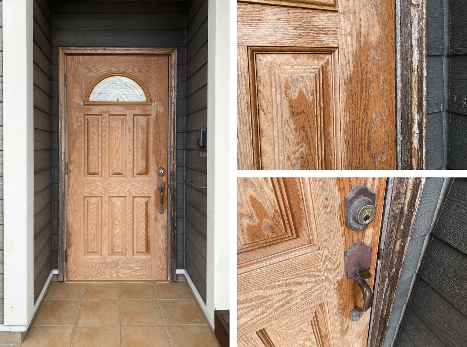 木製の玄関ドアはステンドグラスの飾り窓が良いアクセントになっています。ドア本体や枠には、全体的に剥がれなどの傷みが見られました。