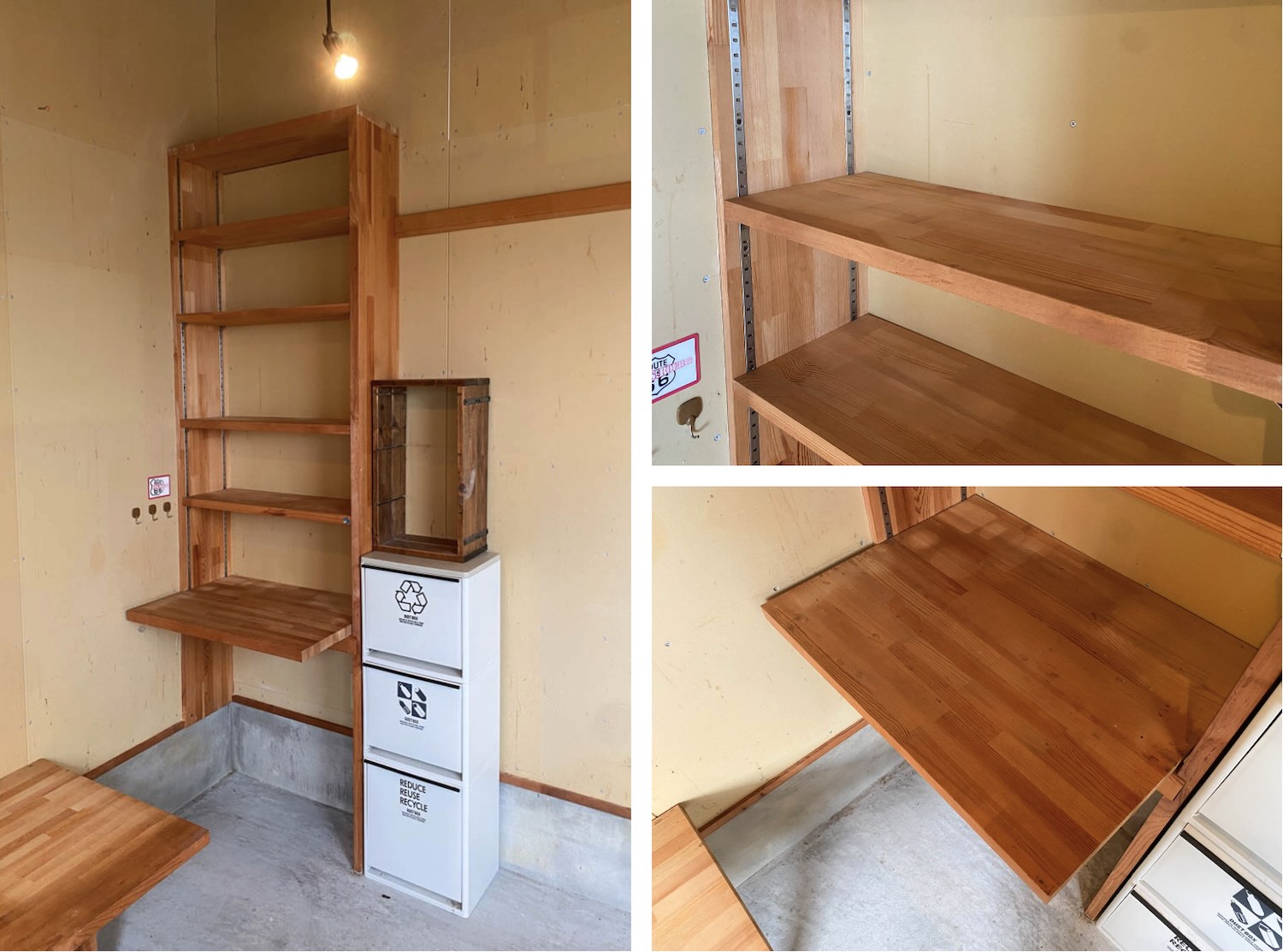 ガレージの奥には棚も据え付けられていて、一番下の段はテーブルとしてもご使用いただけるようになっています。