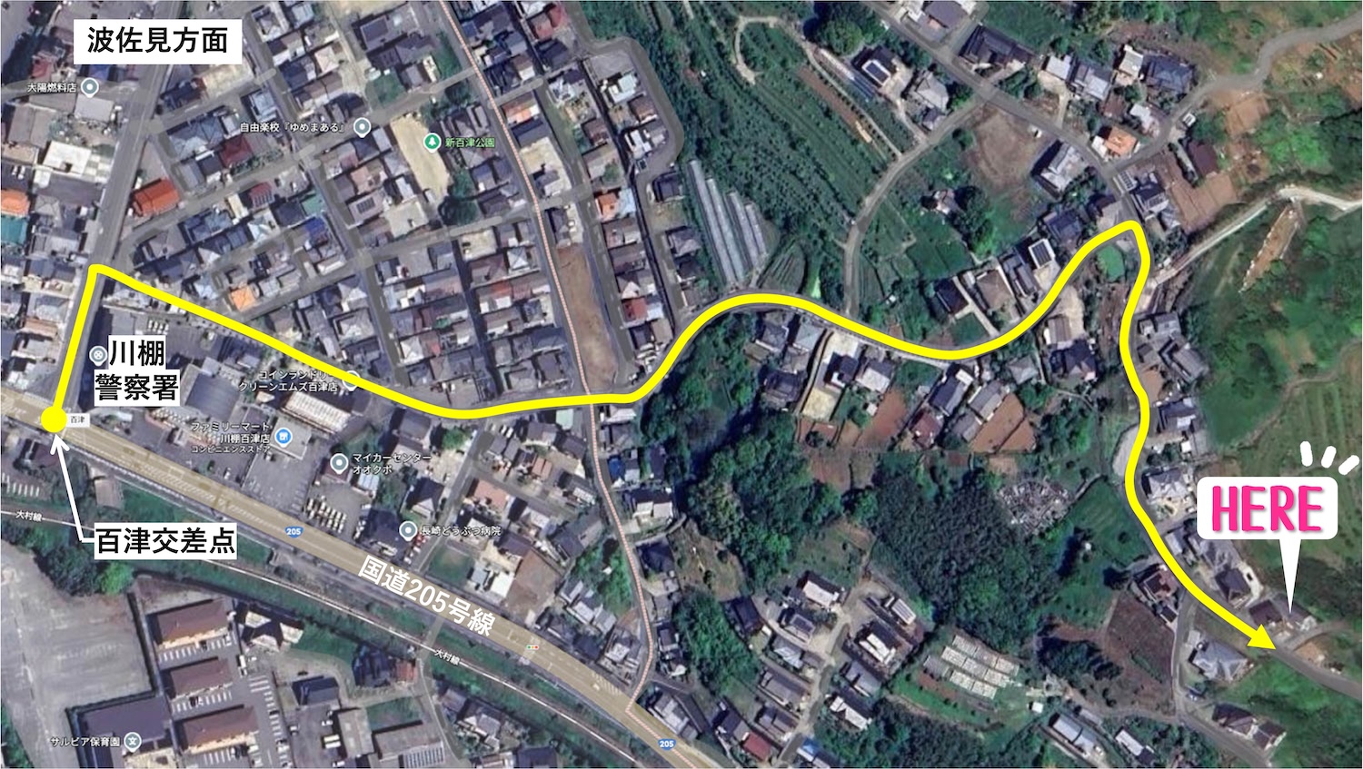 物件までのルートを上空から見ていきましょう。黄色で示しているルートが物件までの道のりです。国道205号線の百津ももづ交差点から北側に進み、さらに右折して進んでいきます。道幅はそこまで広くないので、人や車に気を配りながらゆっくり進むと安心です。