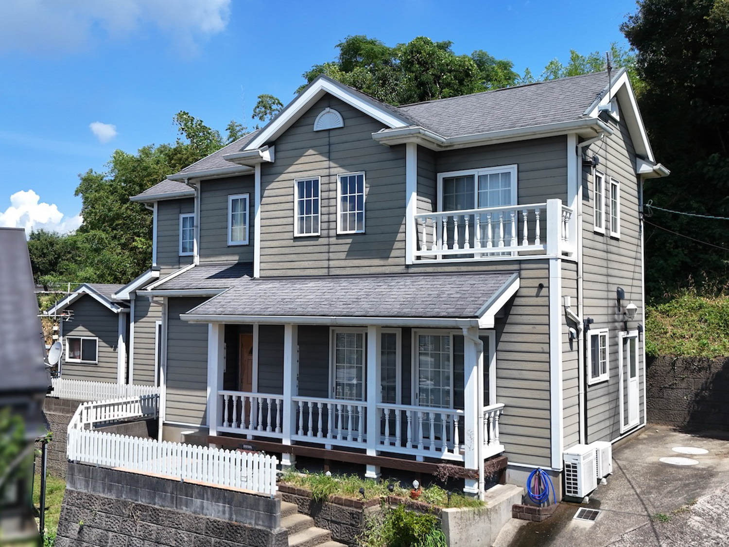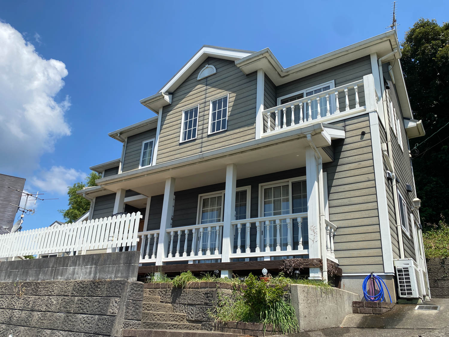 優しい色合いの外壁にホワイトの縁取り、カバードポーチに妻飾りと、輸入住宅特有のアイテムがふんだんに使われています。