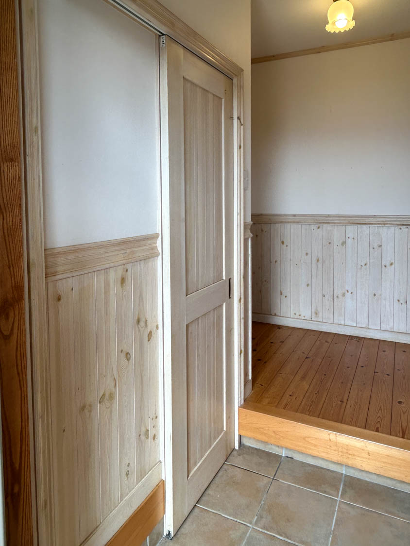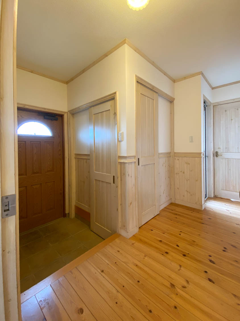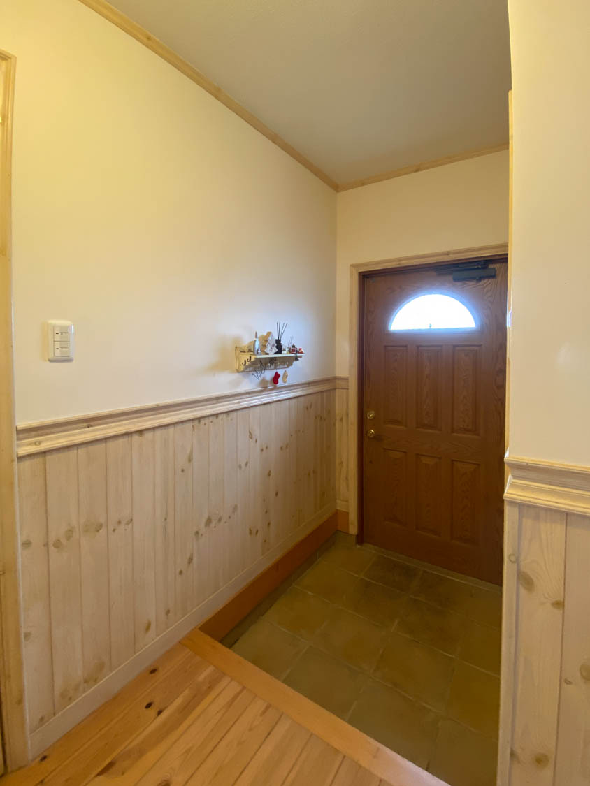 優しい色合いでまとめられた玄関ホール。(広角で撮影しています)
