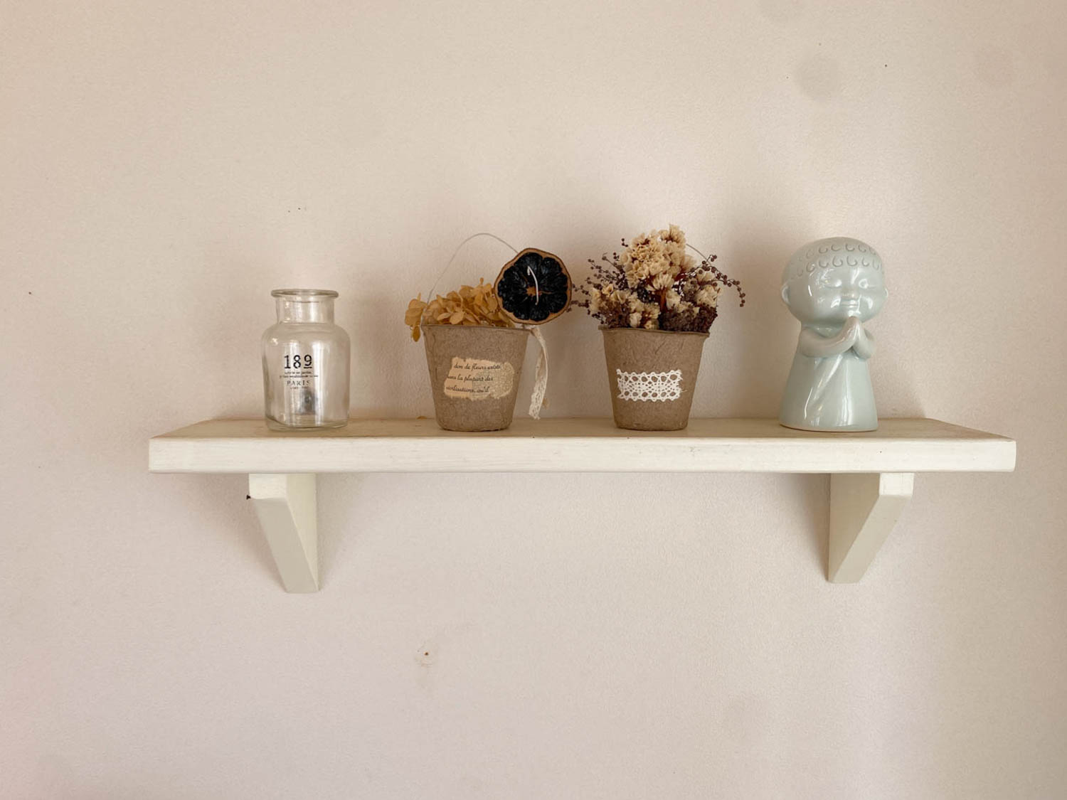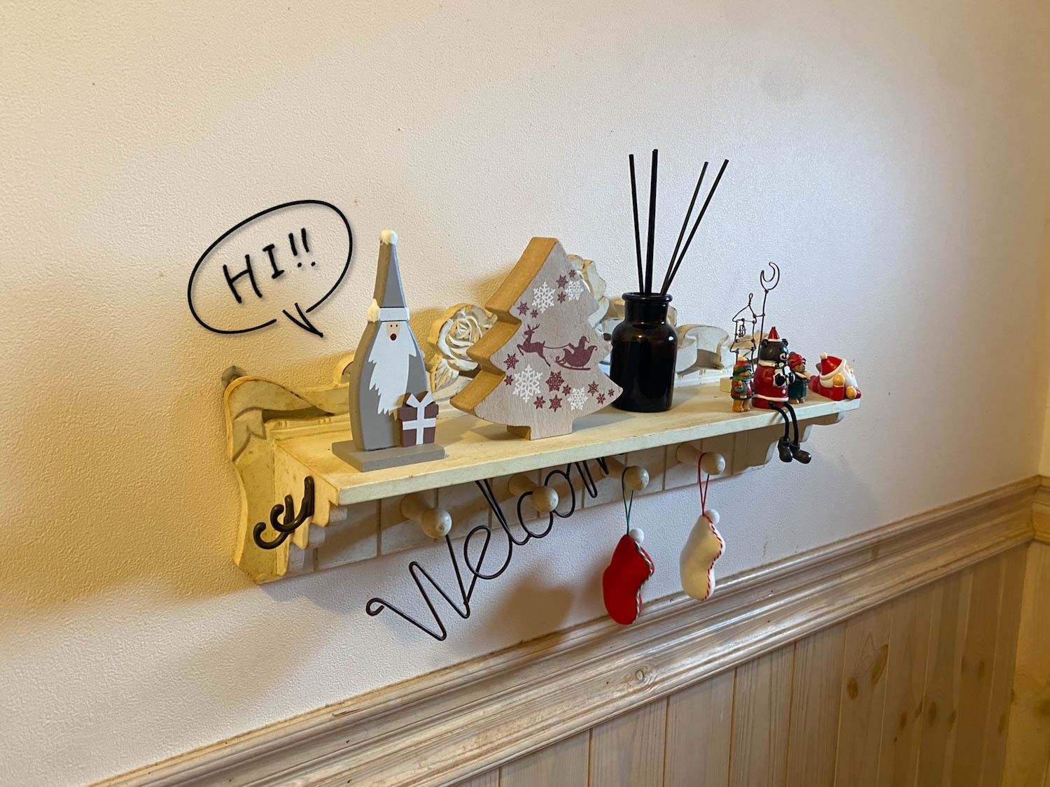 壁にはちょっとしたウォールシェルフも設置されています。撮影時にはクリスマスの小物たちが出迎えてくれました。
