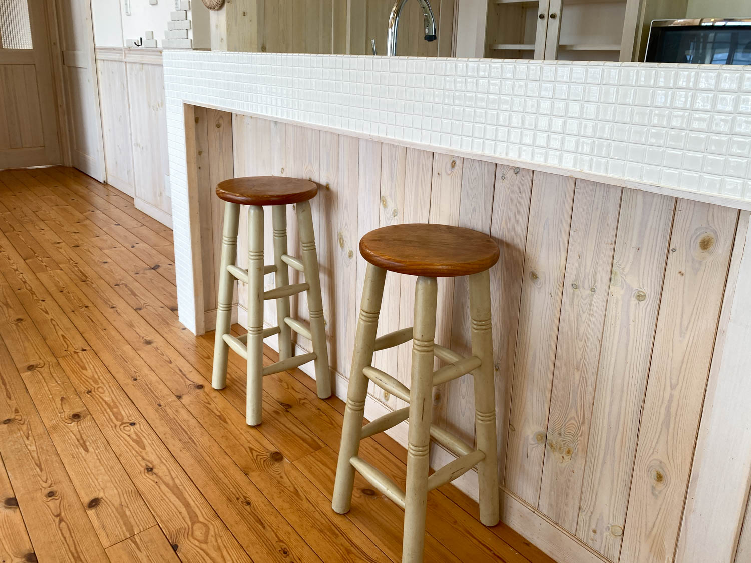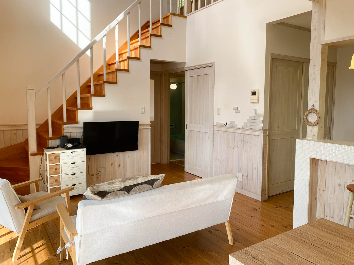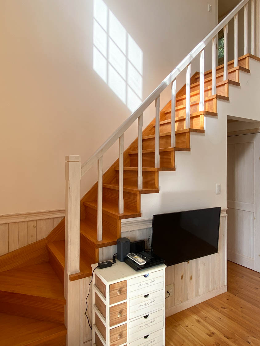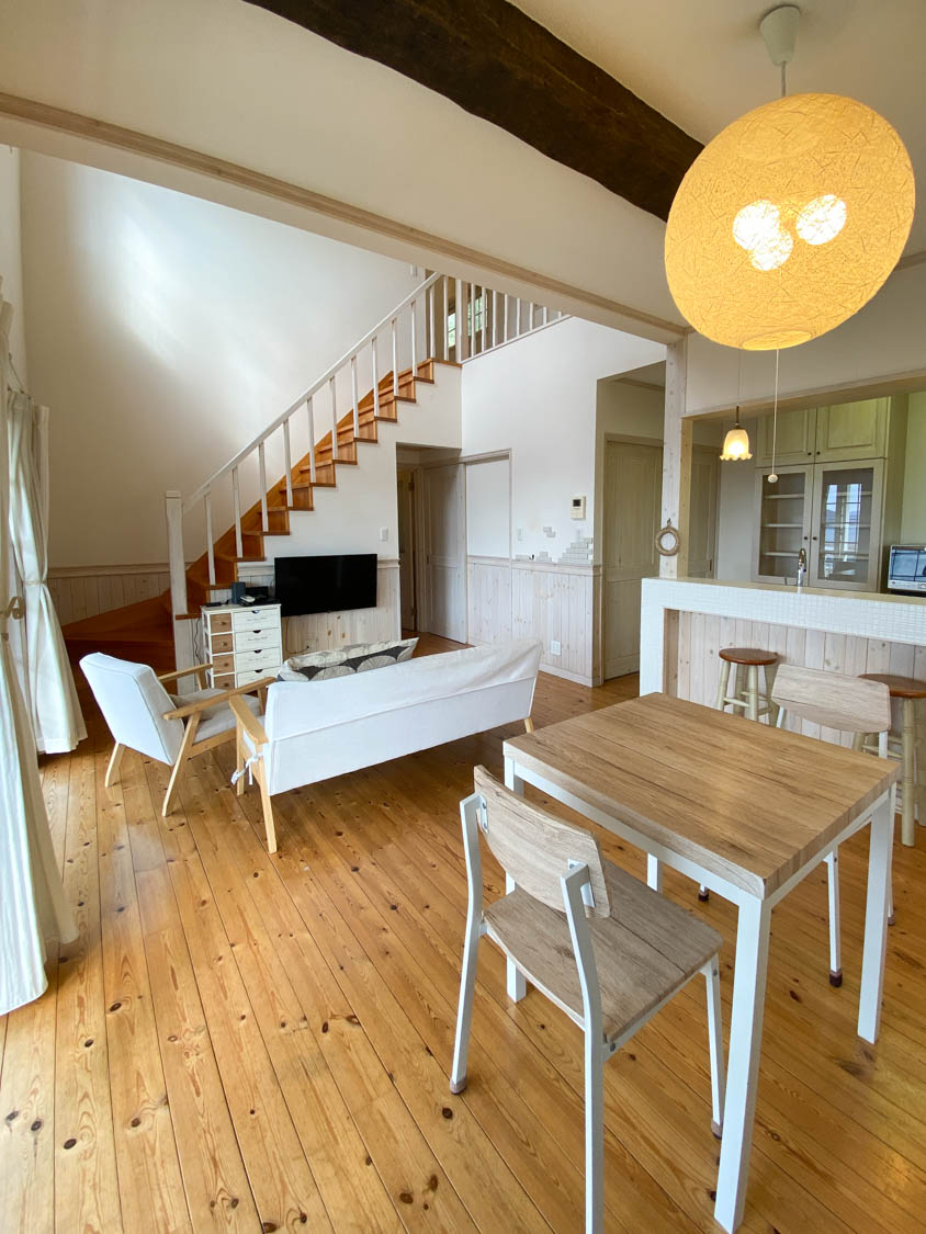 床板には温かみのある色合いの無垢材が使われています。室内はホワイトを基調にまとめられていました。