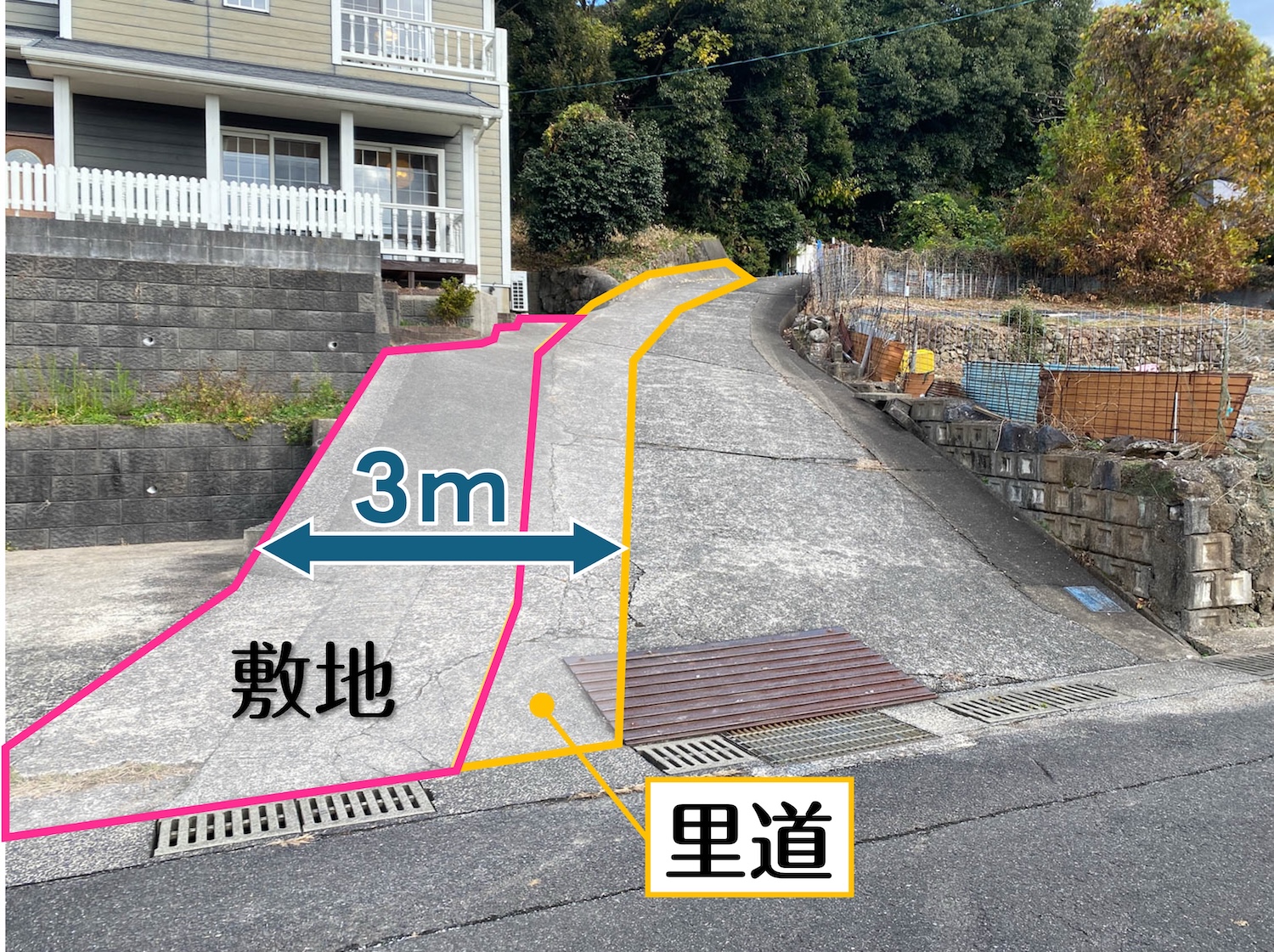 ピンクの部分は今回の敷地、黄色の部分は里道になって、合わせると3mほどの幅がありました。残りの部分は第三者の所有地になっています。(※写真内の境界線は大まかなラインになります。)