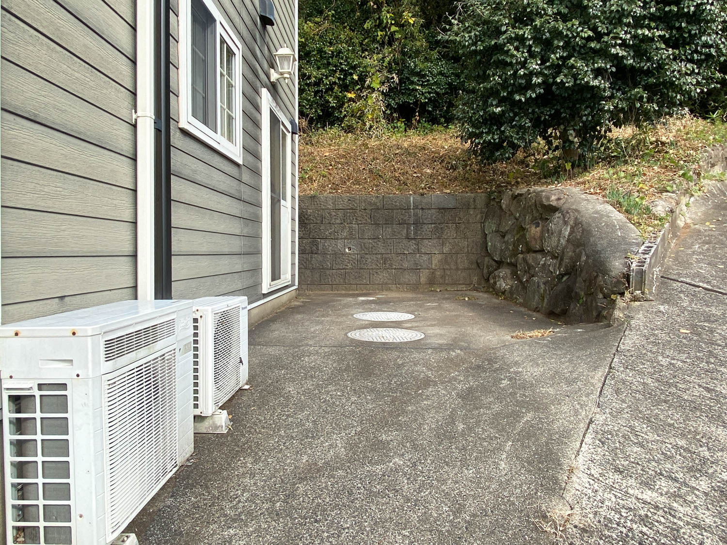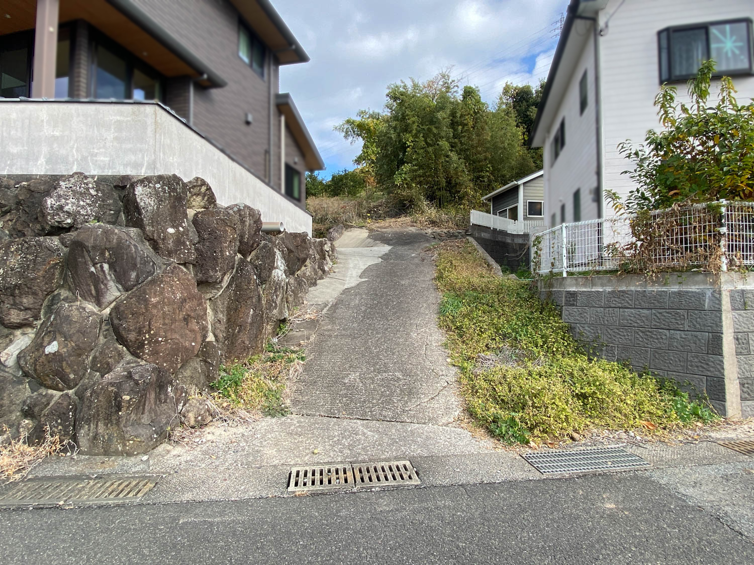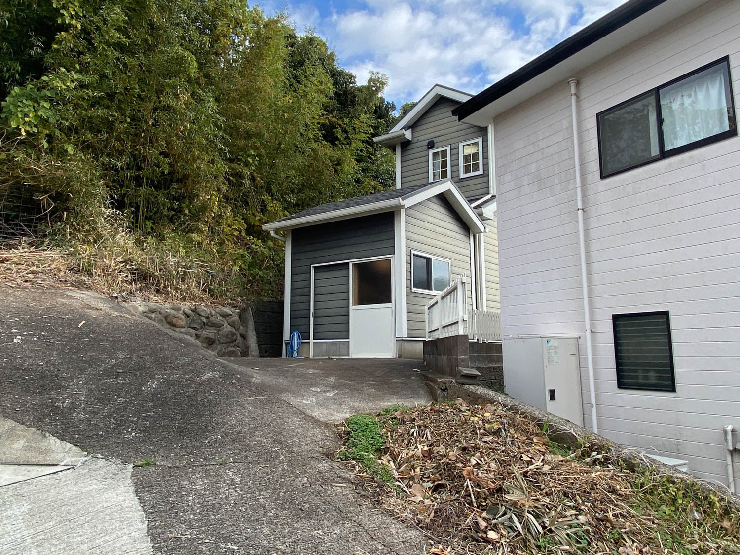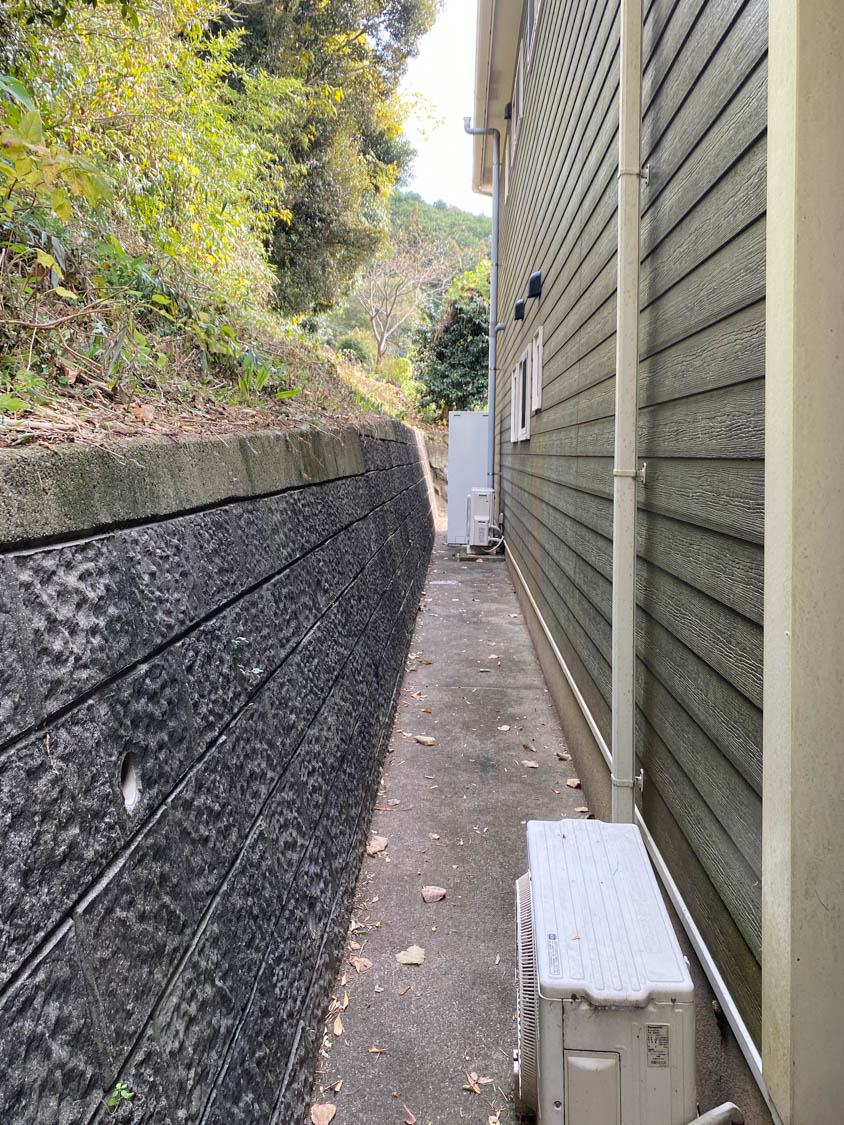 西側の通路の様子。坂を登った先にガレージがあります。
