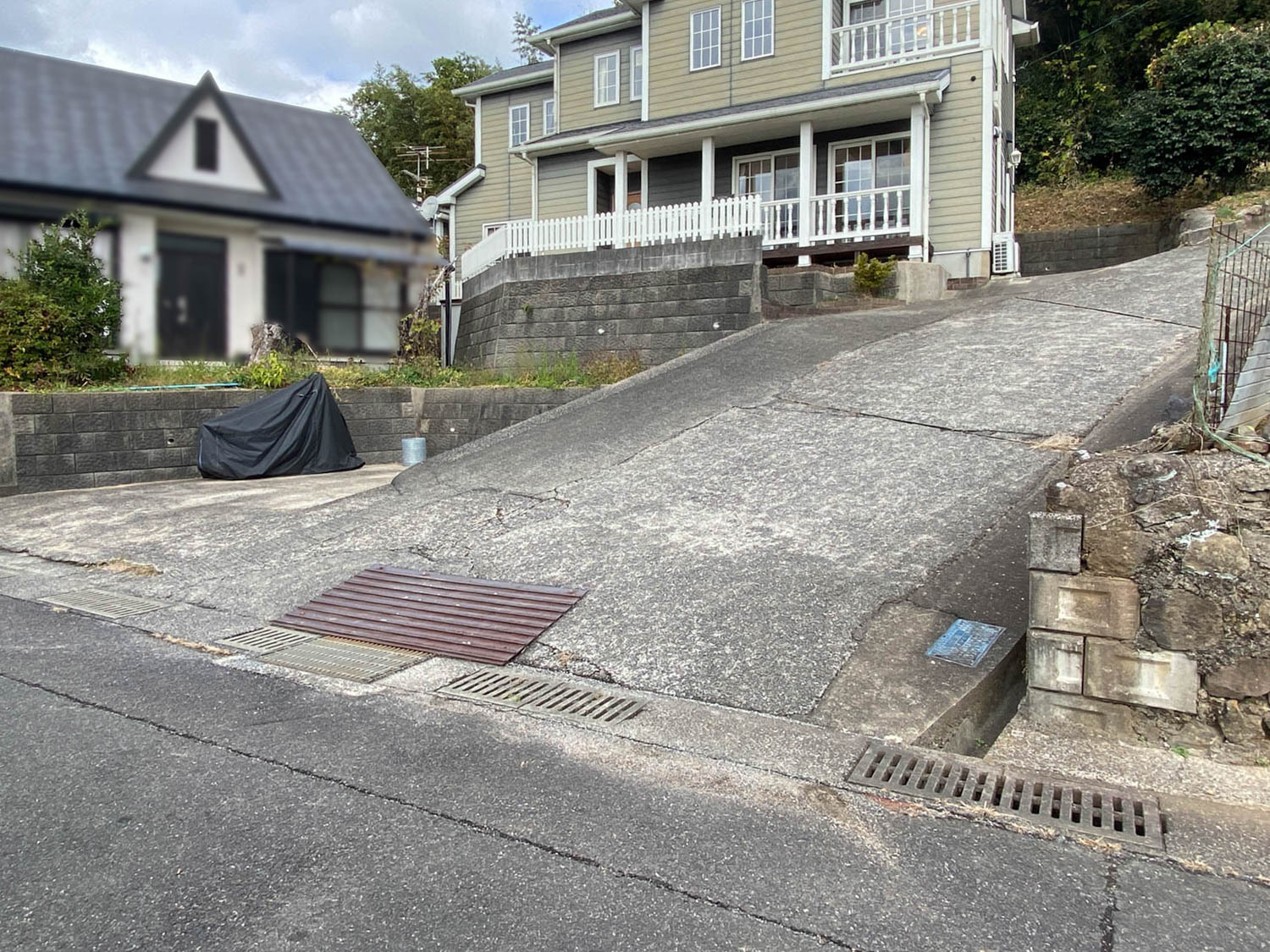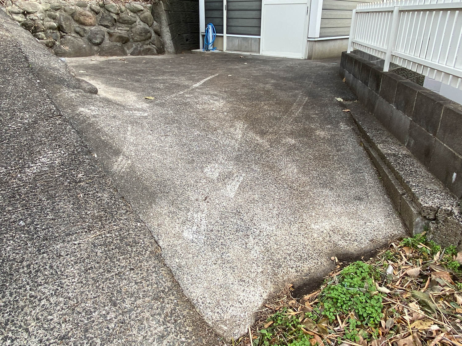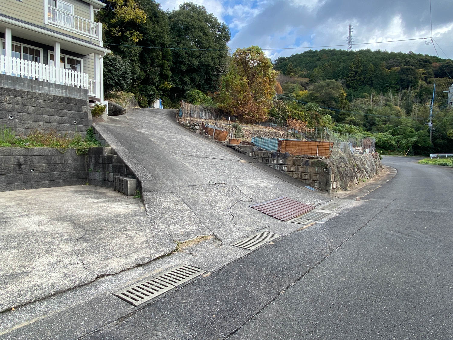 西側の通路の様子。坂を登った先にガレージがあります。
