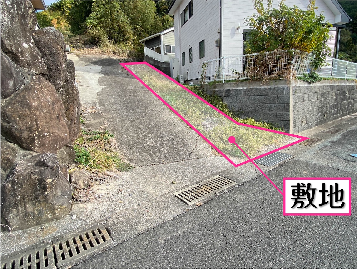 ピンクで囲っている部分が敷地で、残りの部分は第三者の私有地になっています。草が生えている部分は、1.3mほどの幅がありました。