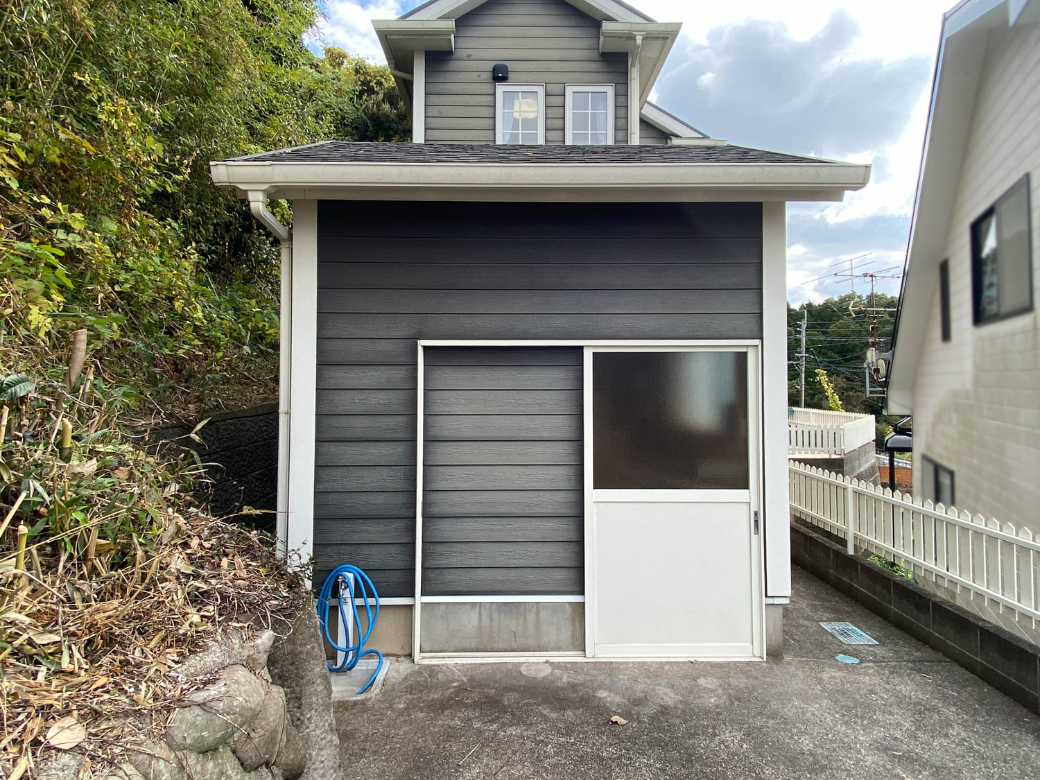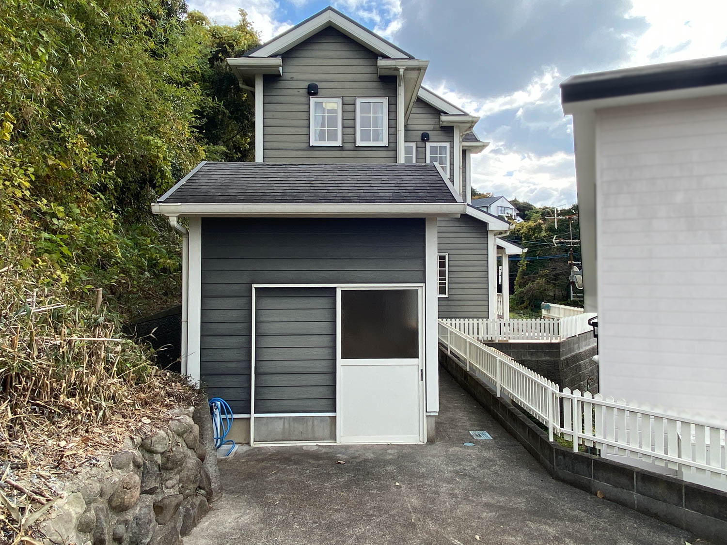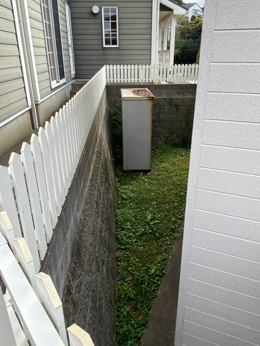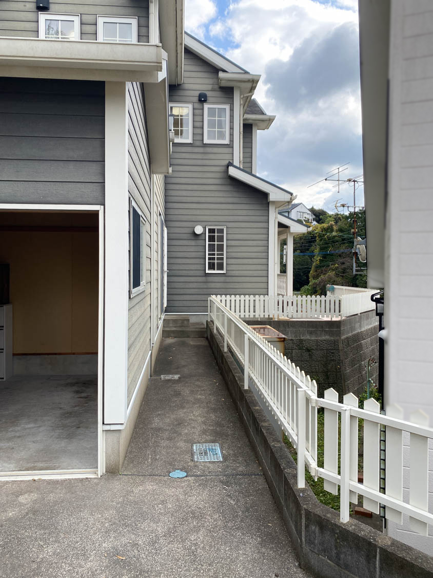 通路幅は75cmほどで、隣との高低差もありますが柵が設置されているので安心です。通路を抜けた先にはガレージがありました。