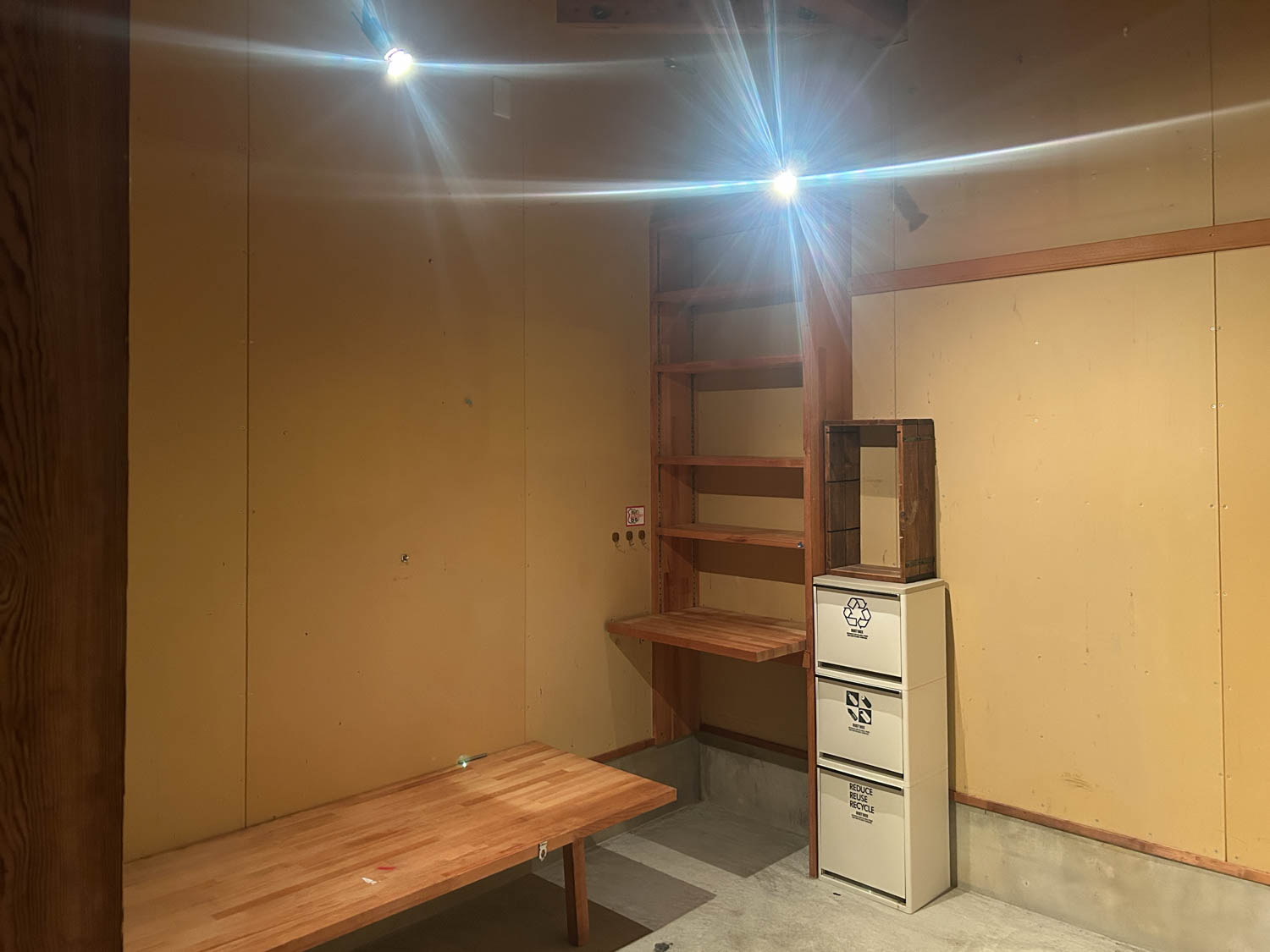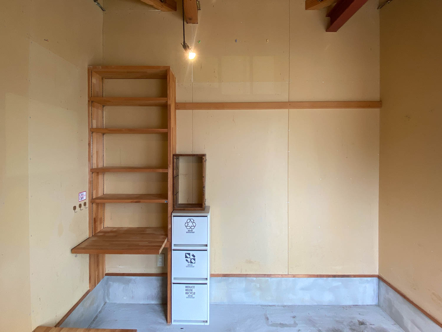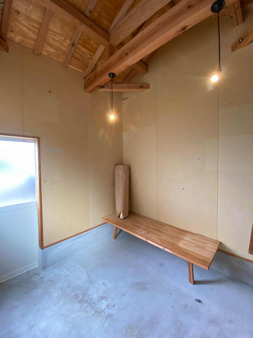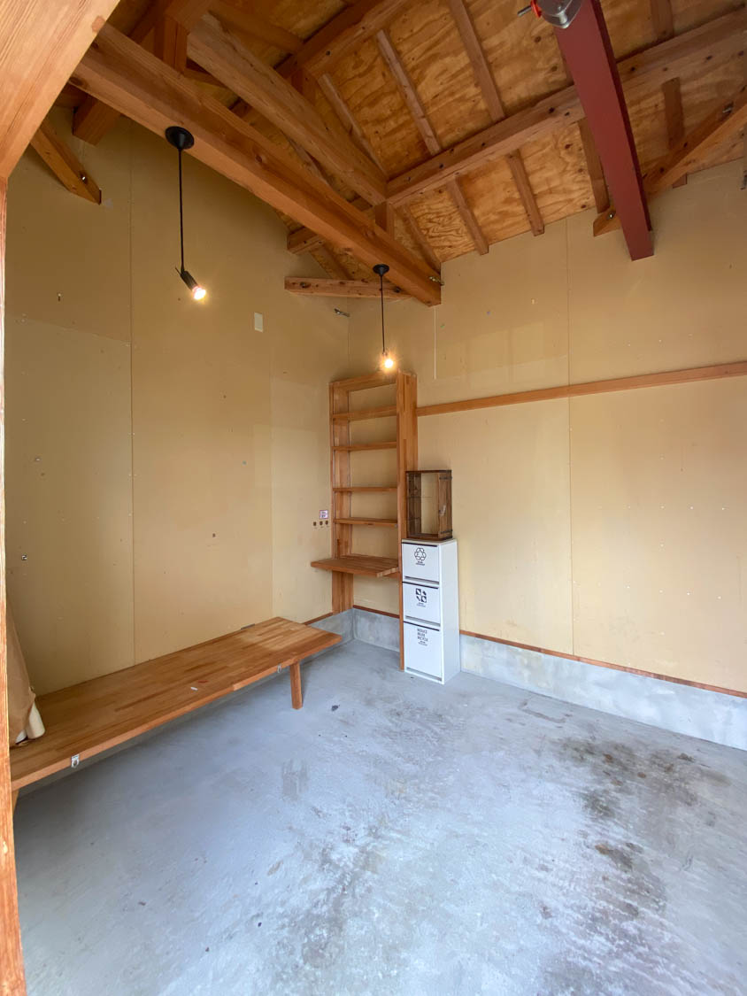 全体的に木材と石膏ボードで仕上げられたガレージ。2.7m×2.7mほどの広さがあり、作業するのにちょうど良いサイズ感でした。(※写真は広角撮影のため、空間が実際より広めに感じられることがあります。)