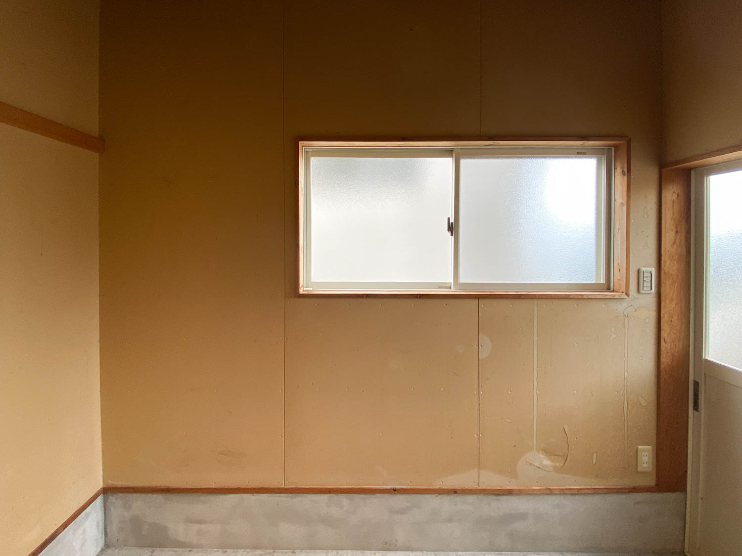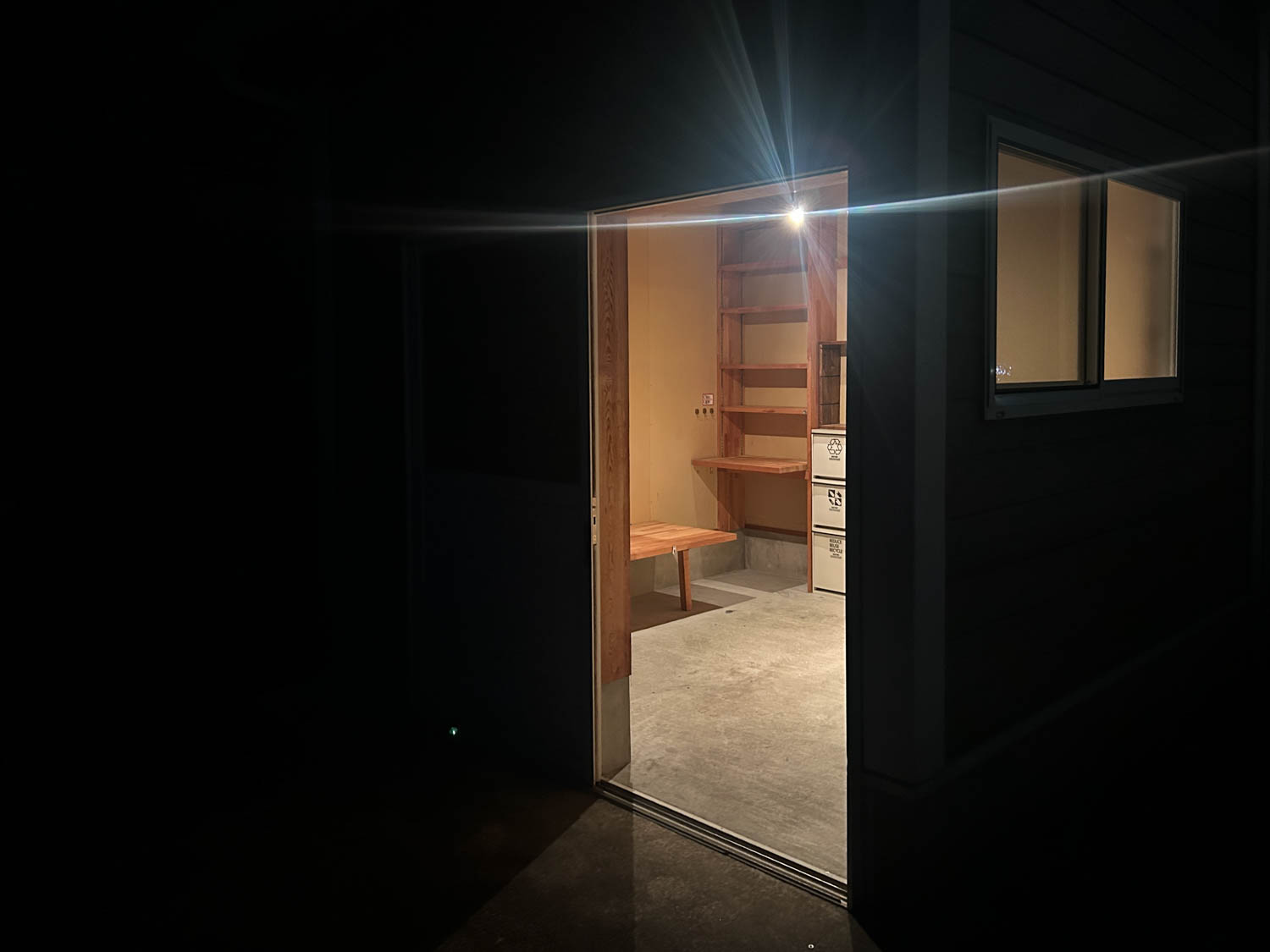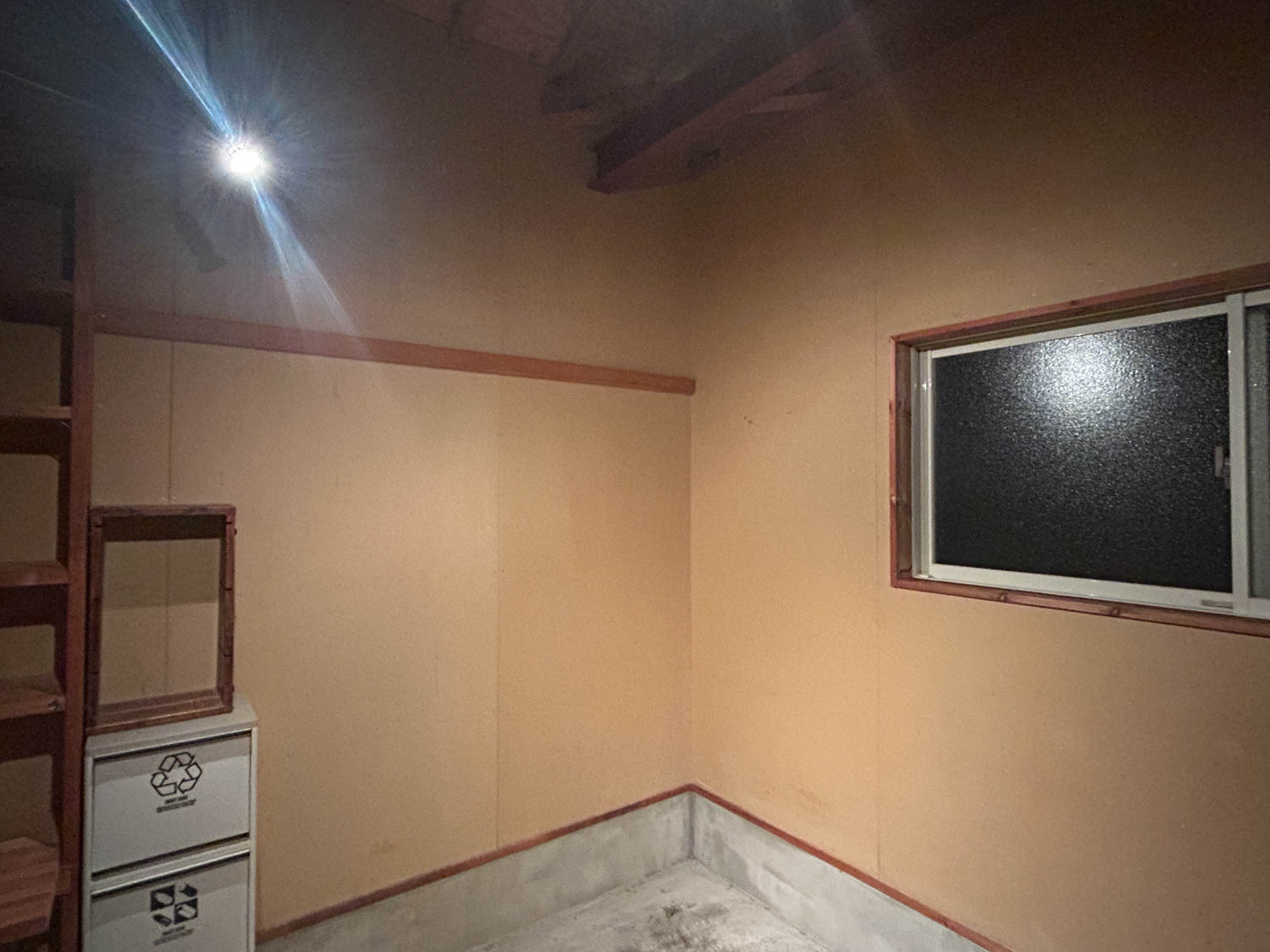 全体的に木材と石膏ボードで仕上げられたガレージ。2.7m×2.7mほどの広さがあり、作業するのにちょうど良いサイズ感でした。(※写真は広角撮影のため、空間が実際より広めに感じられることがあります。)