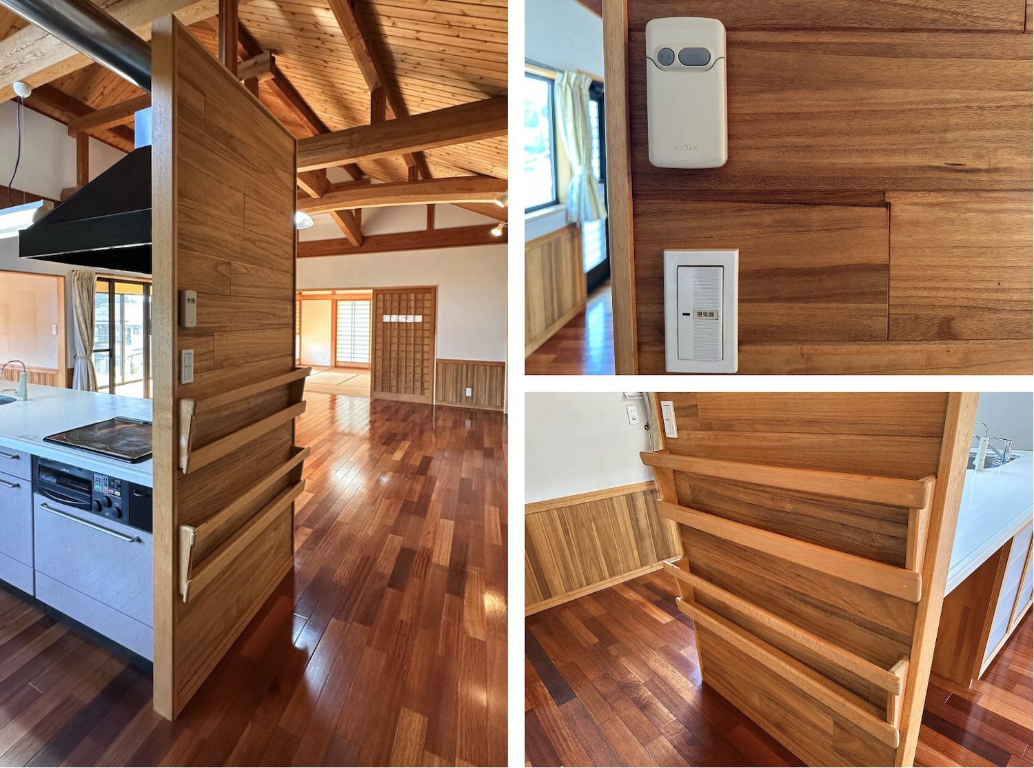 コンロ横の壁には、シーリングファンのリモコンと換気扇のスイッチ。そして、雑誌や新聞などが収納できるマガジンラックも備え付けられていました。