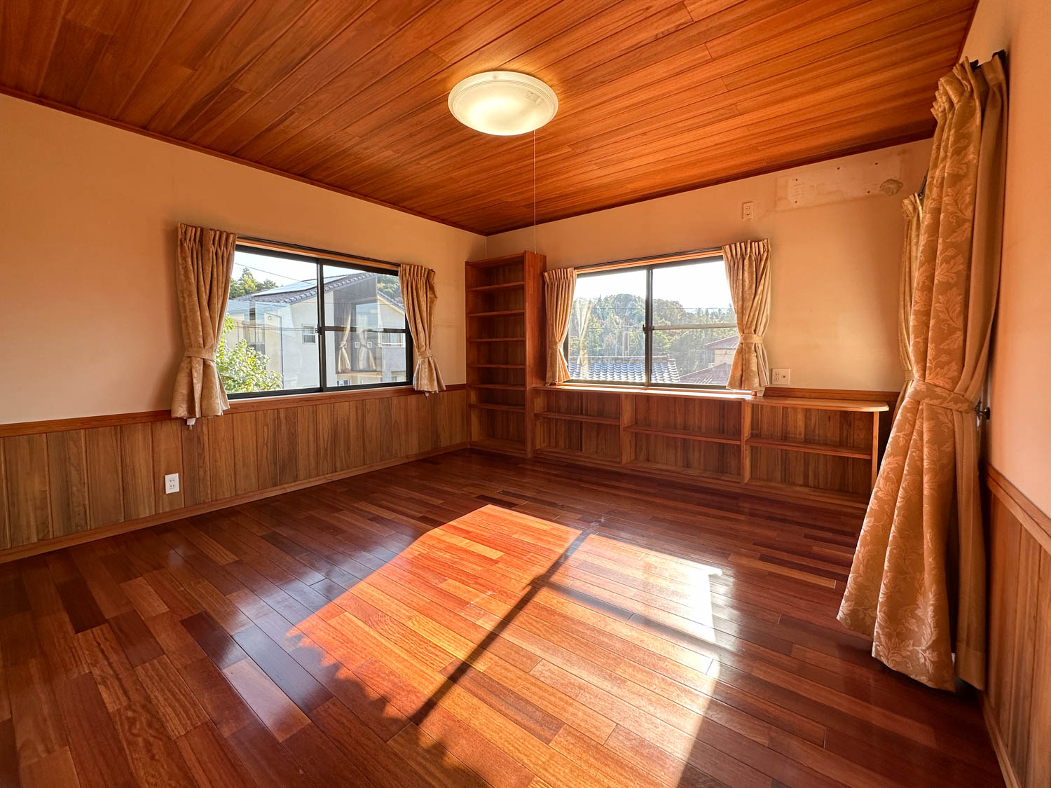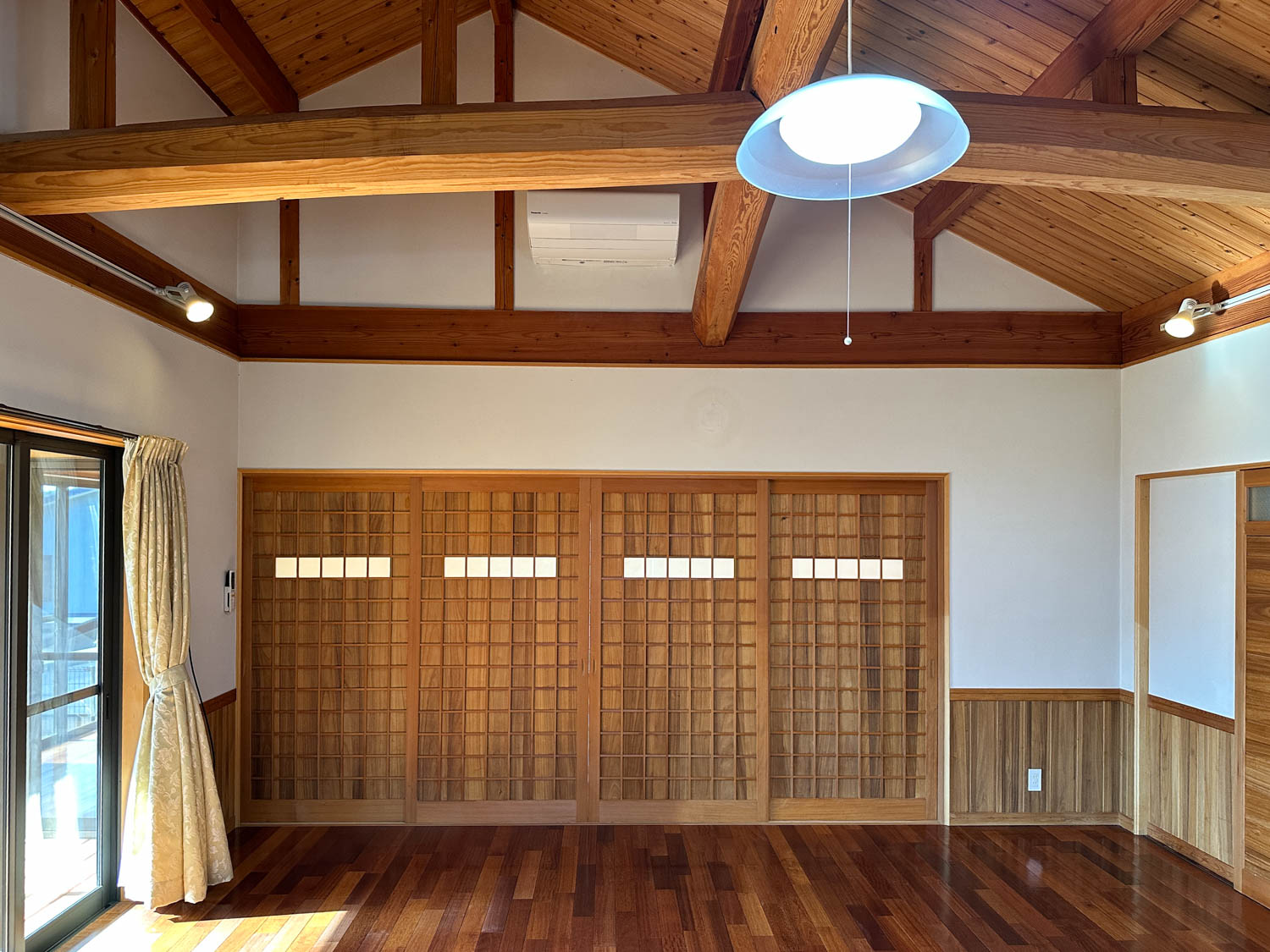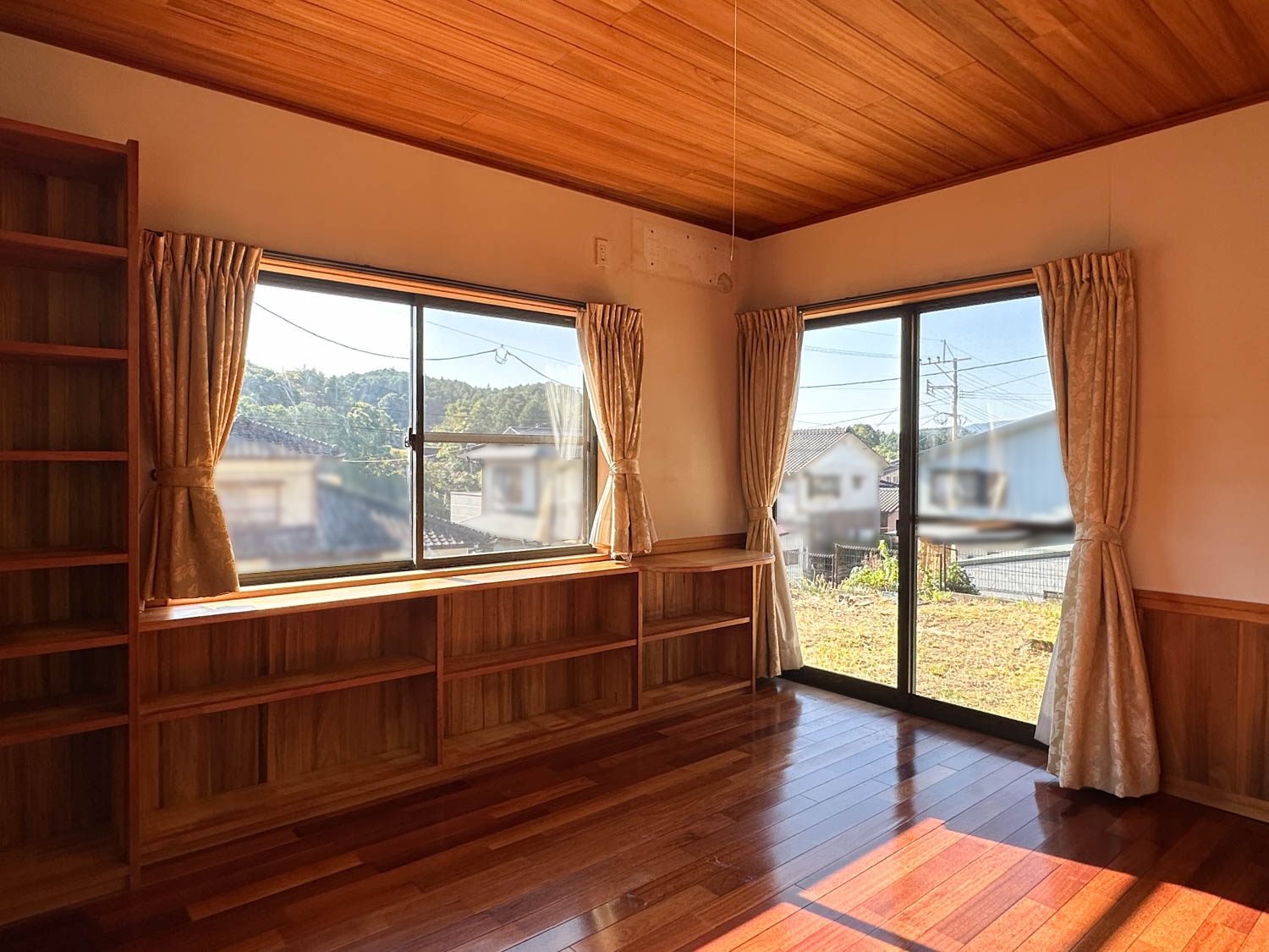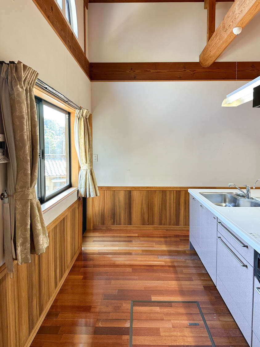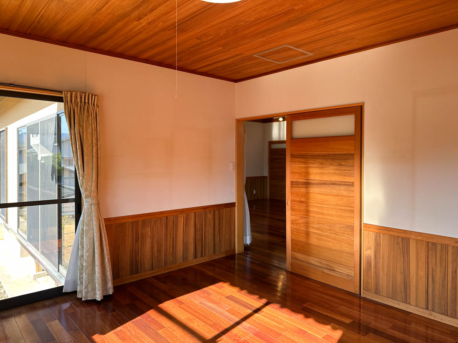 天井や床もしっかりとした木材で仕上げられていて、細部にまで職人さん達のこだわりを感じます。サッシの溝なども綺麗な状態でした。一部、エアコンを取り外された跡が残っています。