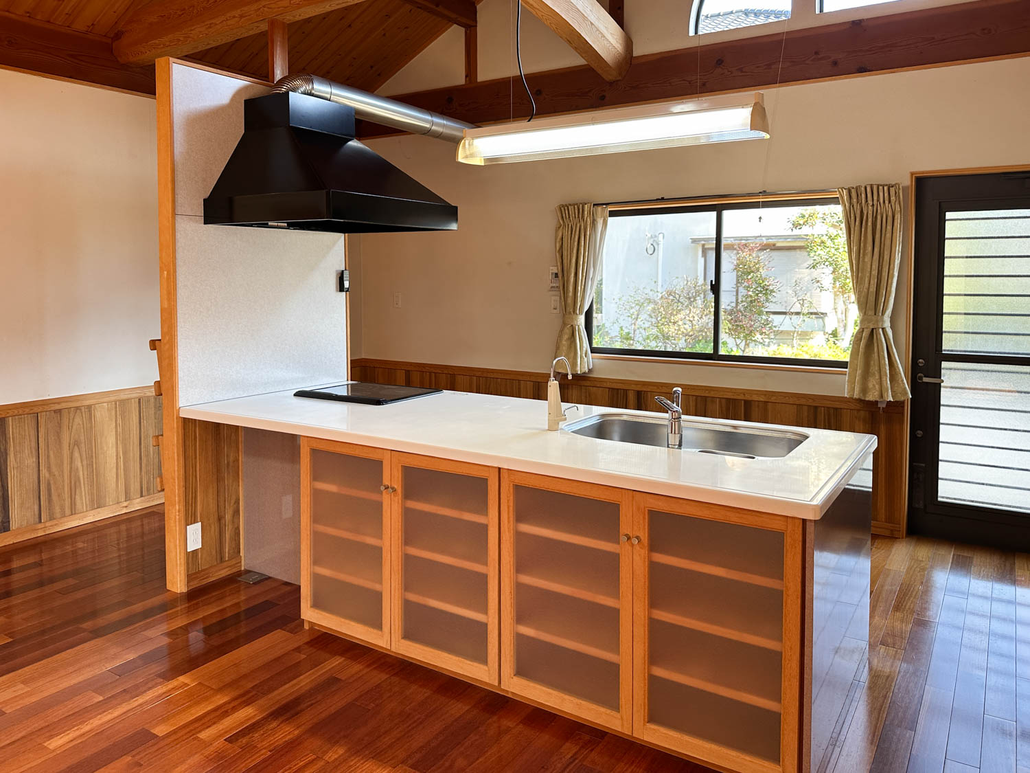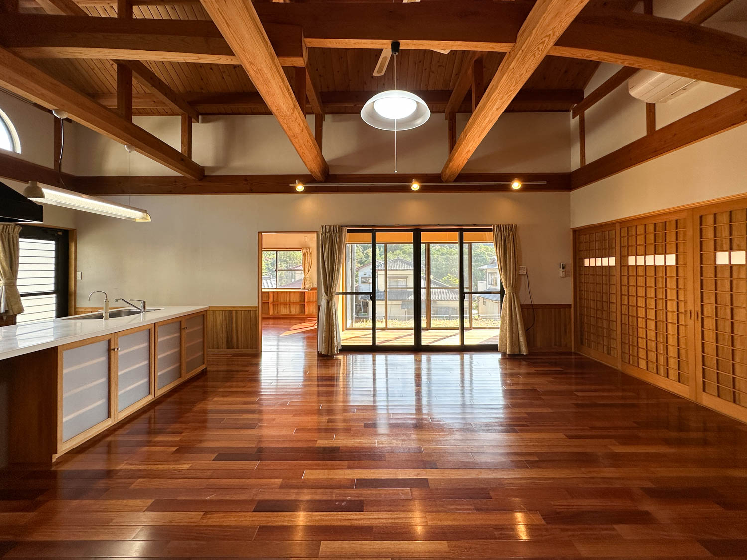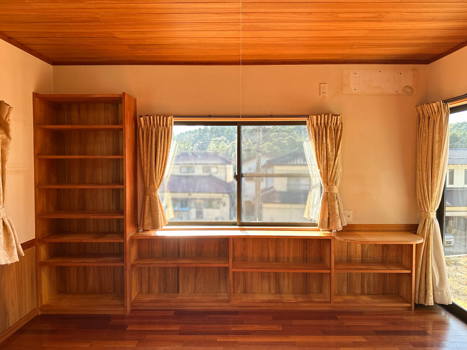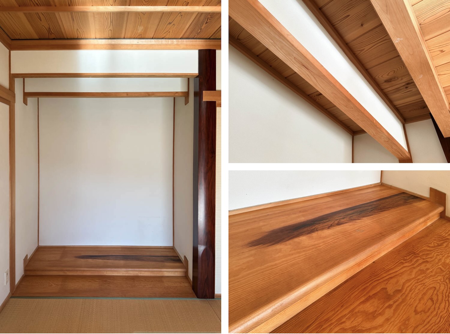 天井や床もしっかりとした木材で仕上げられていて、細部にまで職人さん達のこだわりを感じます。サッシの溝なども綺麗な状態でした。一部、エアコンを取り外された跡が残っています。