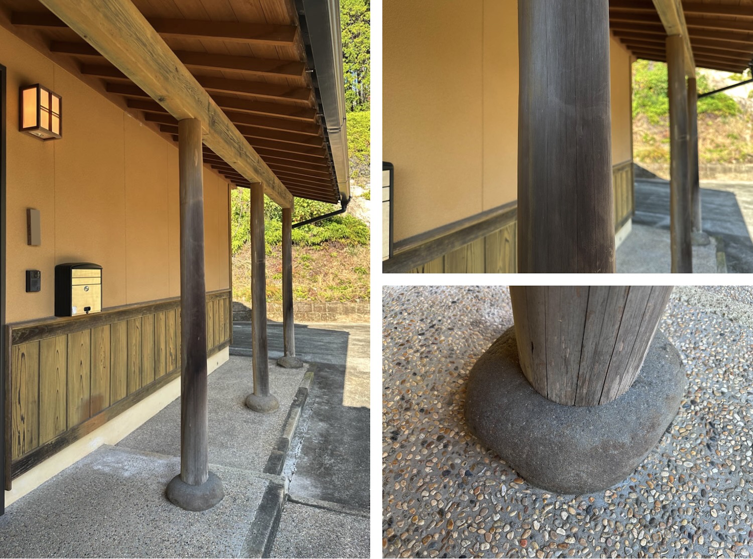 洗い出しの土間や礎石など、和風住宅には欠かせないアイテムたち。屋根付きのアプローチなので雨の日も安心です。