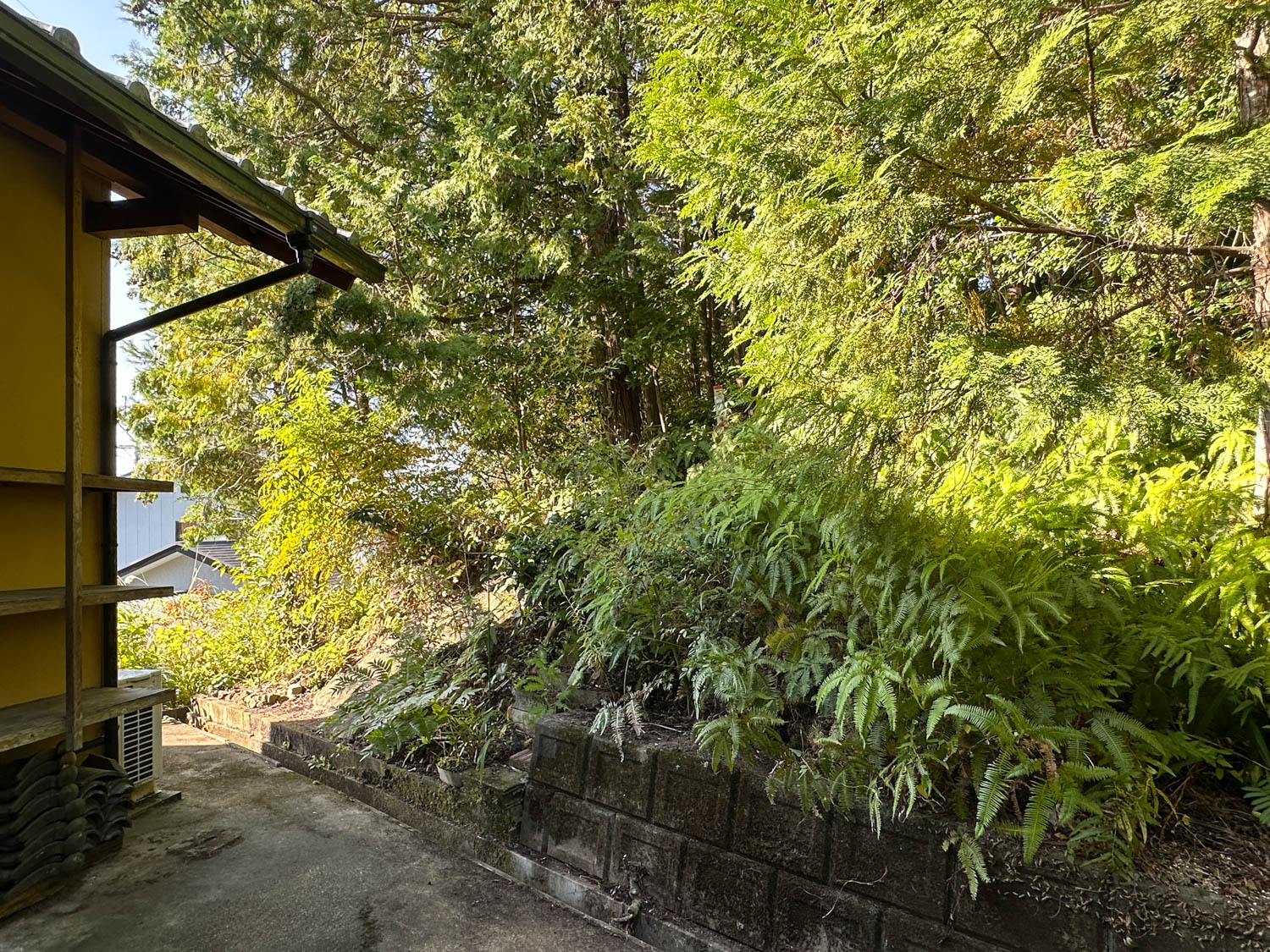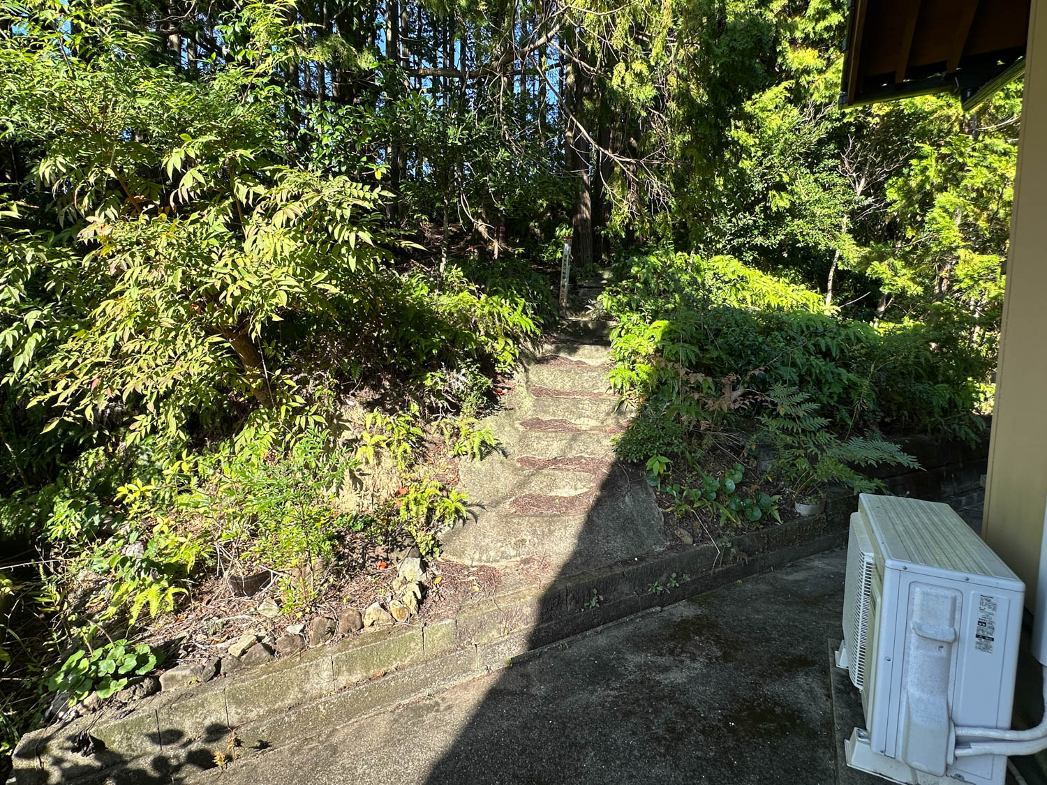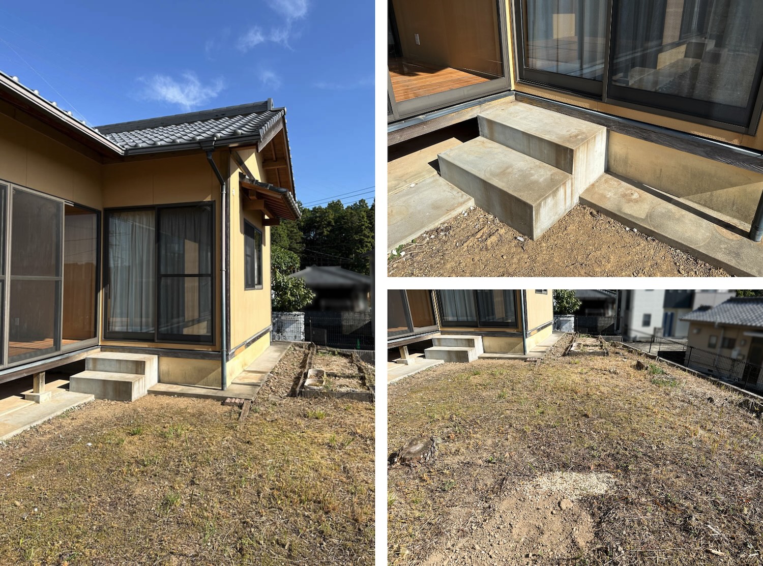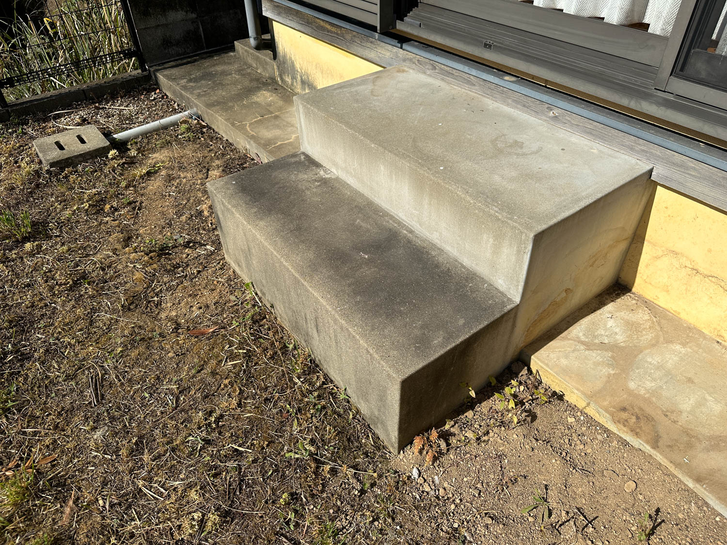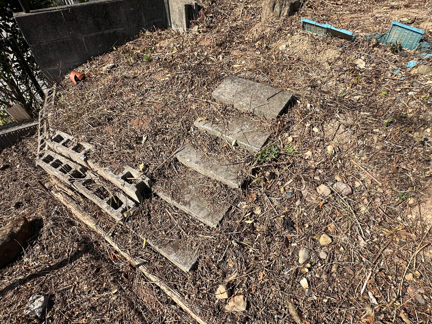 庭部分は道路側に向かって傾斜が付いていて、コンクリート製の階段なども置かれていました。