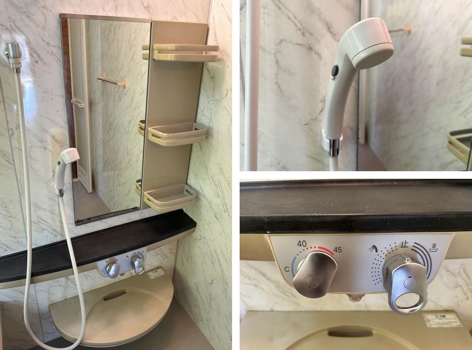 洗い場のシャワーには、手元止水機能が付いていました。