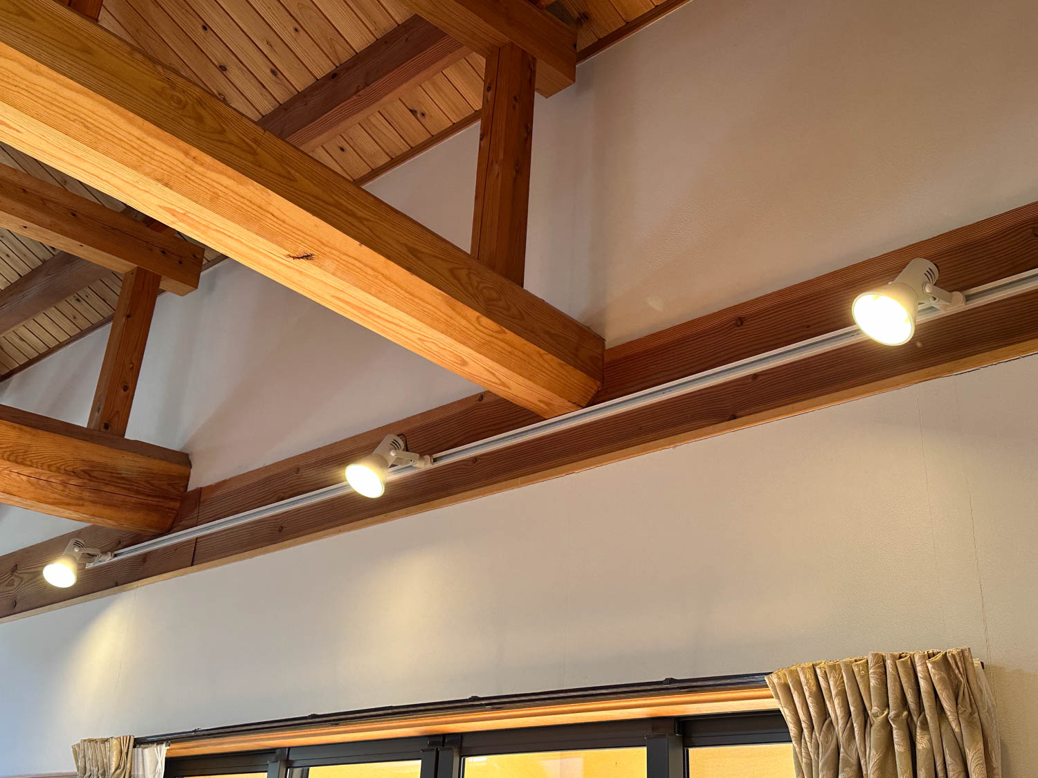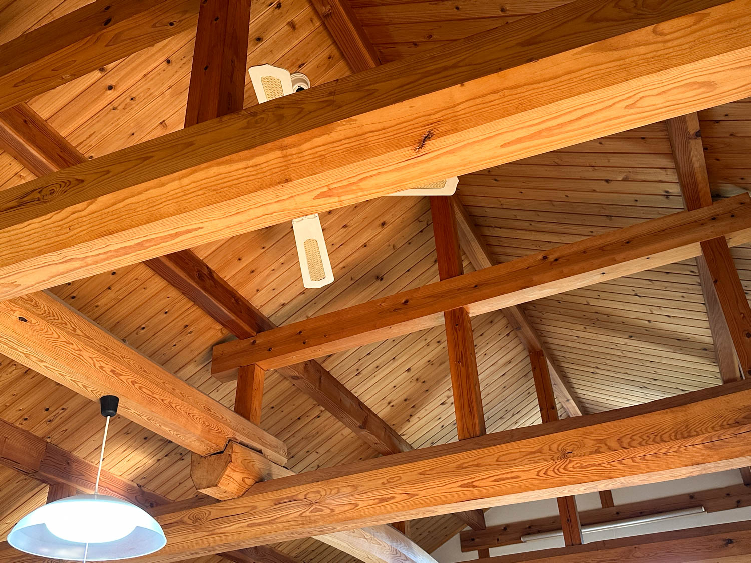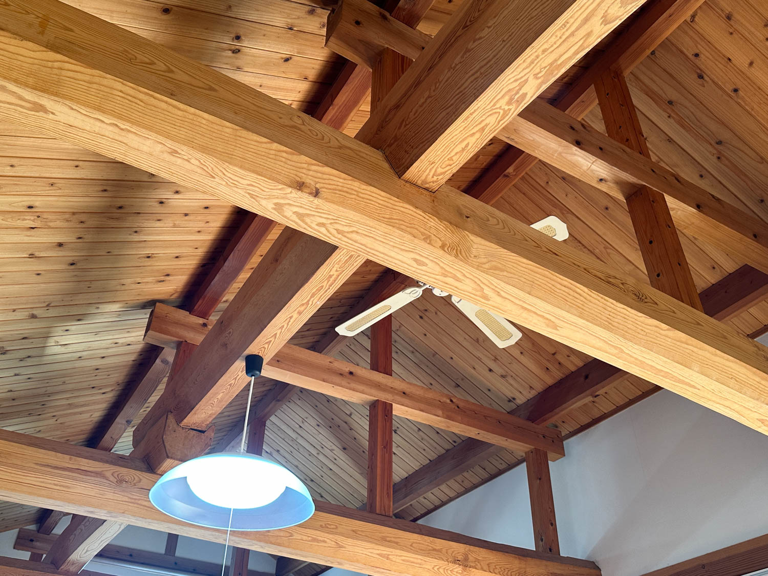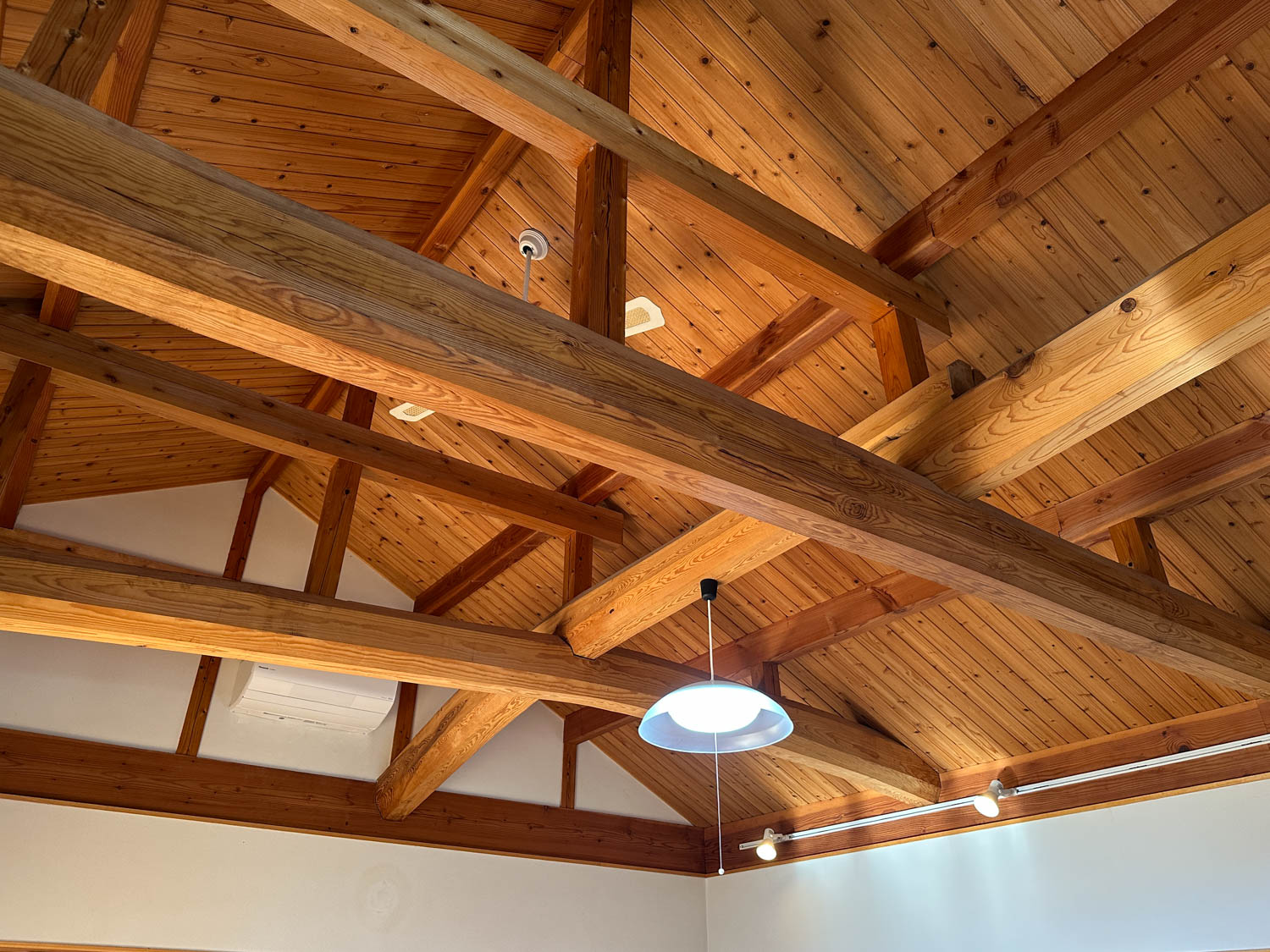 松の木でできた化粧梁に、板張りの勾配天井。