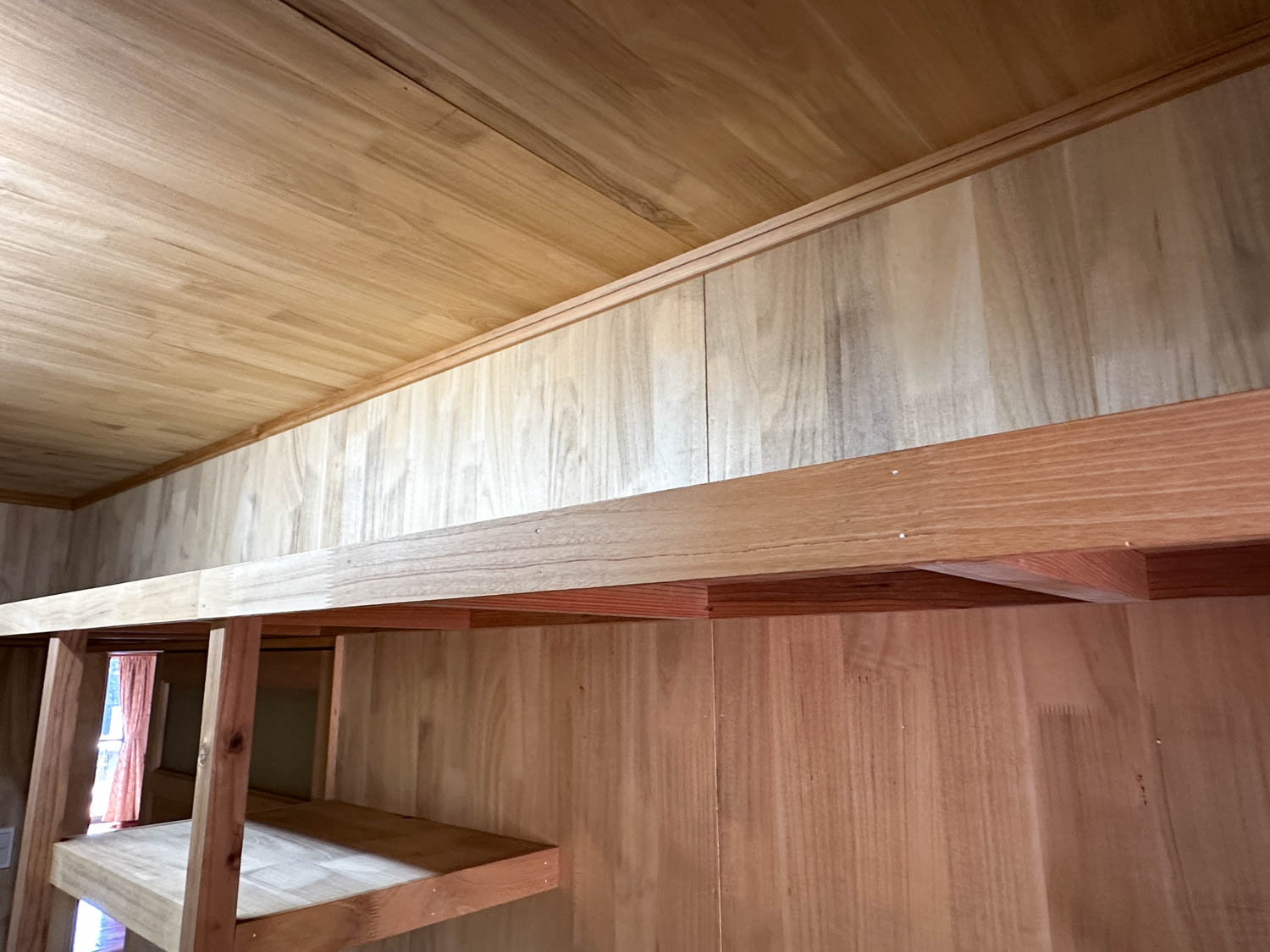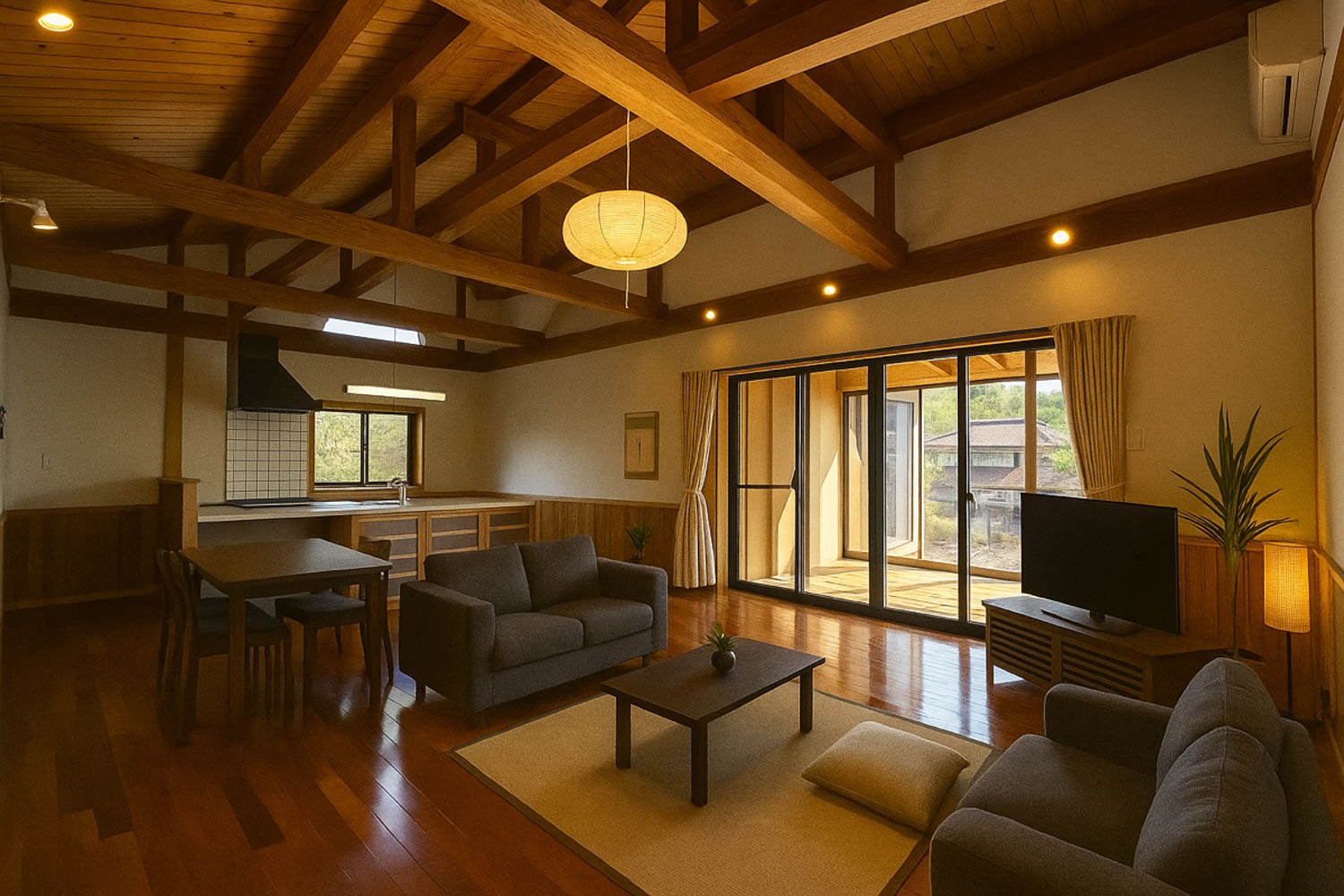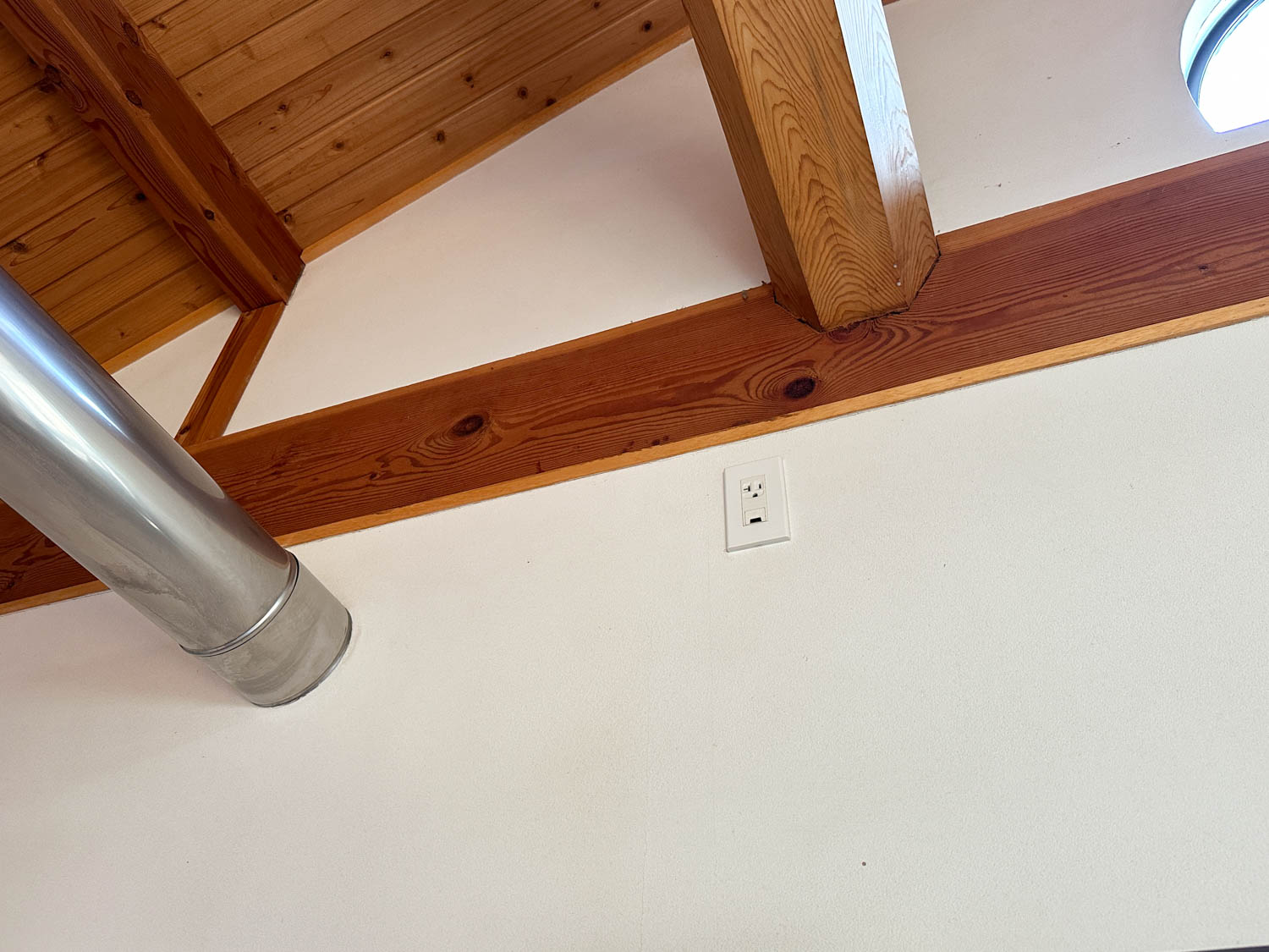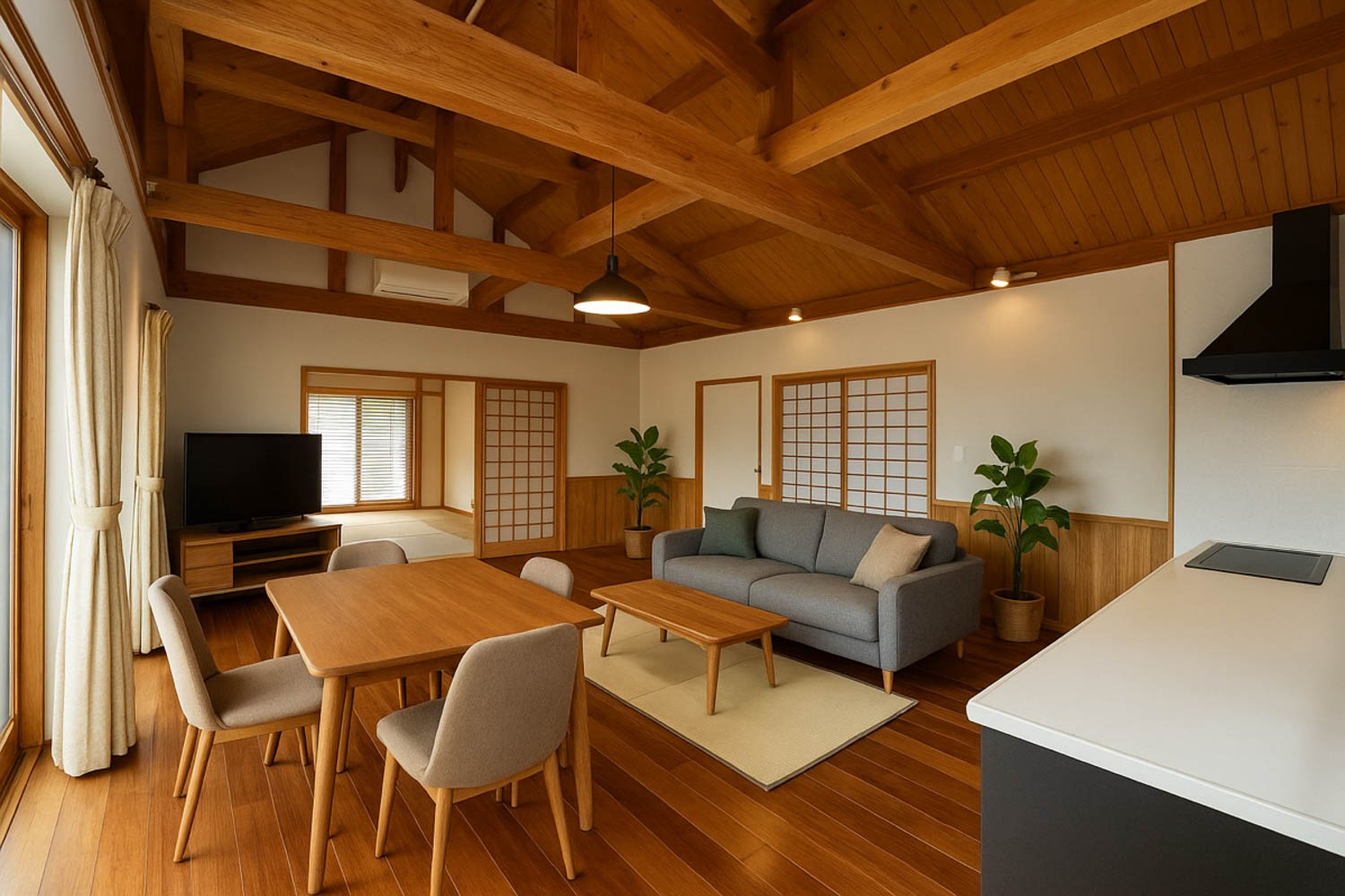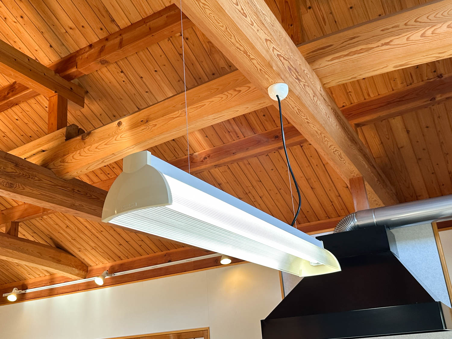 松の木でできた化粧梁に、板張りの勾配天井。