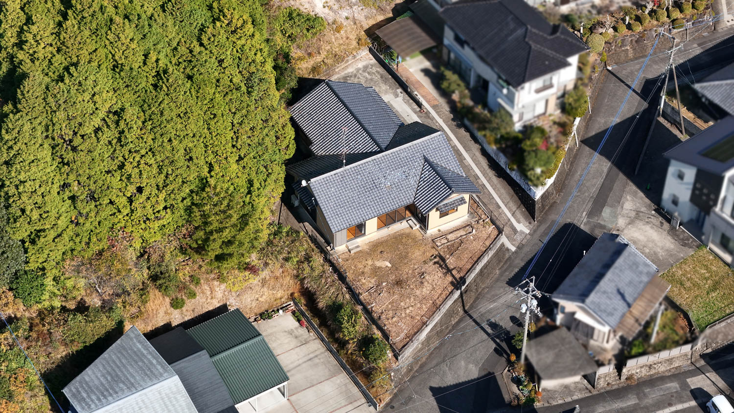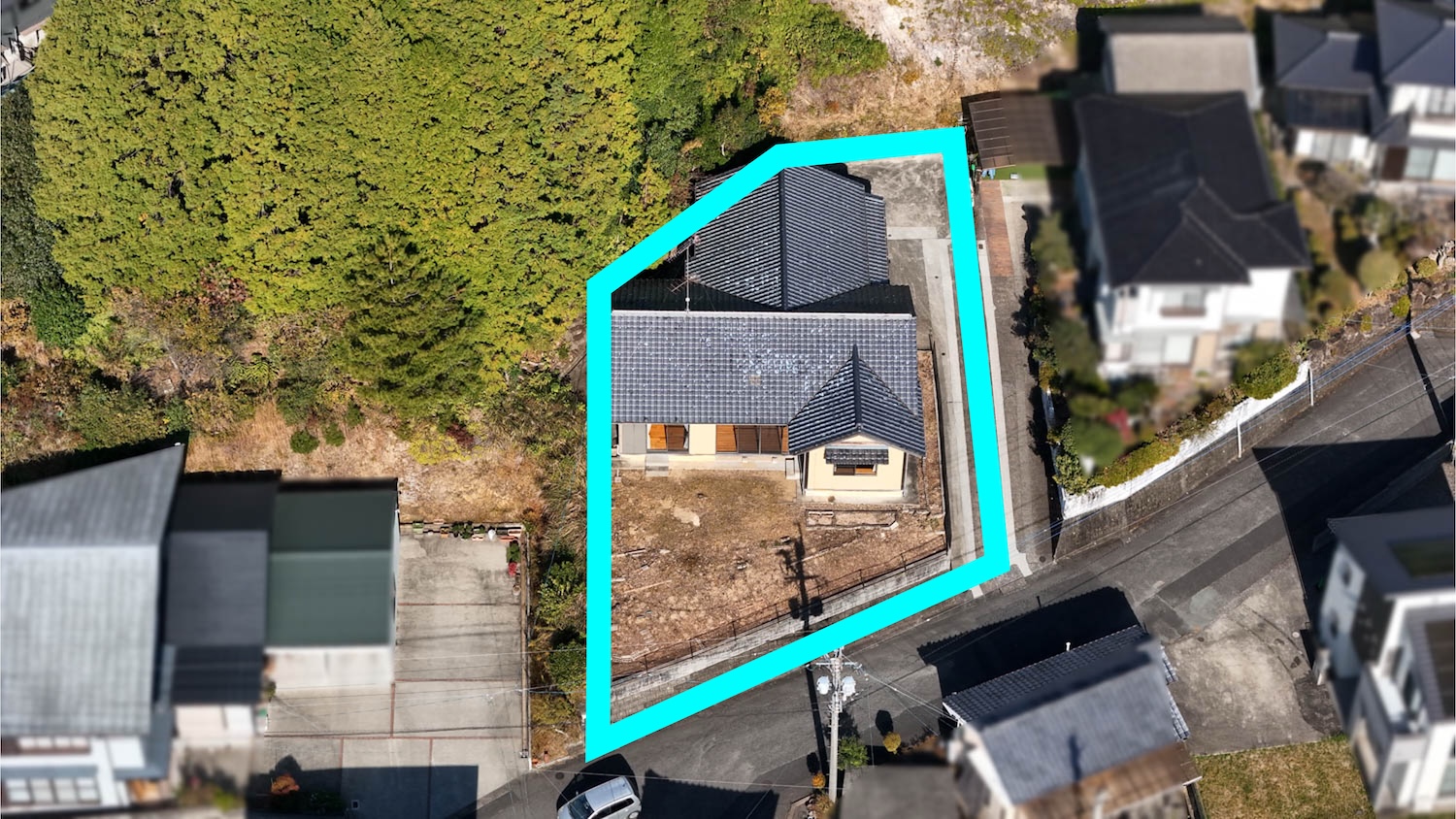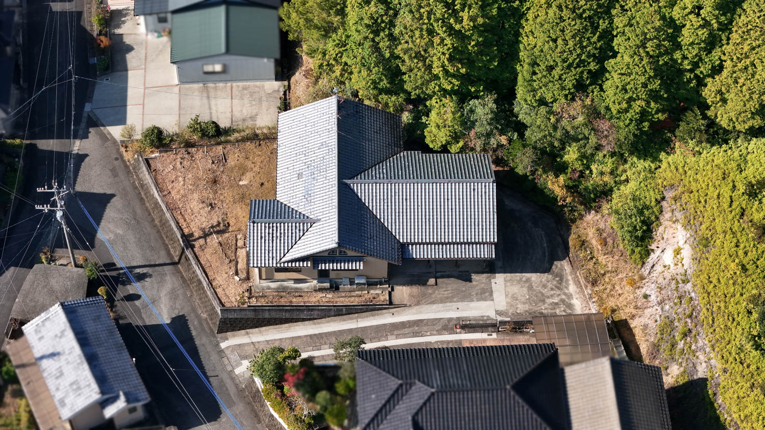 今回、宅地の他に裏の山林も付属します。水色の線で囲われている135坪ほどの部分が対象です。