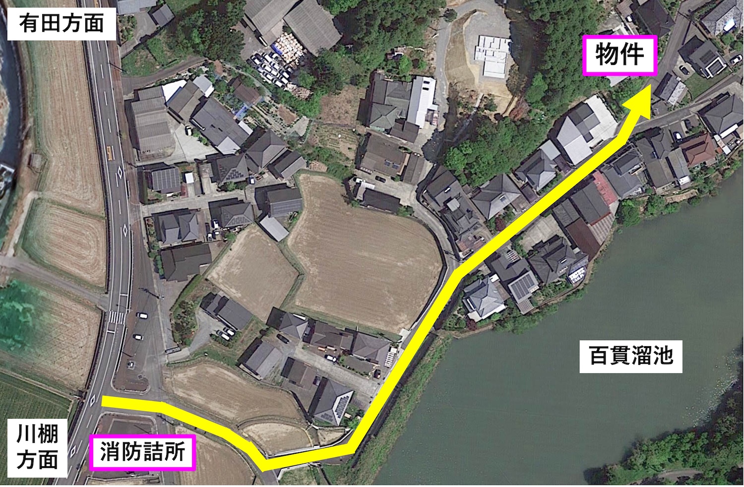縦に伸びる道路は県道107号線で、上が有田方面、下が川棚方面です。黄色の矢印に沿って物件まで進んでいきます。