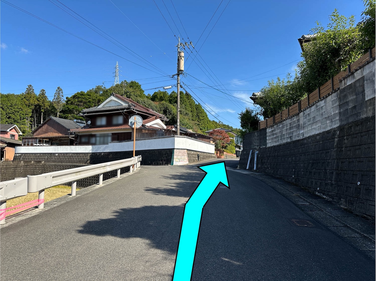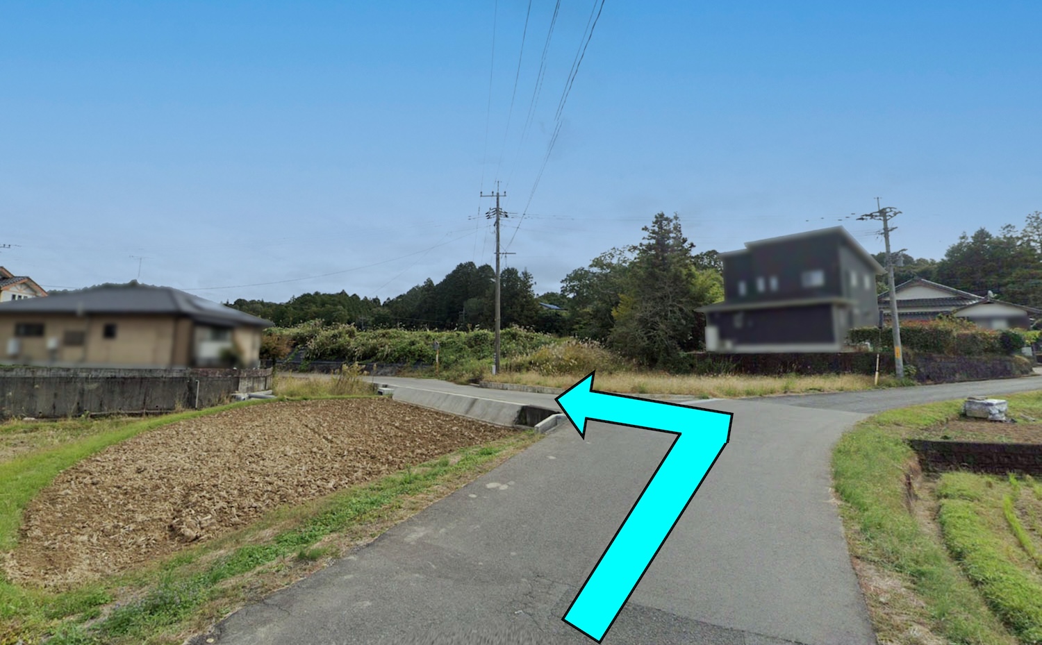1つ目のY字路を左に曲がり、そのまま真っ直ぐ。道幅が少し狭いので、ゆっくりと進みます。