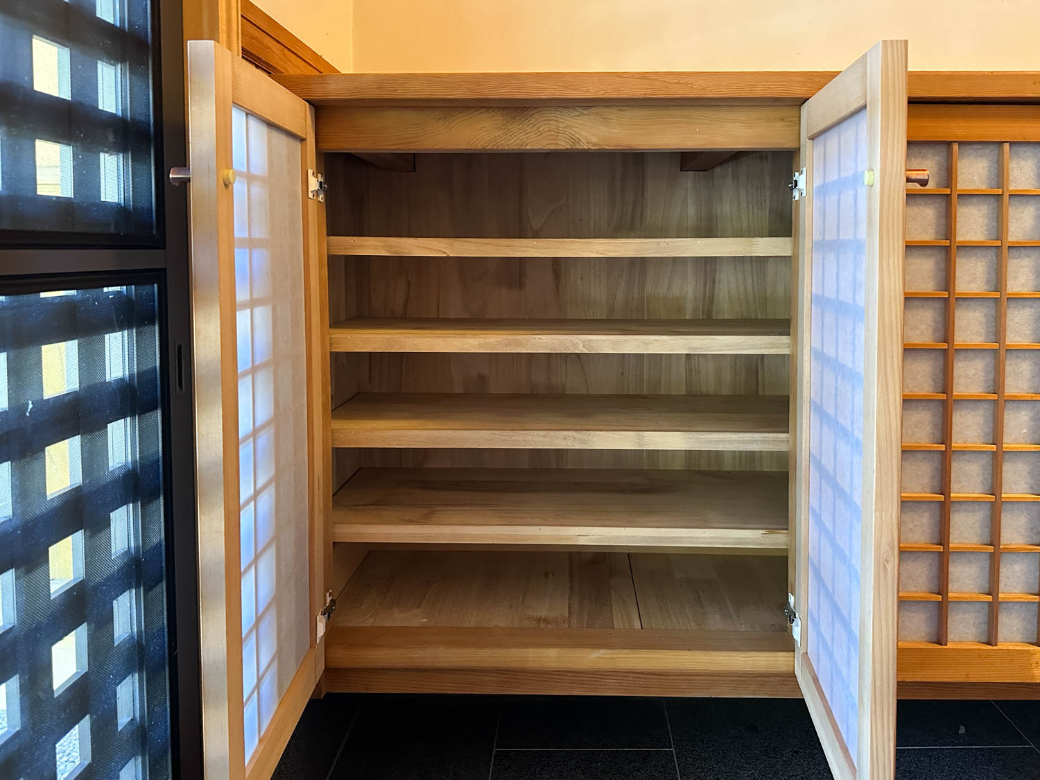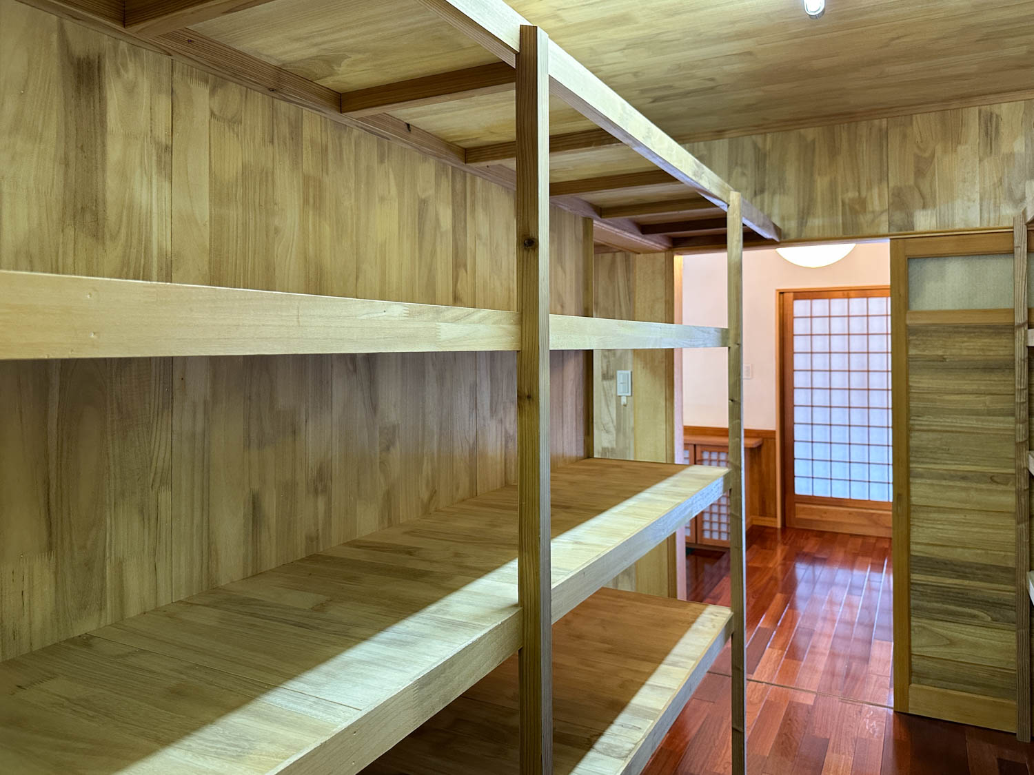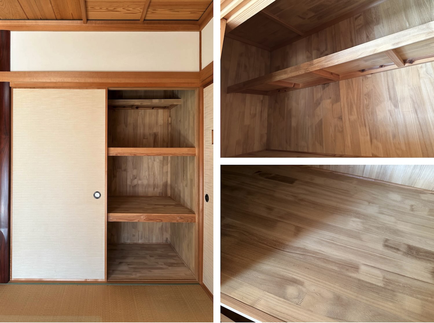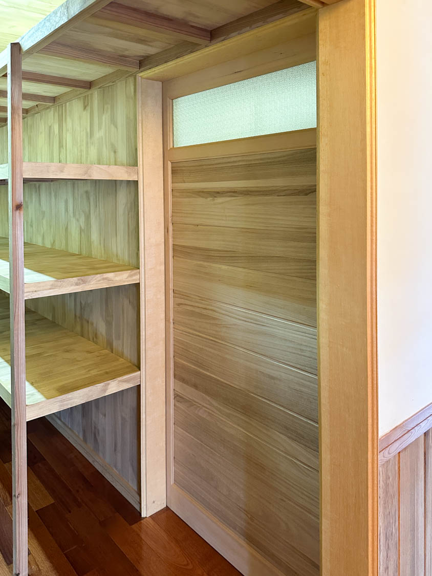 1畳ほどの押入れには3段の棚が設けられていて、ゲスト用の座布団やお布団をしまうのにちょうど良いつくりとなっています。