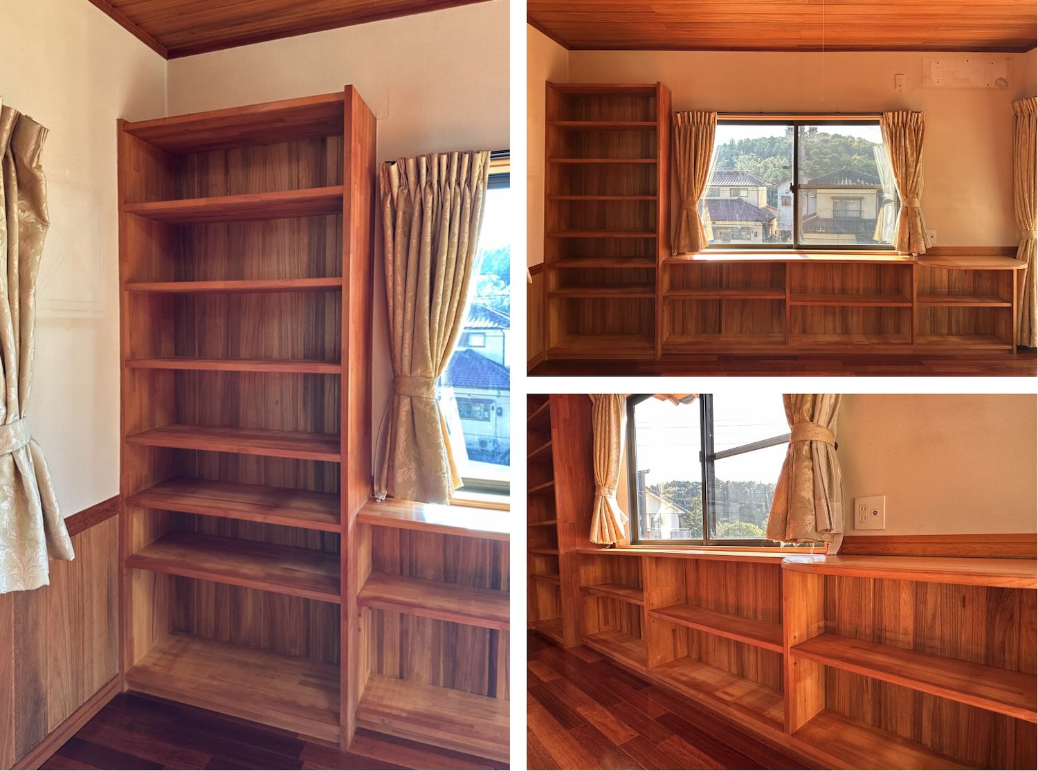 備え付けの本棚も素敵。背の低い方の棚は、棚の高さも調節できそうでした。