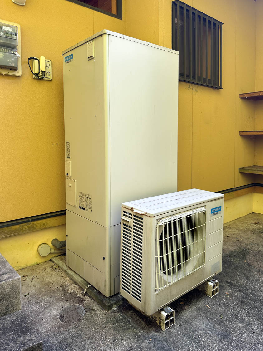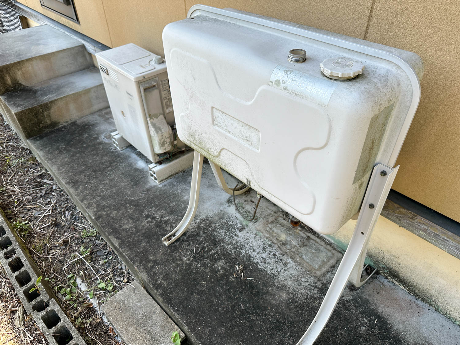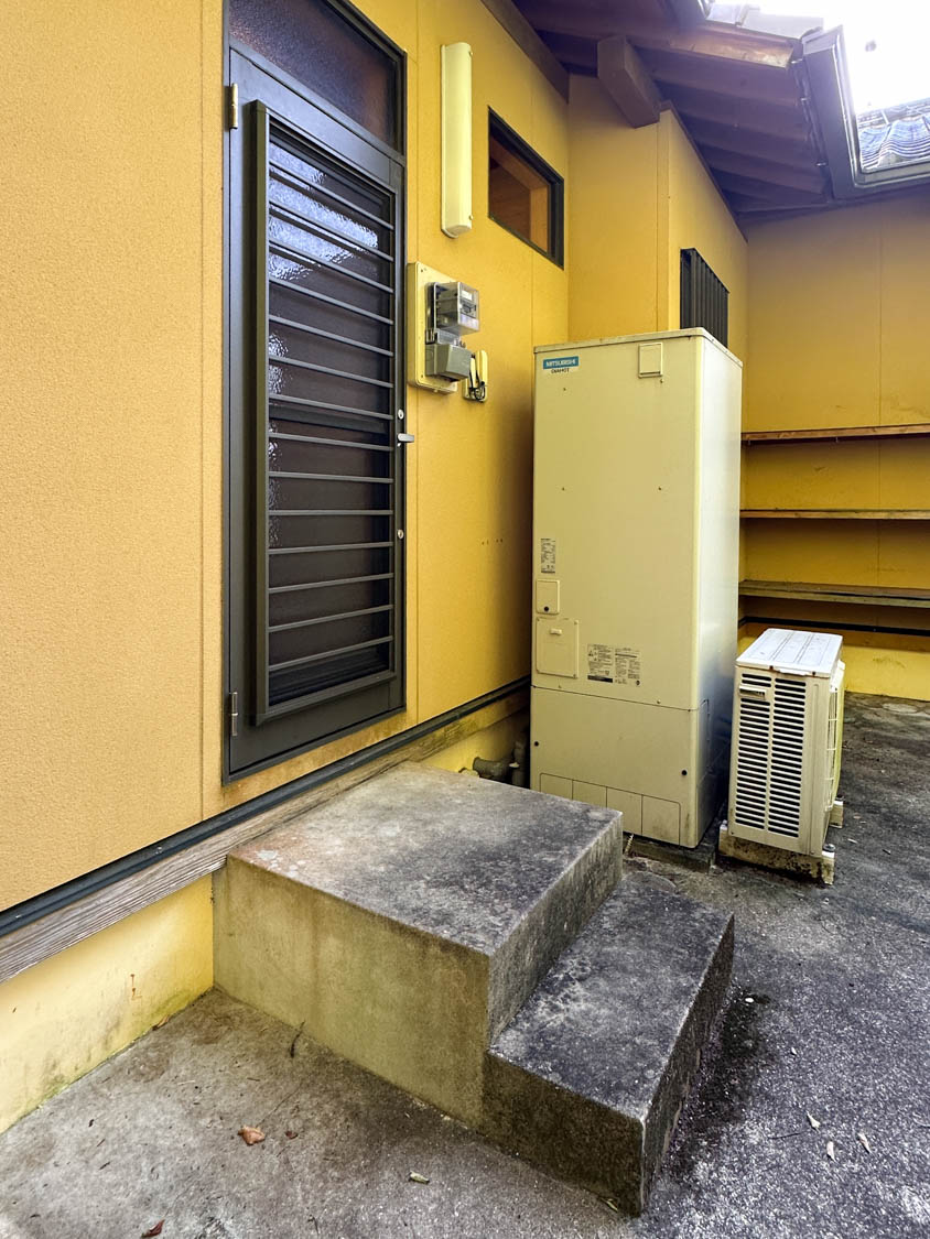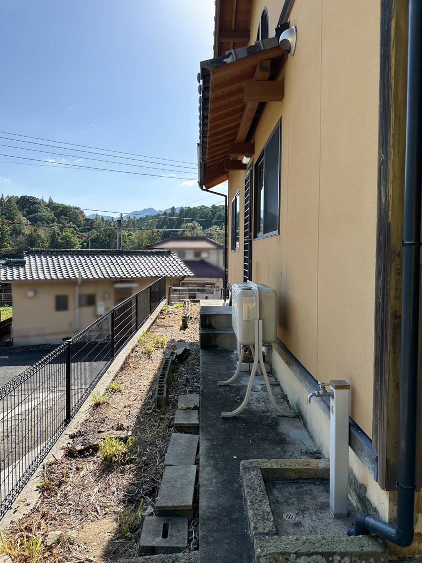 こちらには、以前使用されていた石油給湯器がそのまま置かれていました。現在はエコキュートが使用されています。3箇所目の屋外水栓も設置されていました。