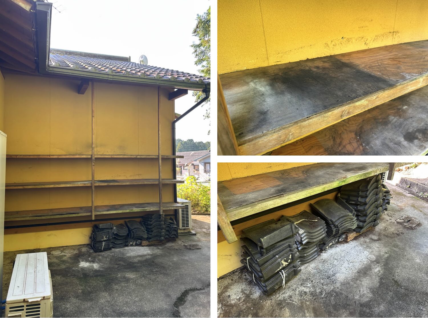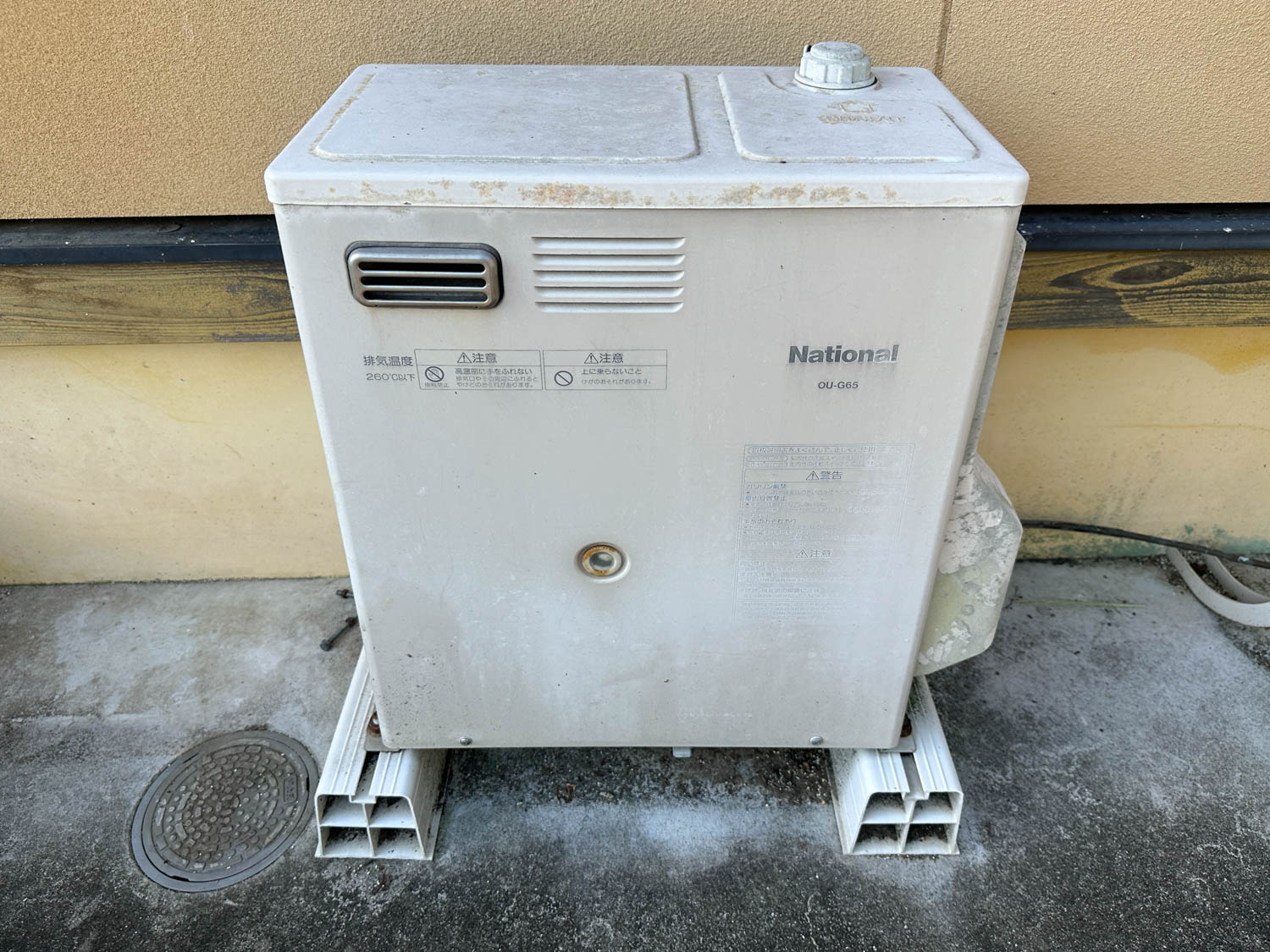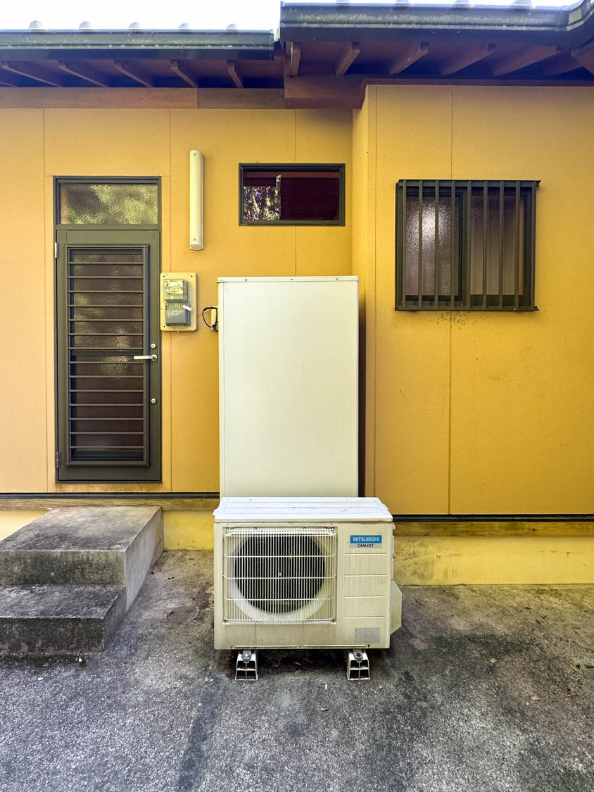 こちらには、以前使用されていた石油給湯器がそのまま置かれていました。現在はエコキュートが使用されています。3箇所目の屋外水栓も設置されていました。