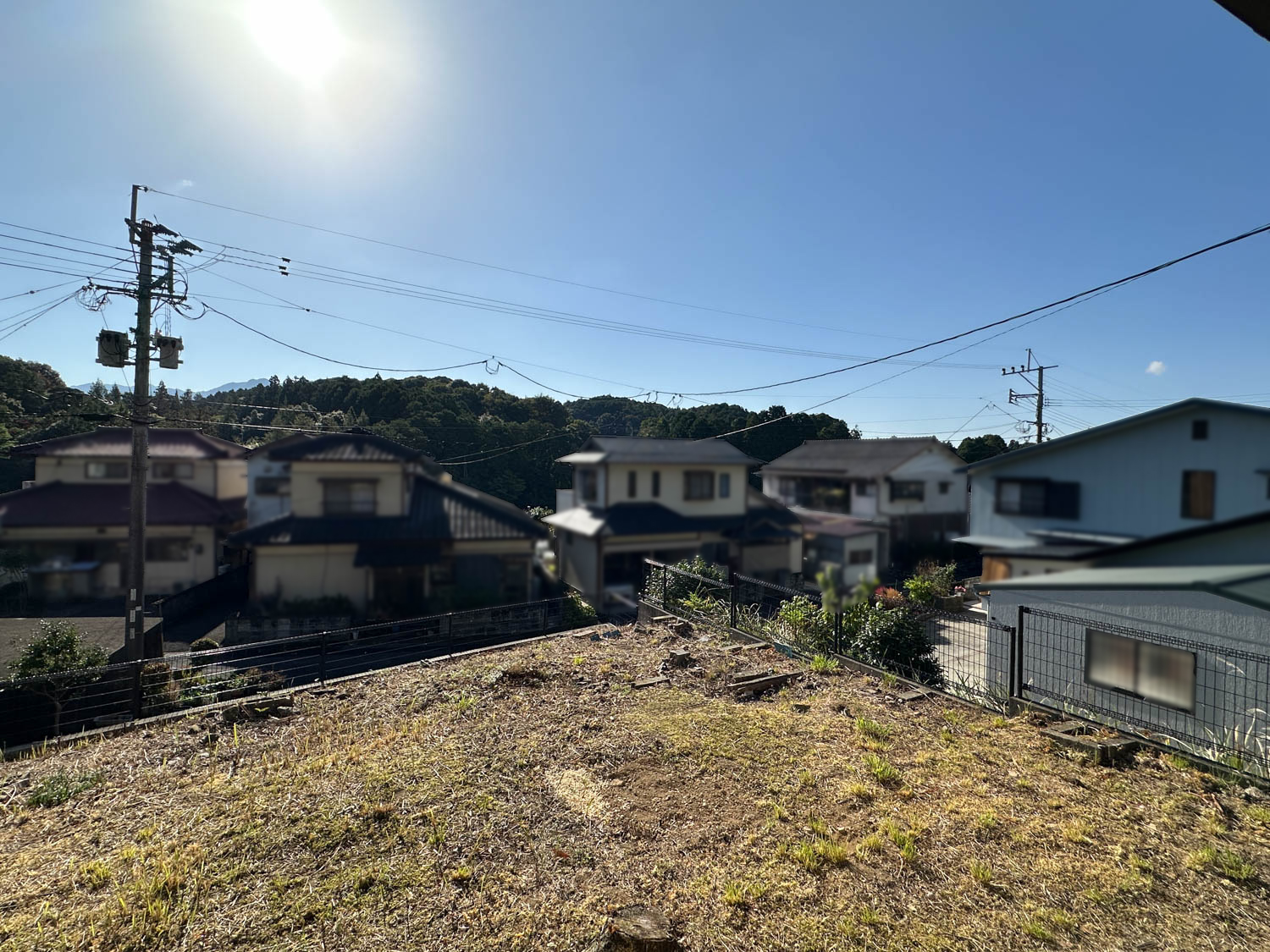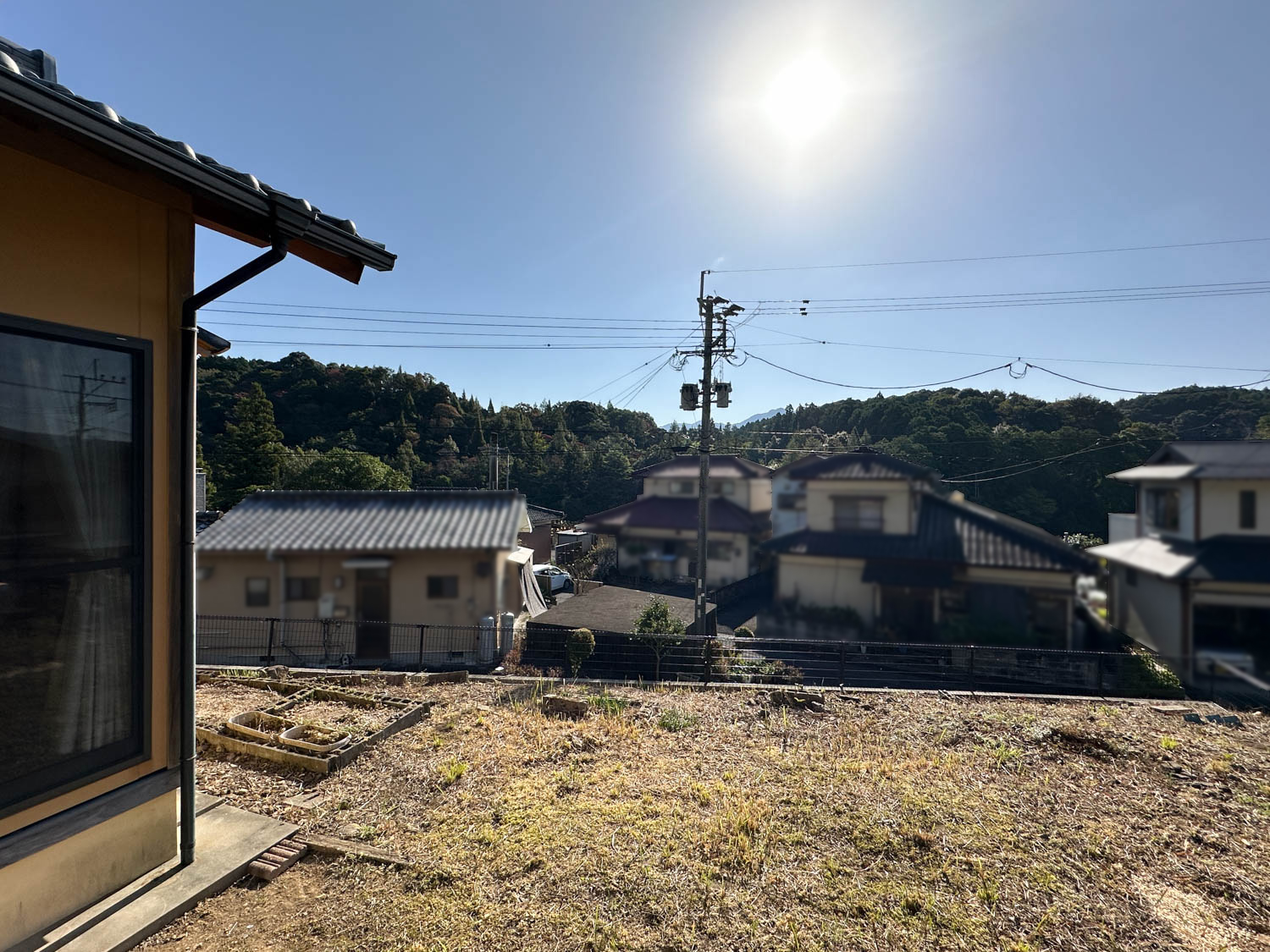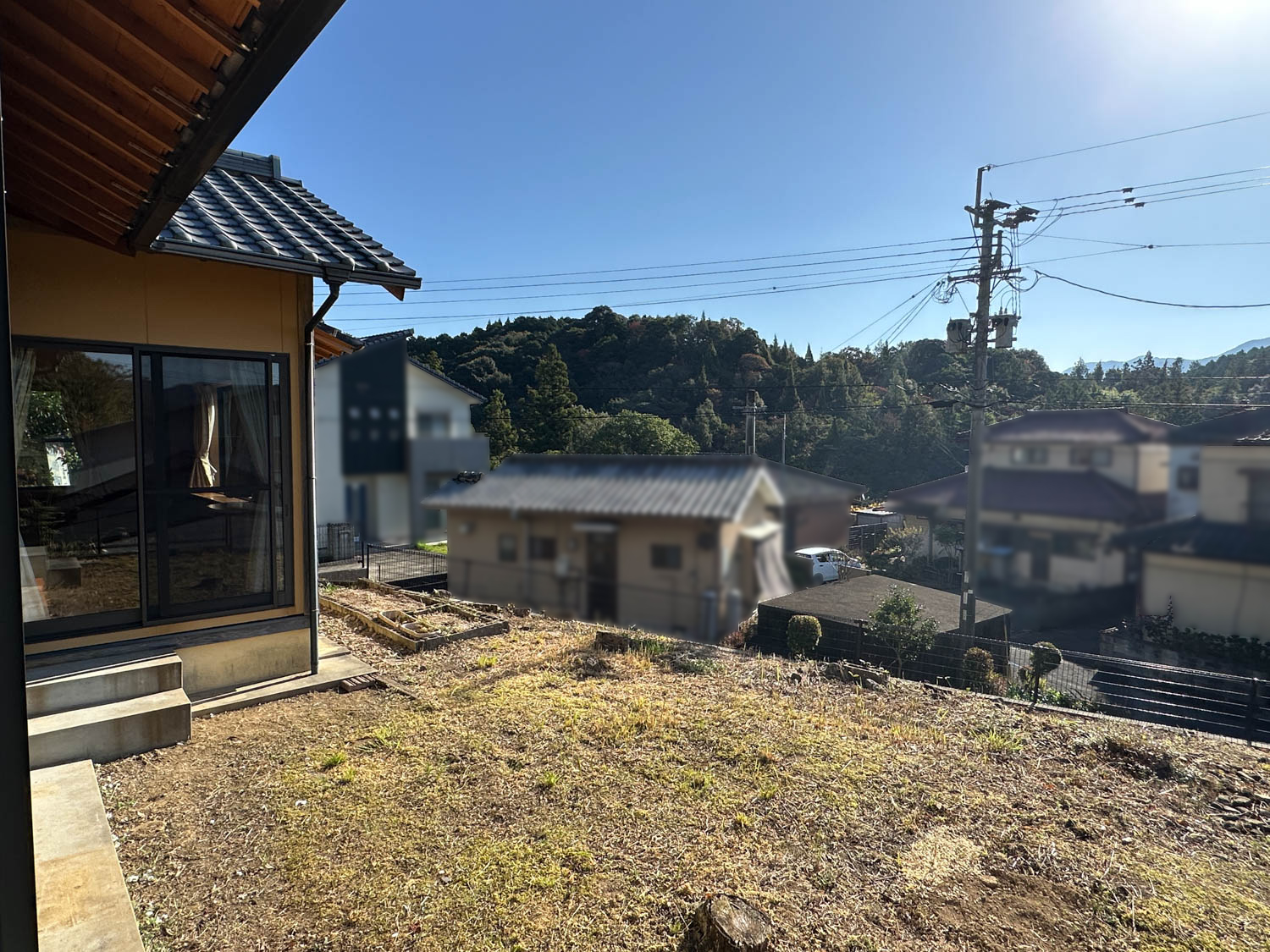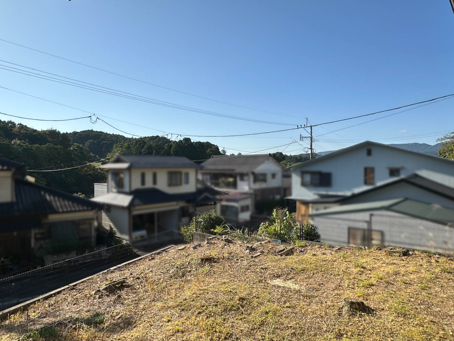 お庭からの様子。付近の住宅は一段低い位置にあり、遮るものも無いため、遠くの山並みまで見通せます。