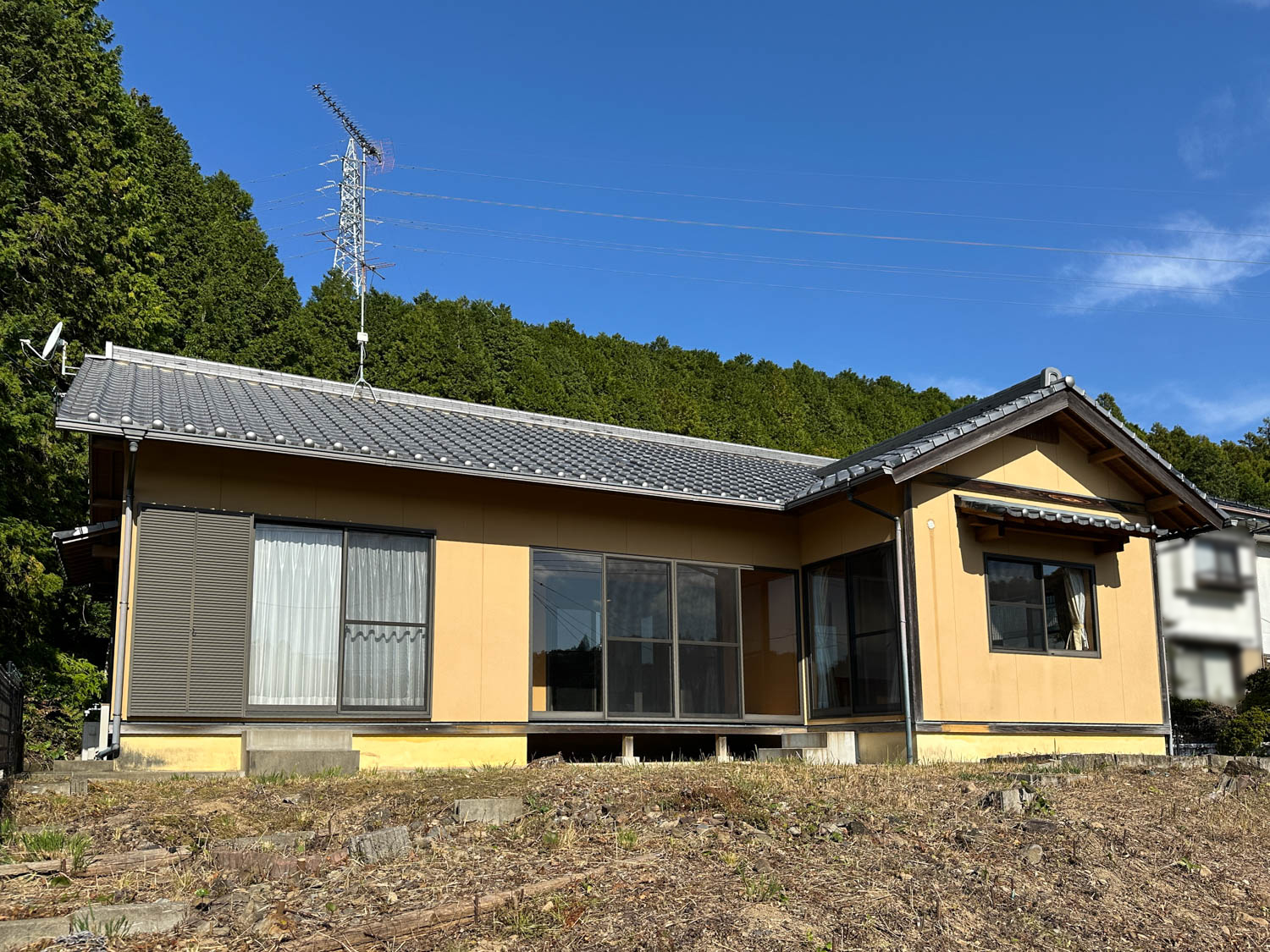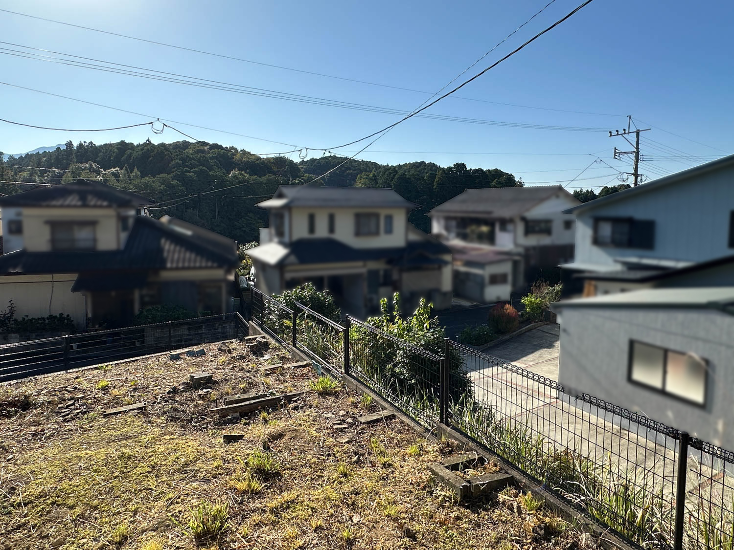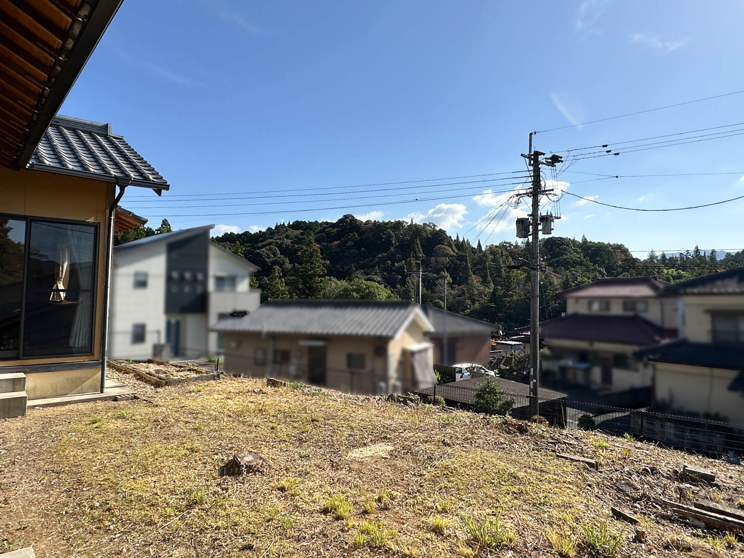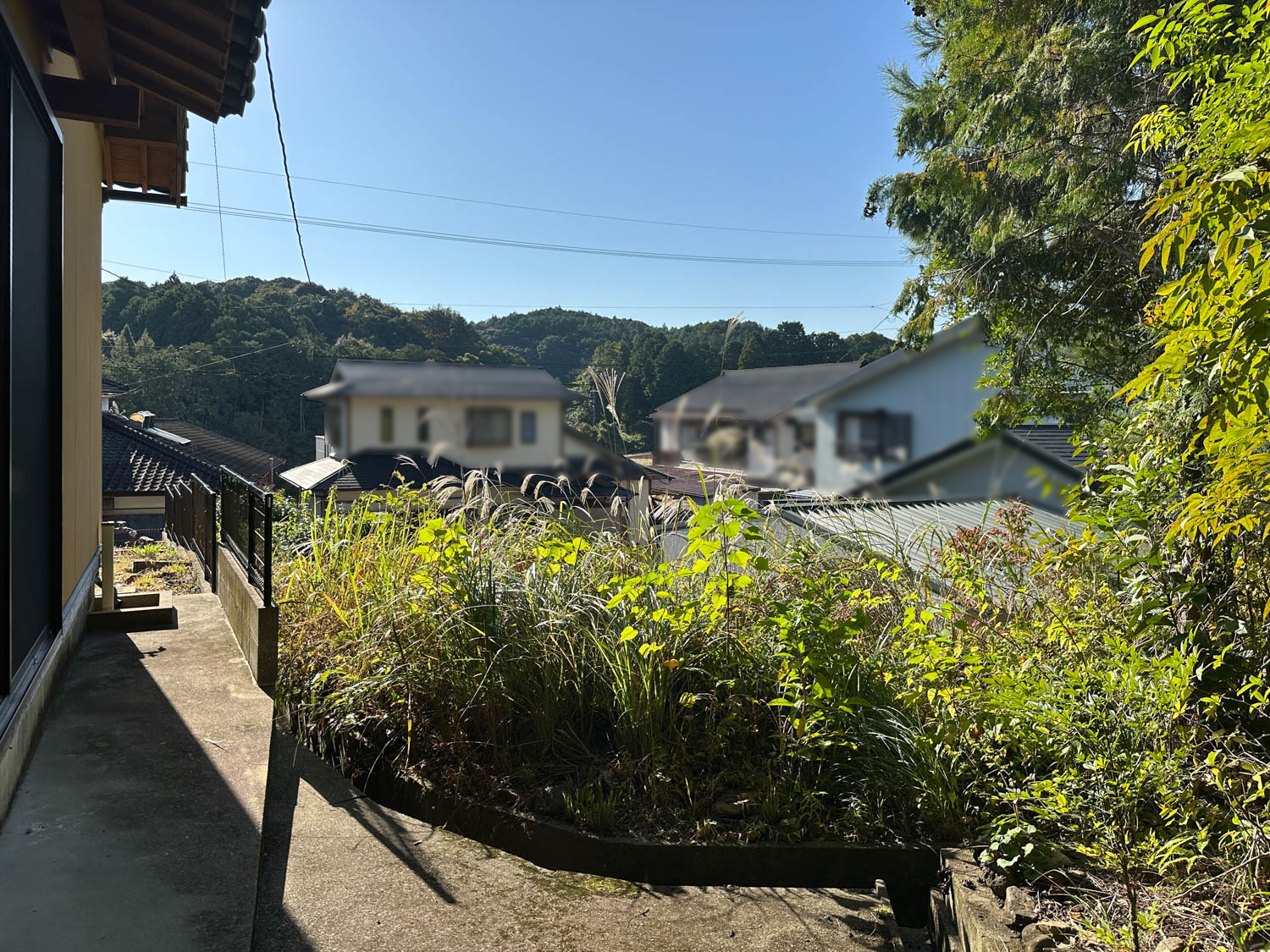 お庭からの様子。付近の住宅は一段低い位置にあり、遮るものも無いため、遠くの山並みまで見通せます。