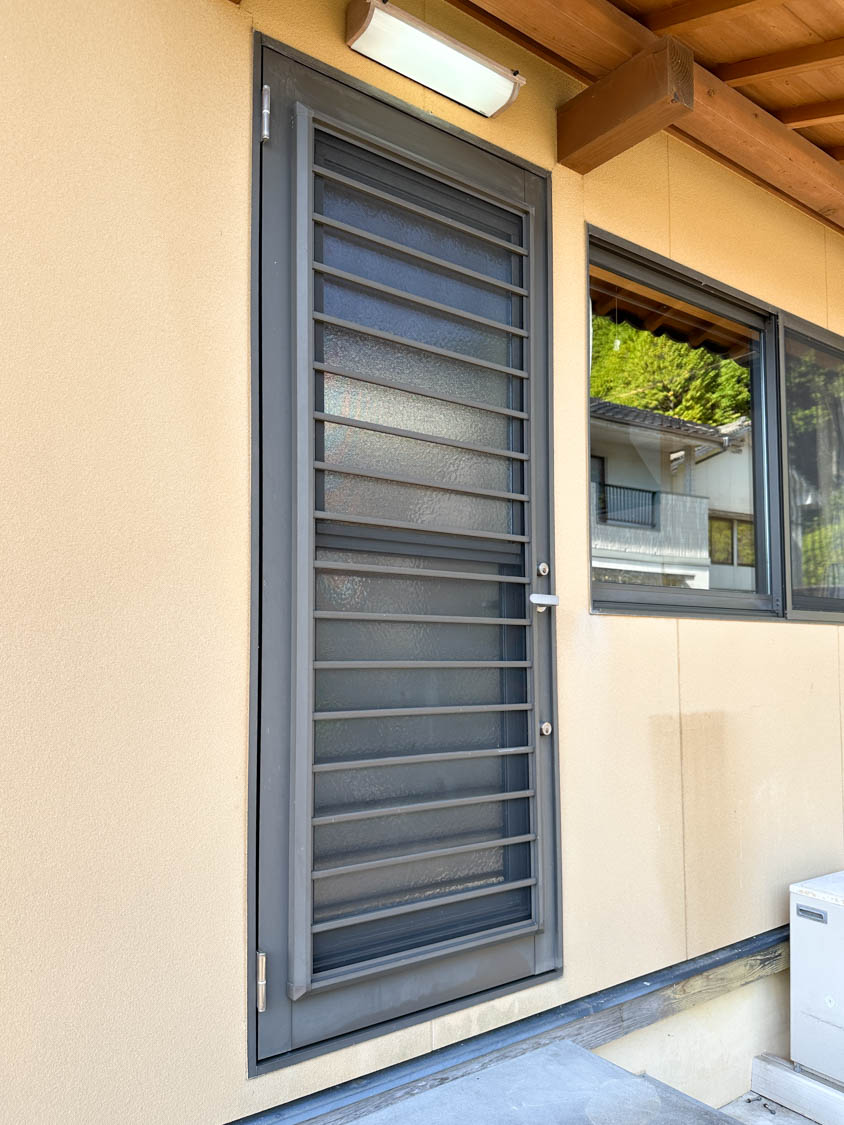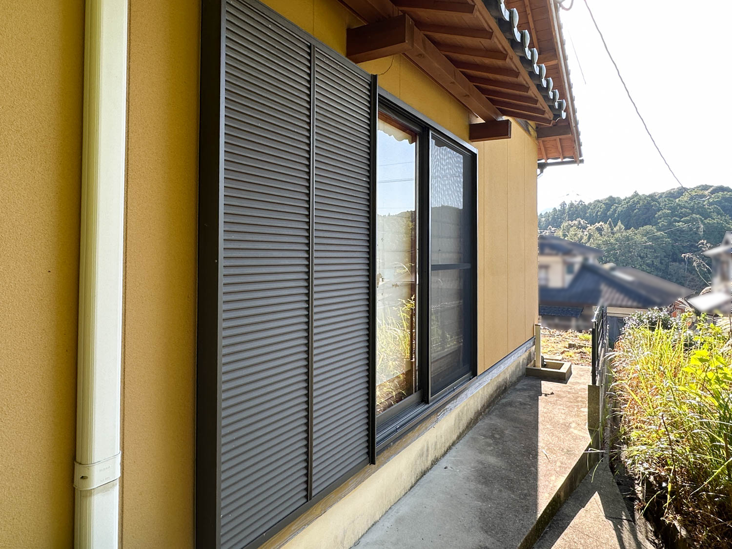 窓には雨戸が設置されているので、台風の時などでも安心して過ごせます。建物の角にも屋外水栓がありました。