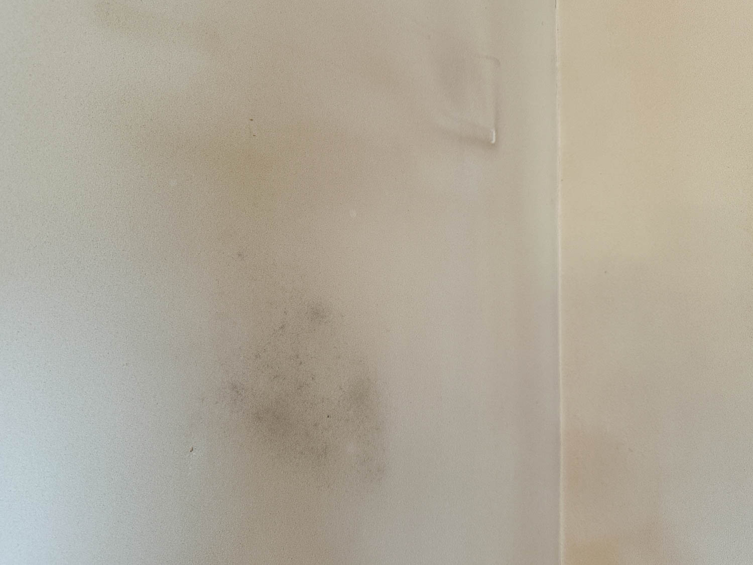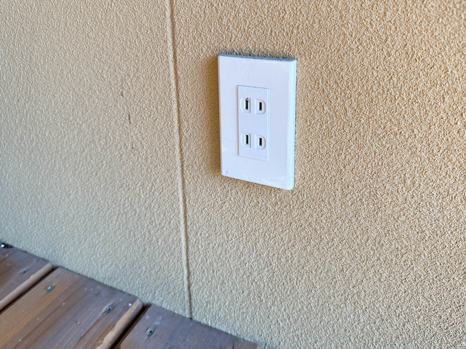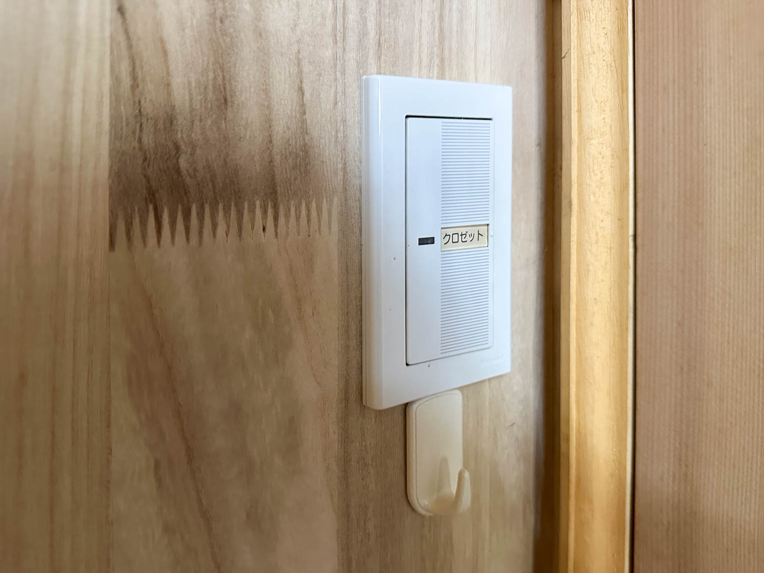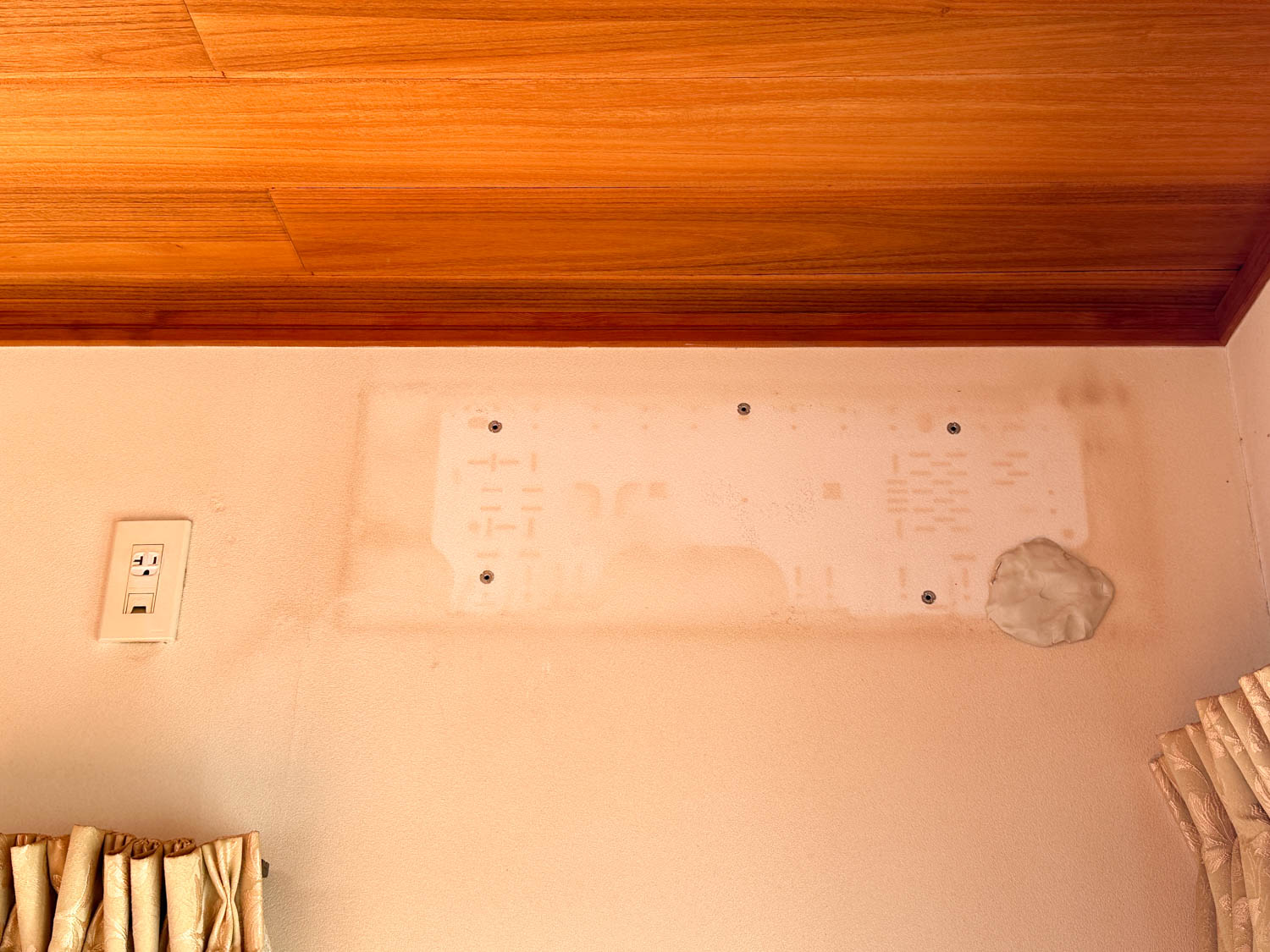 ダクトの横には、高い位置にコンセントが設置されていました。壁にはところどころ、ピンを刺した跡や黒ずみが見られます。