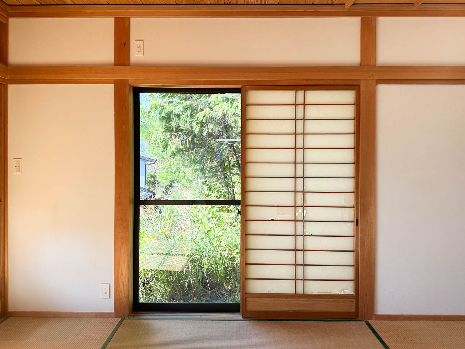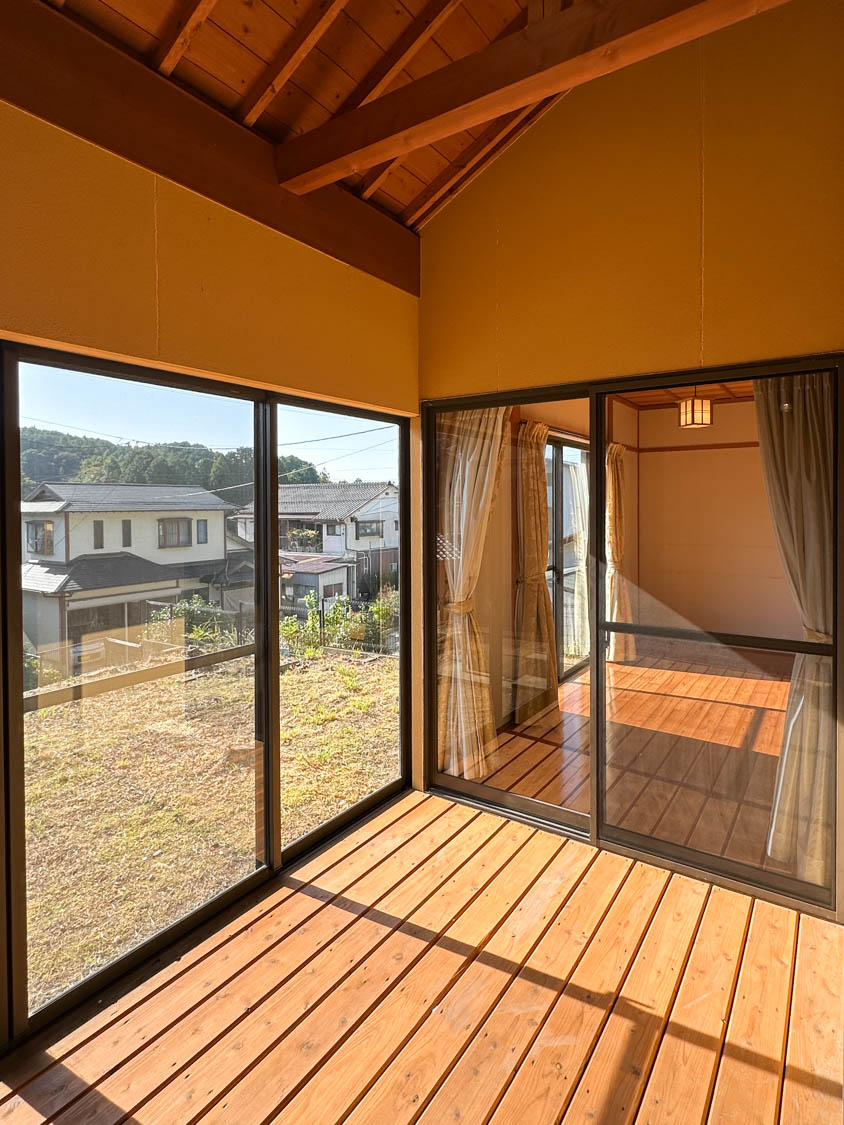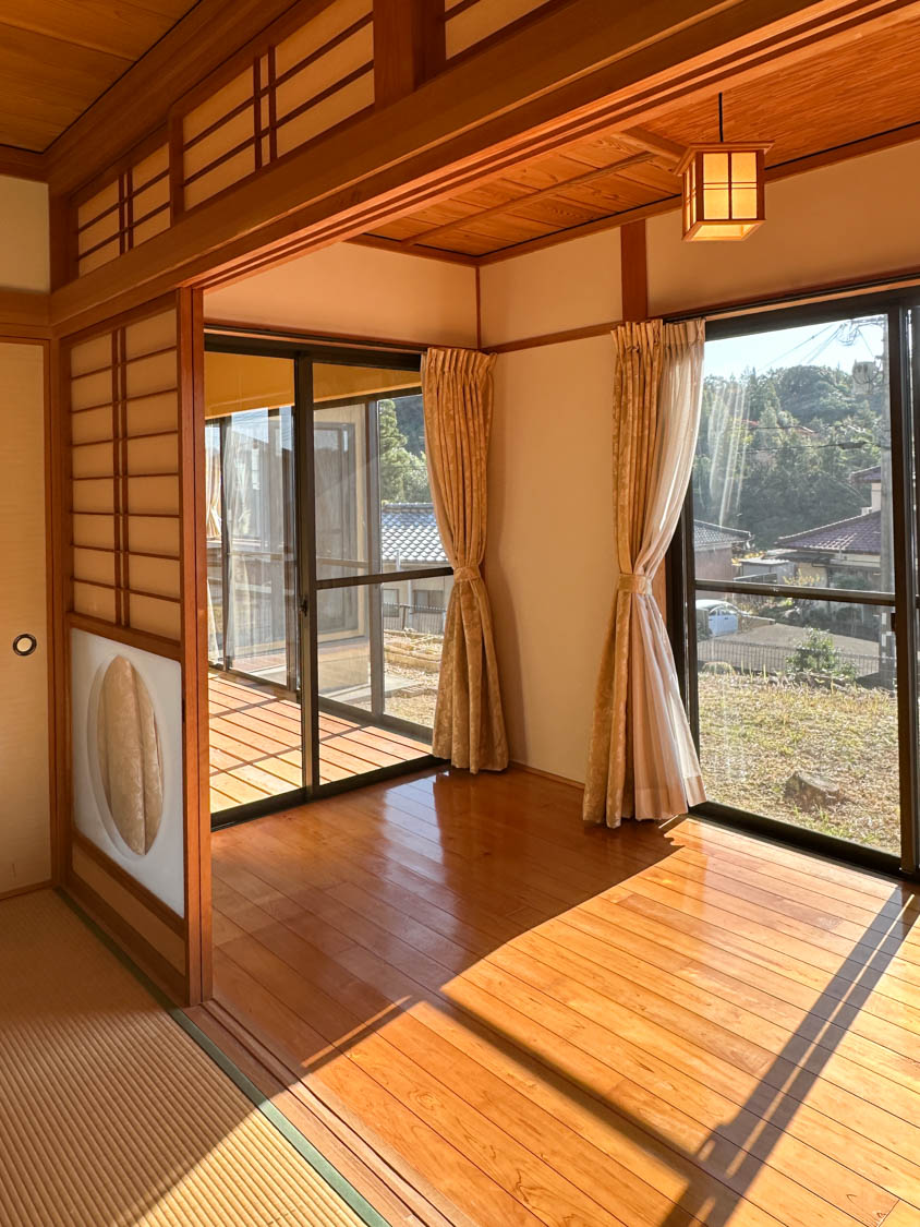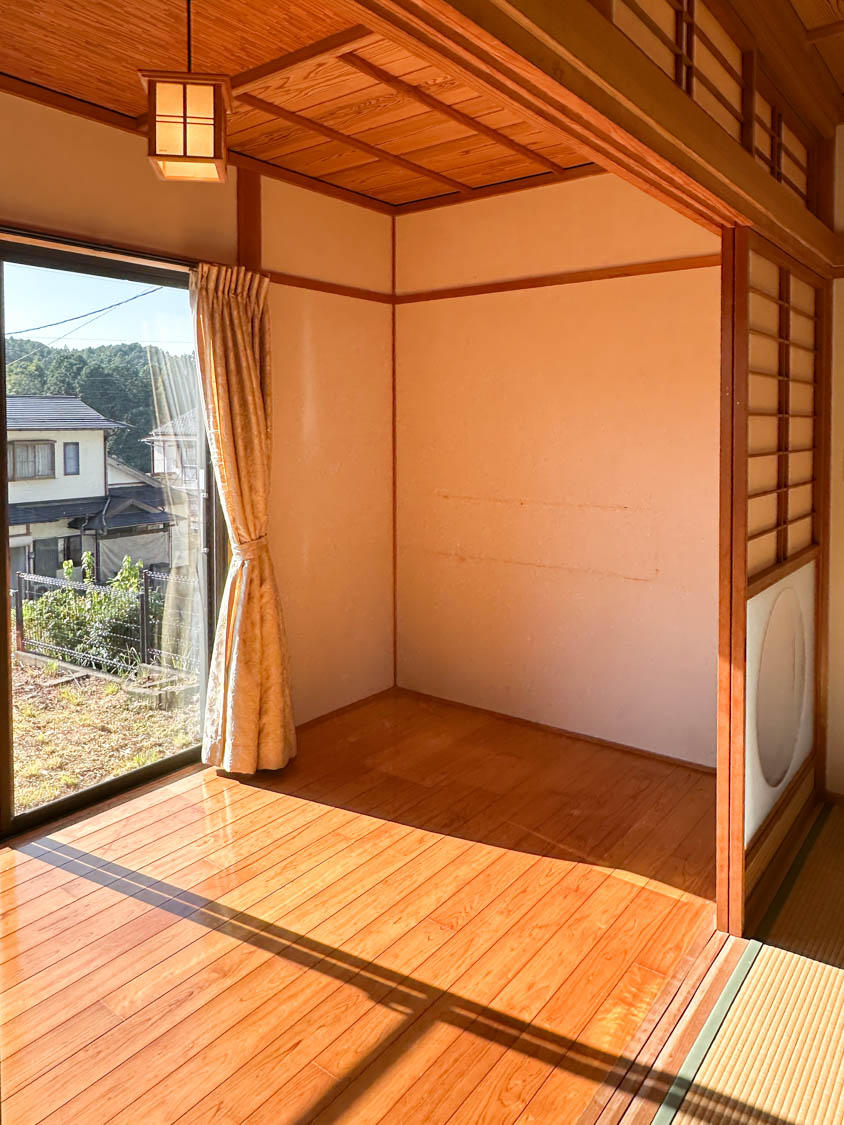 西側の窓からは裏山の様子なども眺めることができました。障子が少し破けていたり、畳には家具を置かれていた跡があります。