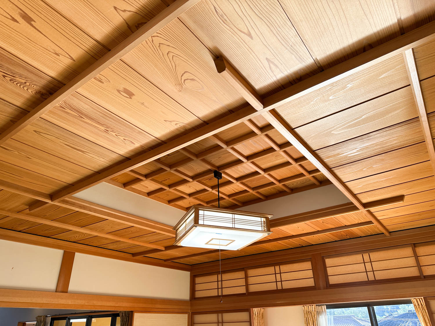 格子デザインの折り上げ天井も、風格があってとても美しい。