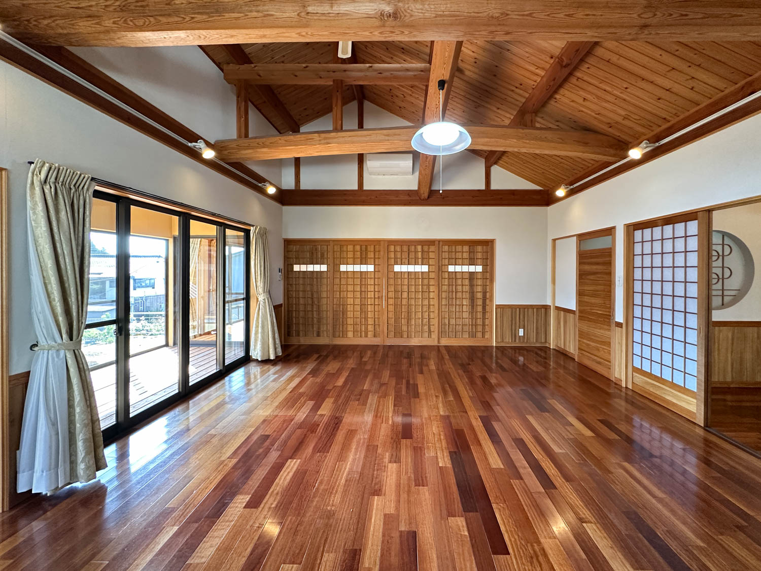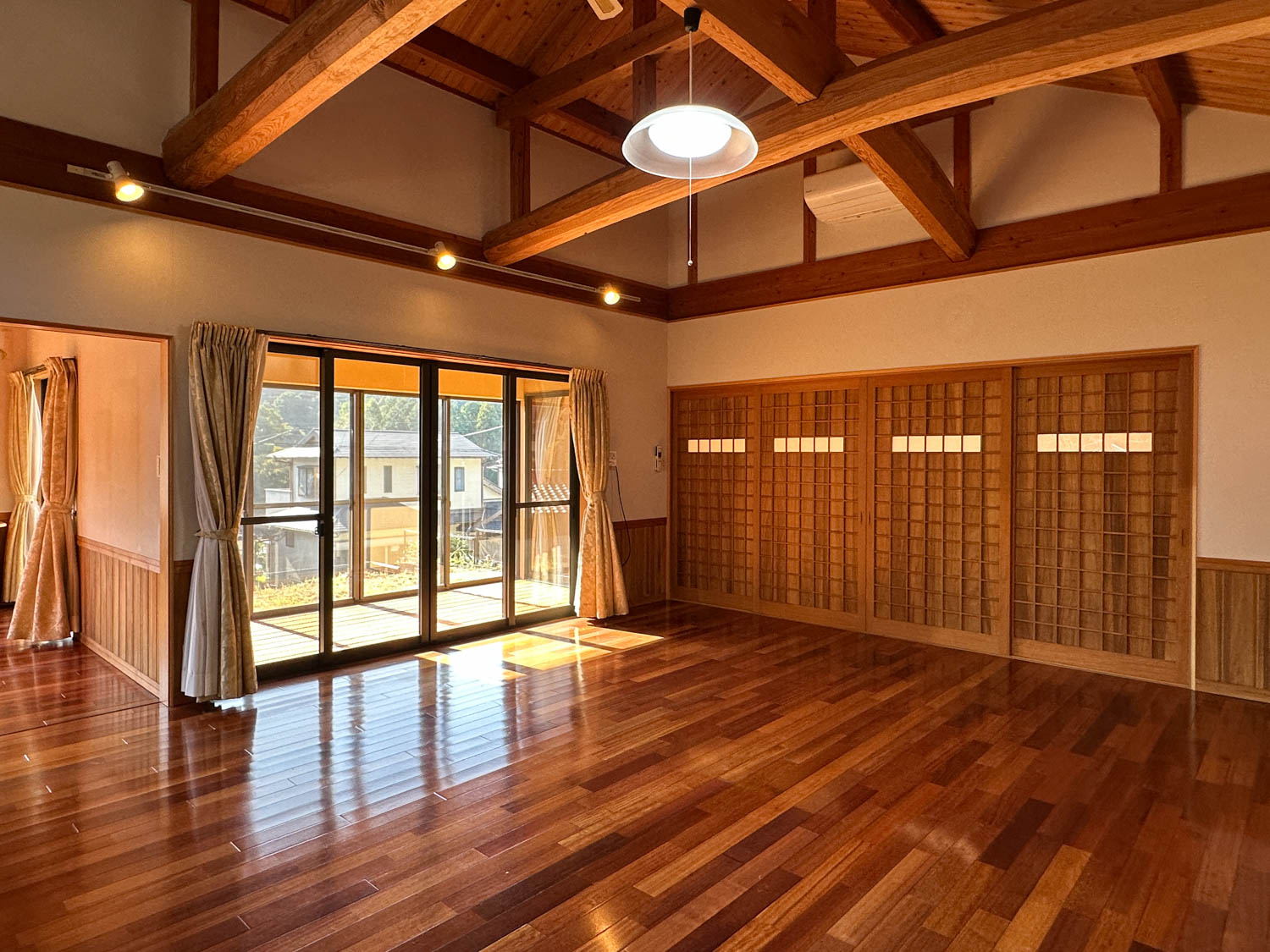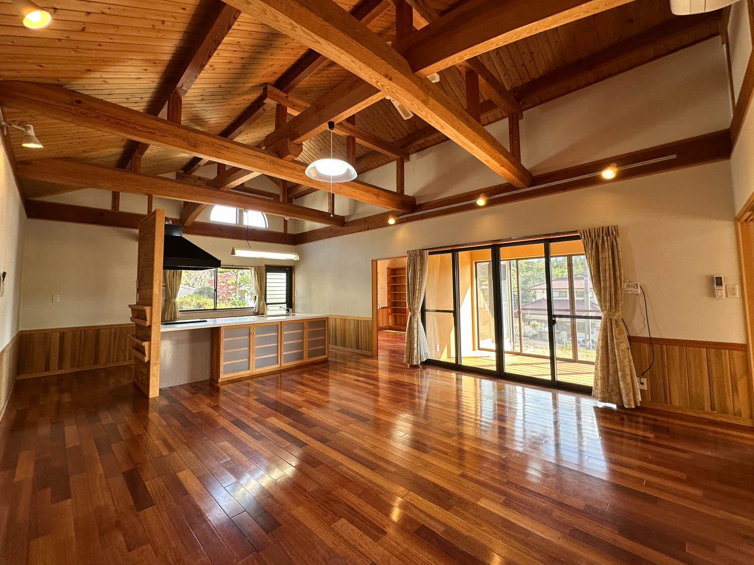 9.8帖の洋室は、天井も板張りで贅沢なつくり。(※写真は広角撮影のため、空間が実際より広めに感じられることがあります。)