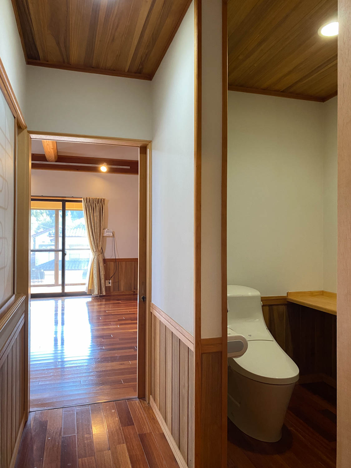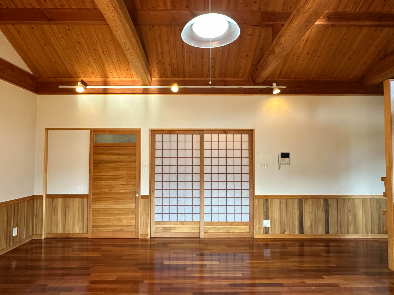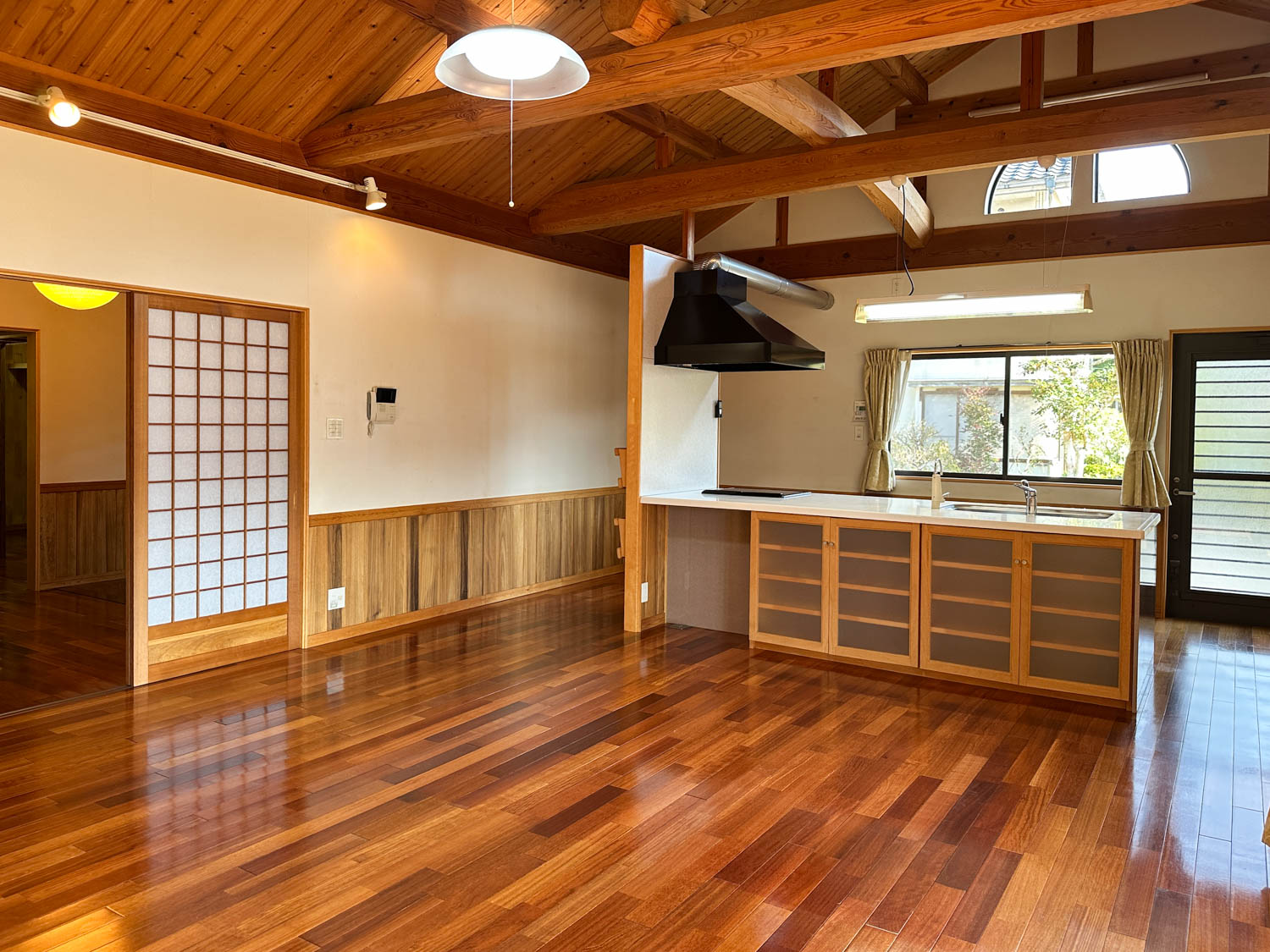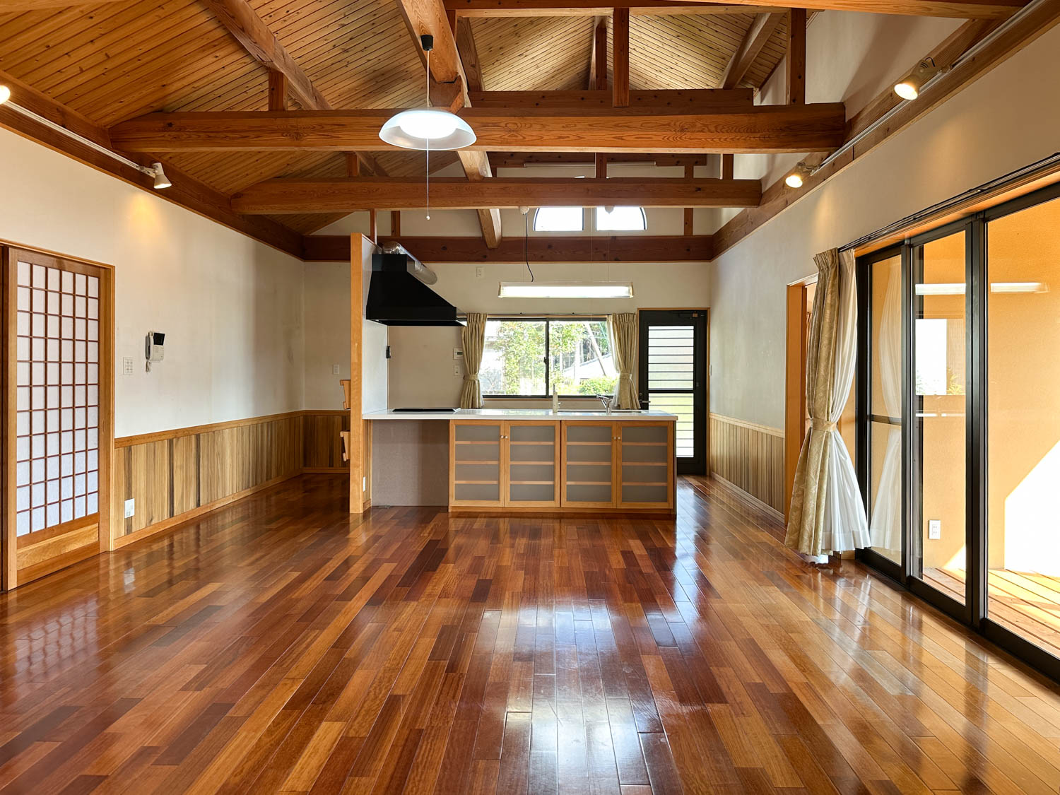 9.8帖の洋室は、天井も板張りで贅沢なつくり。(※写真は広角撮影のため、空間が実際より広めに感じられることがあります。)