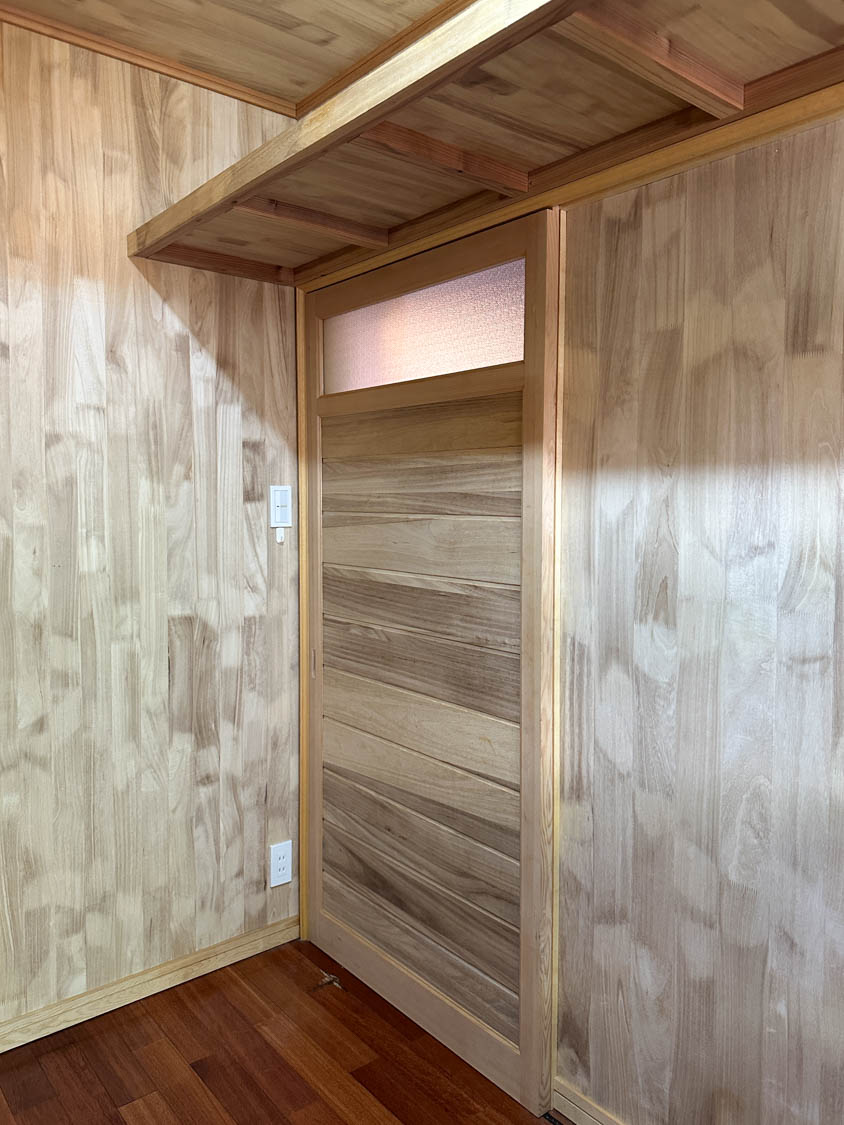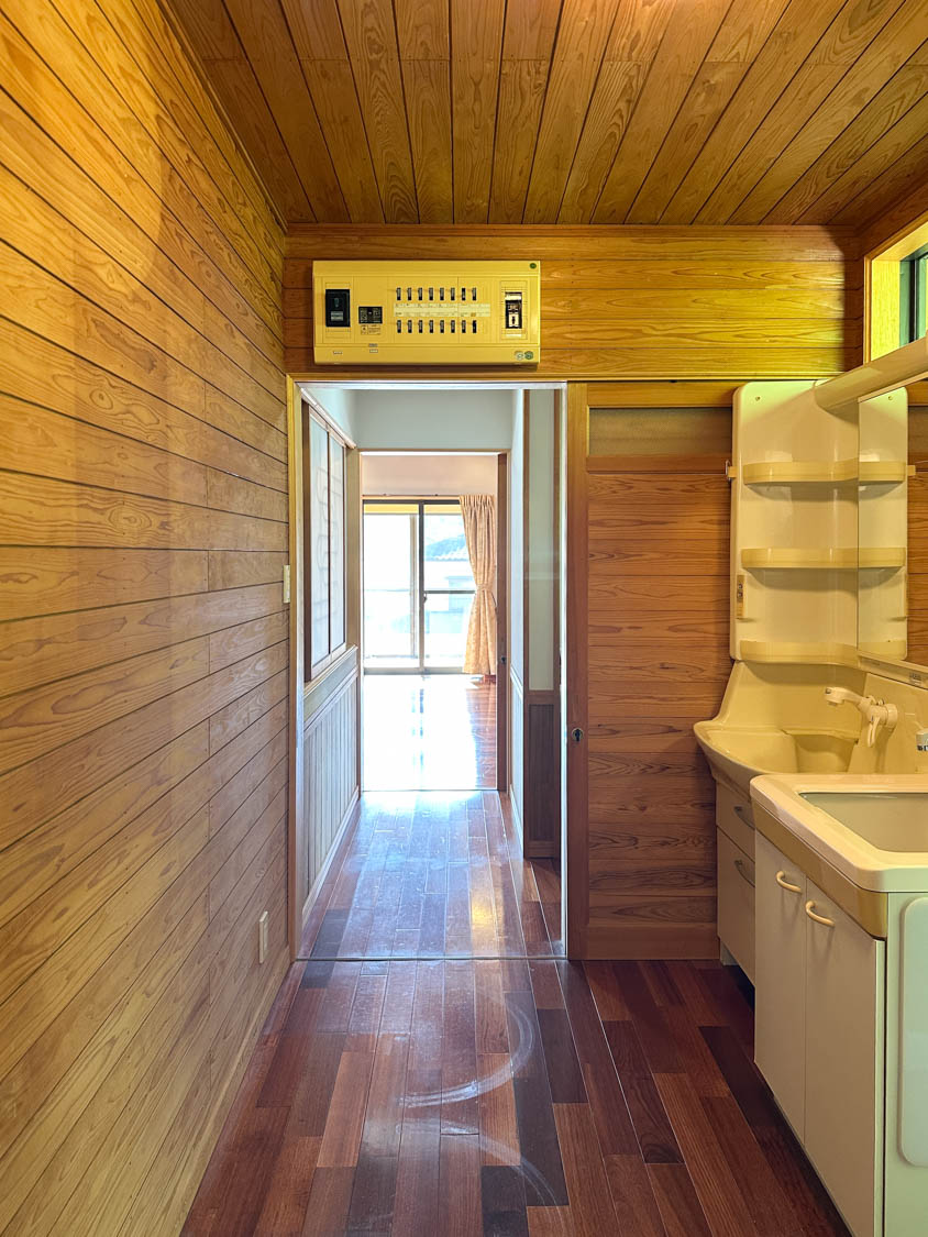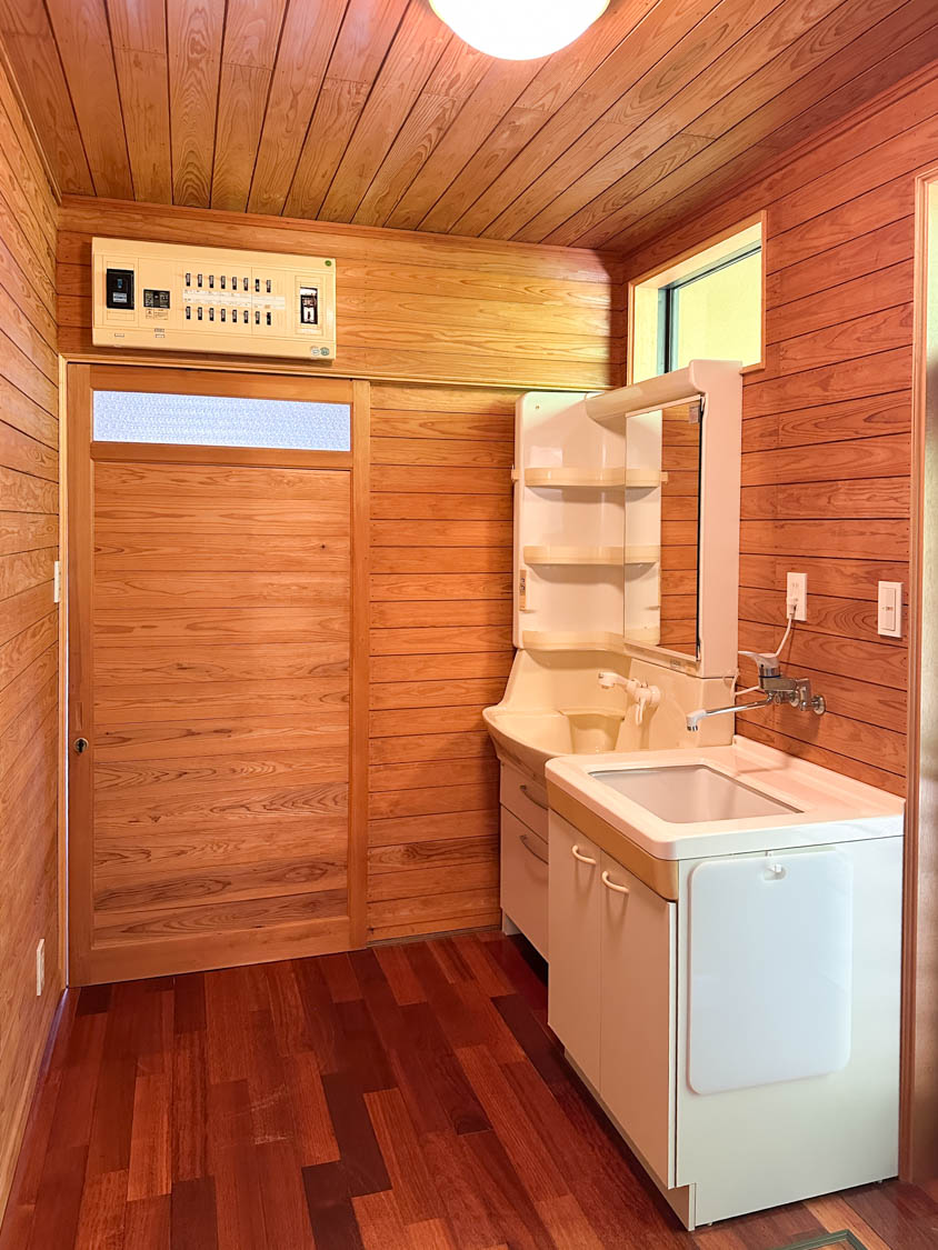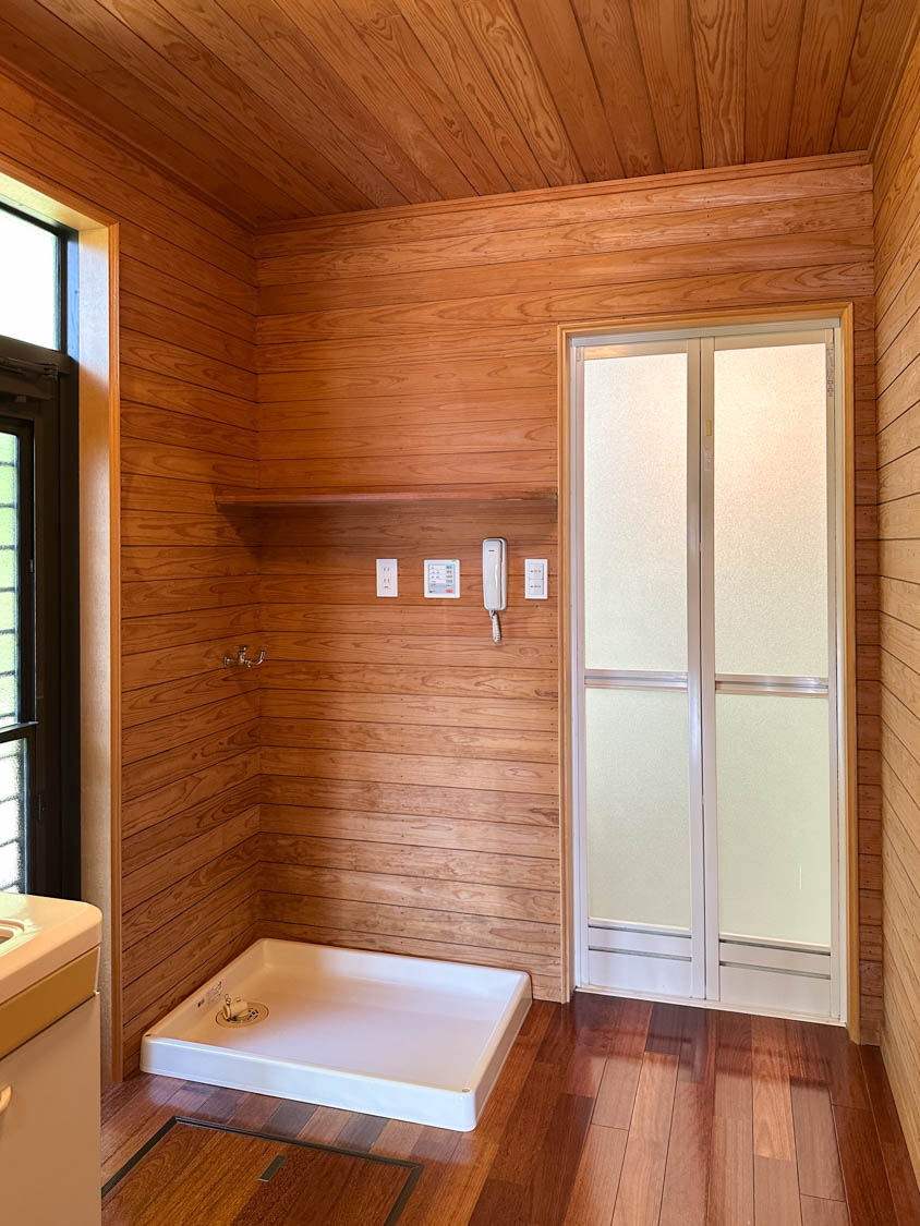 洗面脱衣室の壁や天井は贅沢な全面板張り。木壁は調湿効果もあるので、湿気の多い空間にはピッタリです。