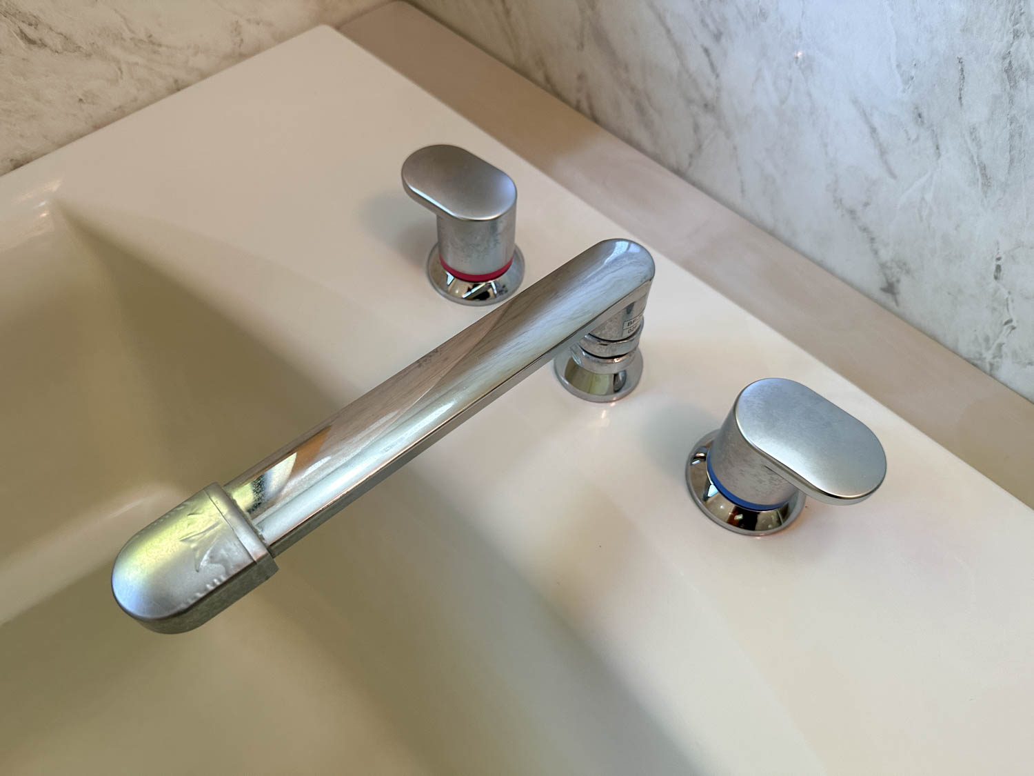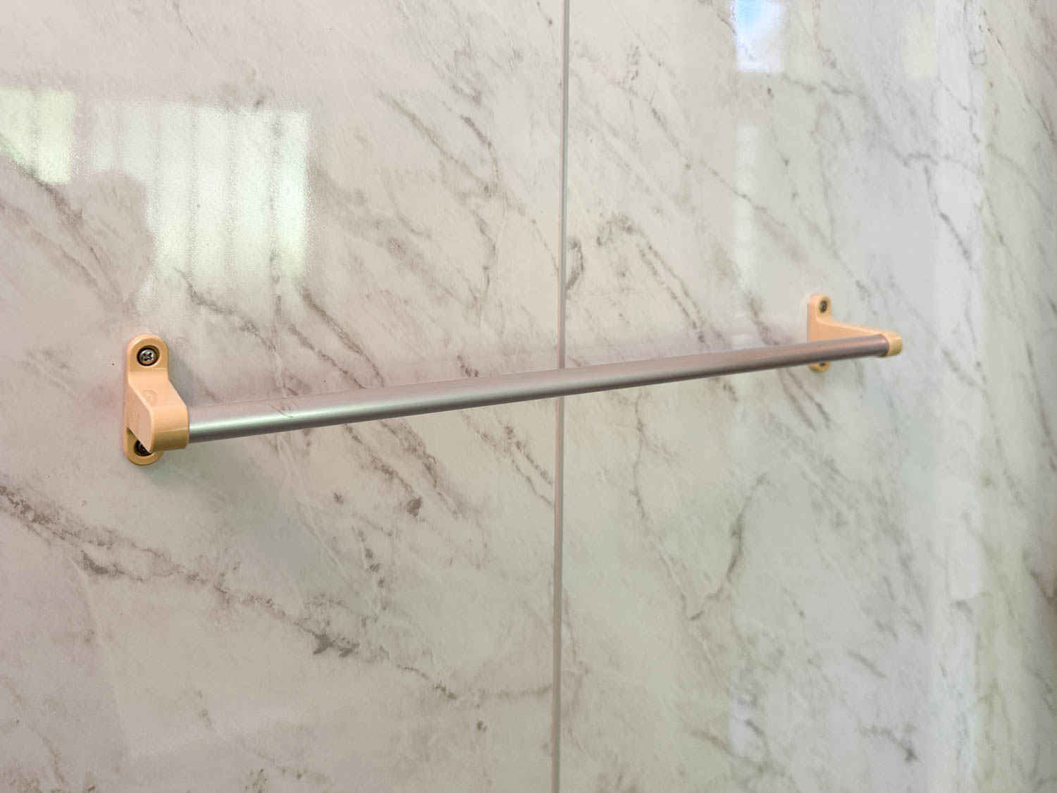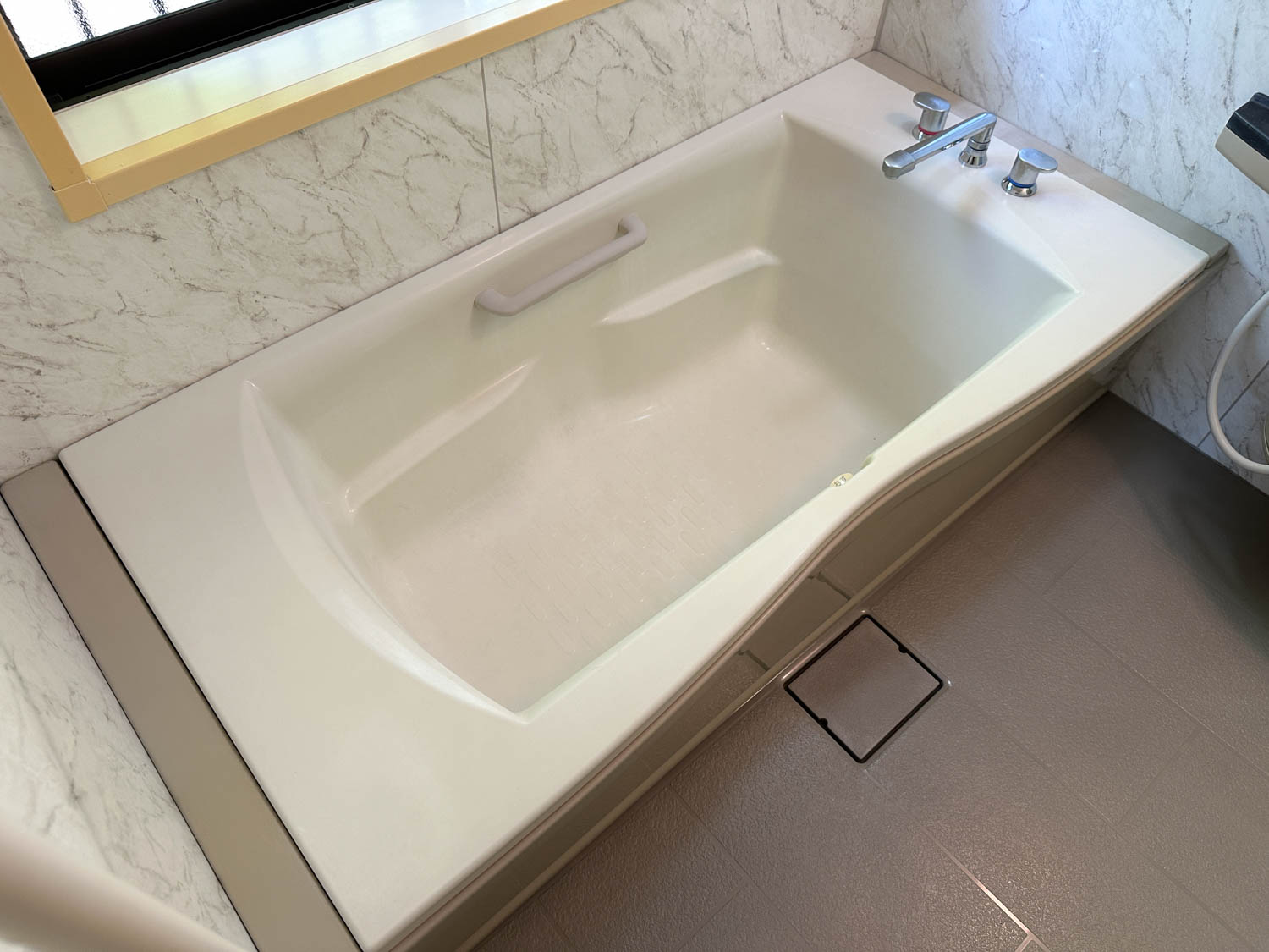 白い大理石調の壁パネルでまとめられた浴室は、全体的に明るく高級感がありました。