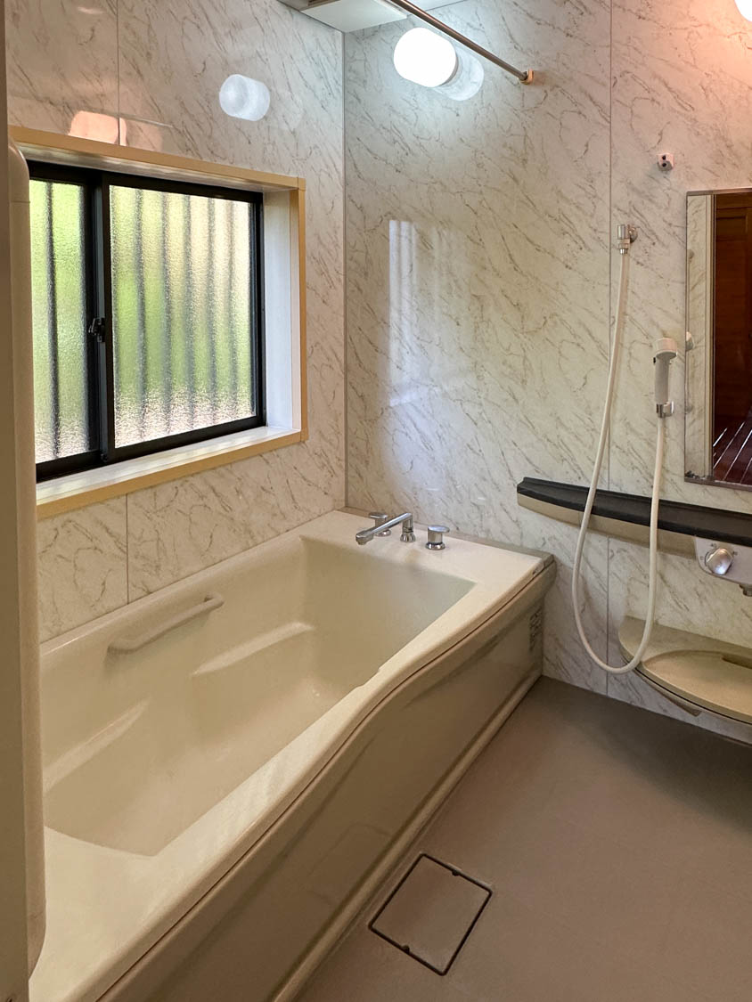 大きめの窓には縦格子が設けられているので、防犯面も安心。浴室換気扇も比較的きれいな状態でした。