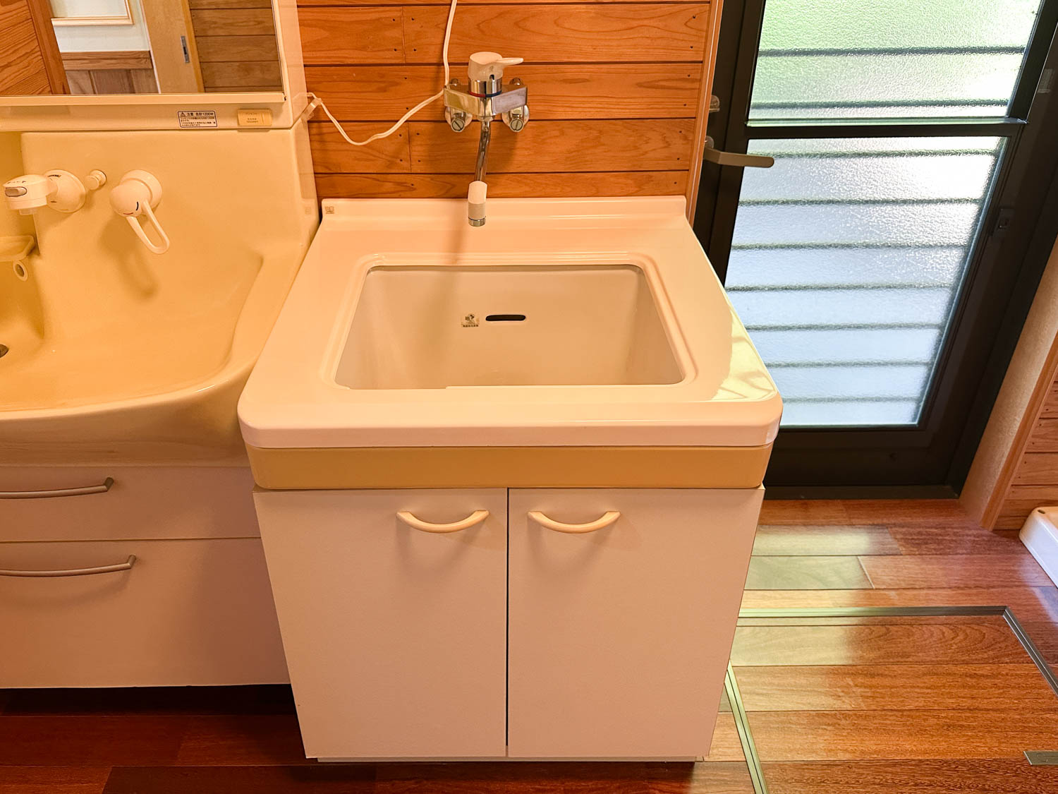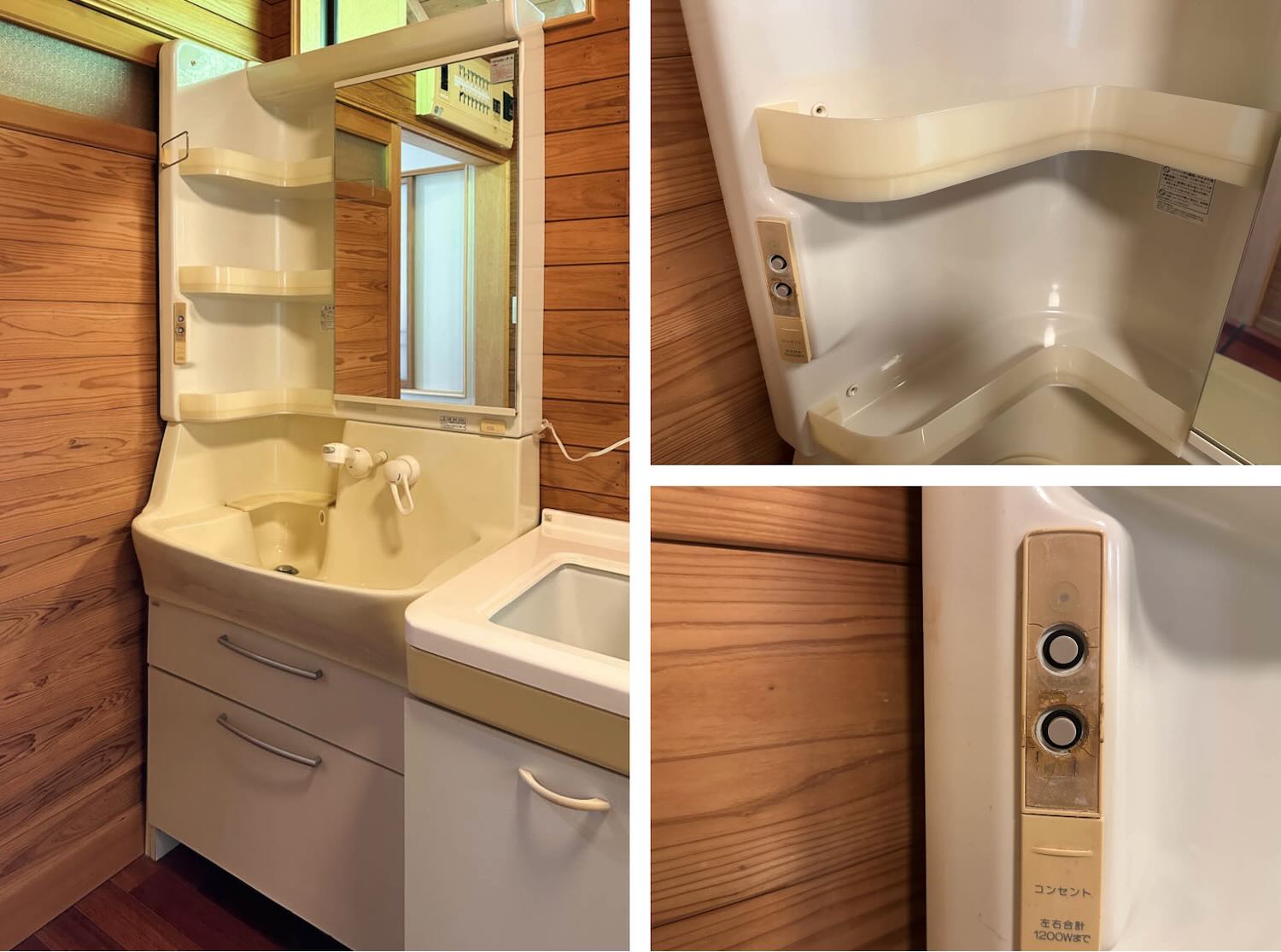 サンウェーブの洗面台は新築当時のままのよう。曇り止めヒーターも付いているようでしたが、スイッチ周りは少しひび割れしていました。