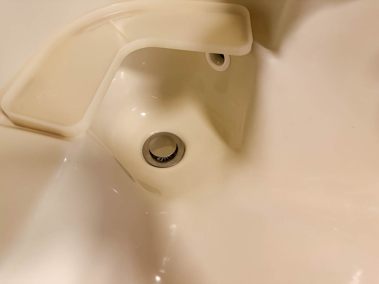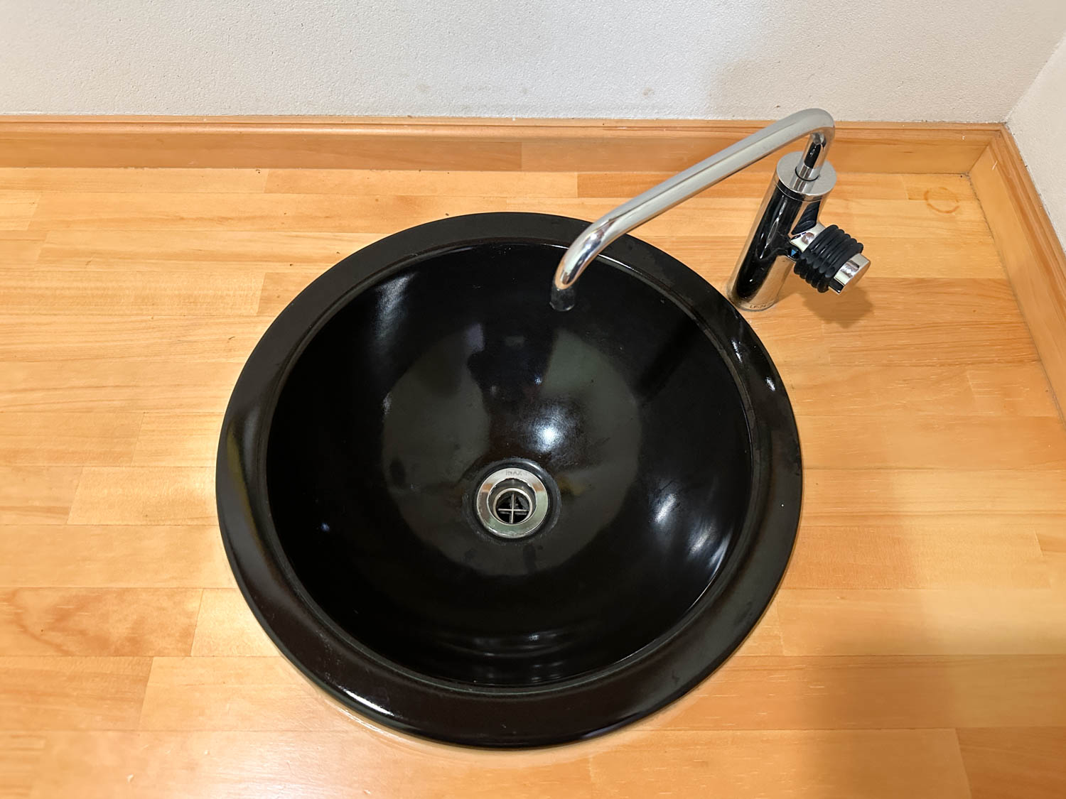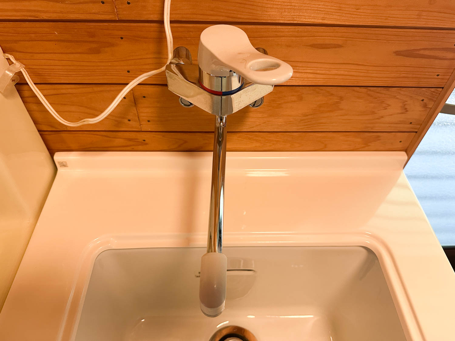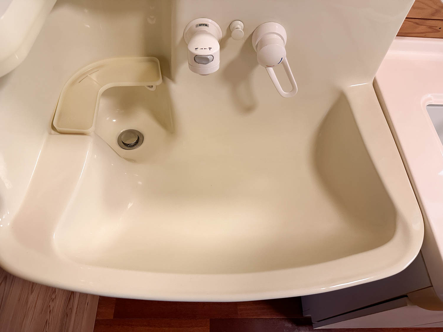 混合水栓と洗髪用のシャワーも付いています。排水金物の上には石鹸などを置くスペースもありました。