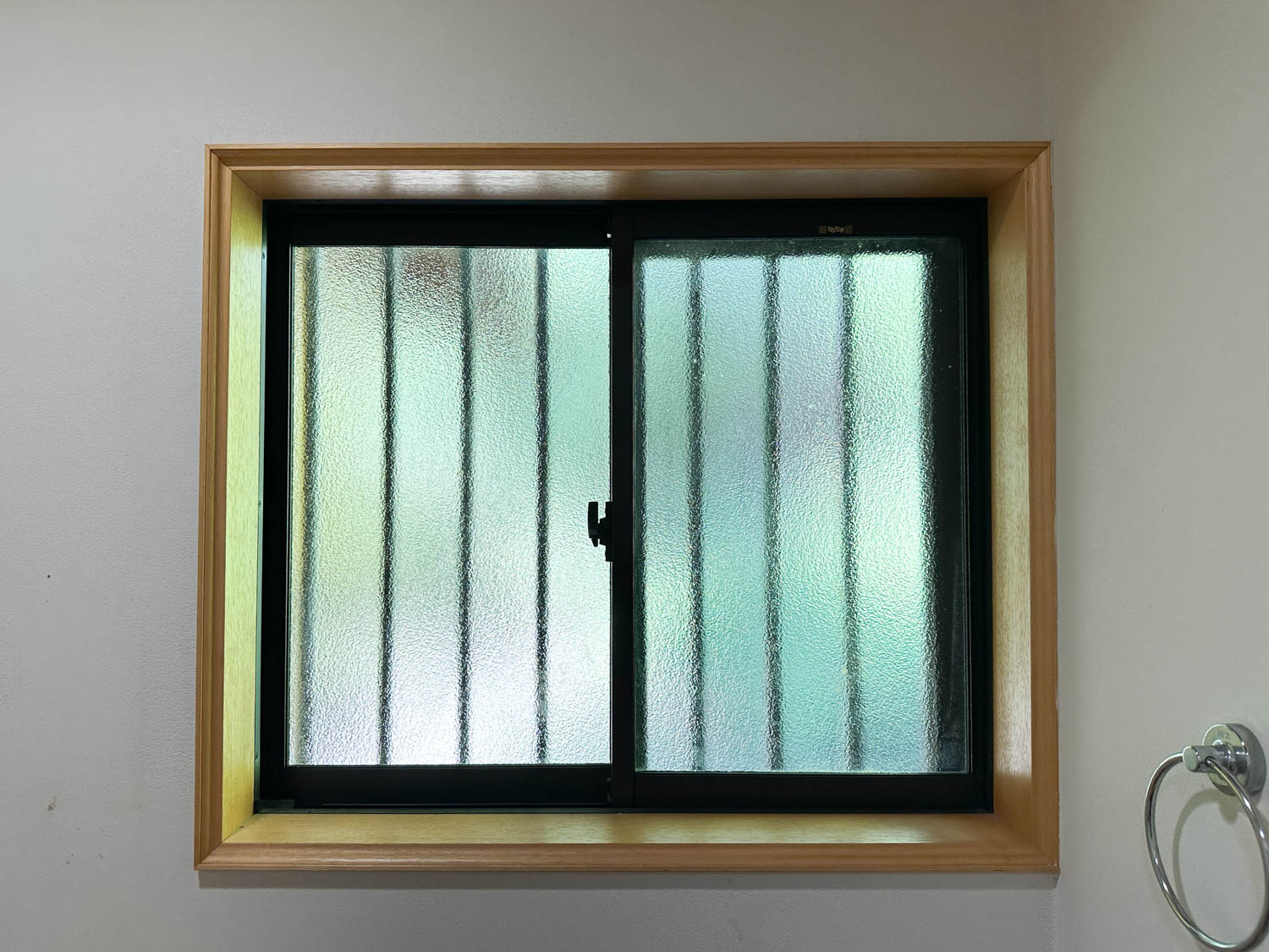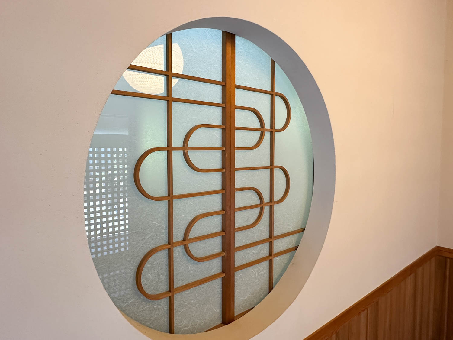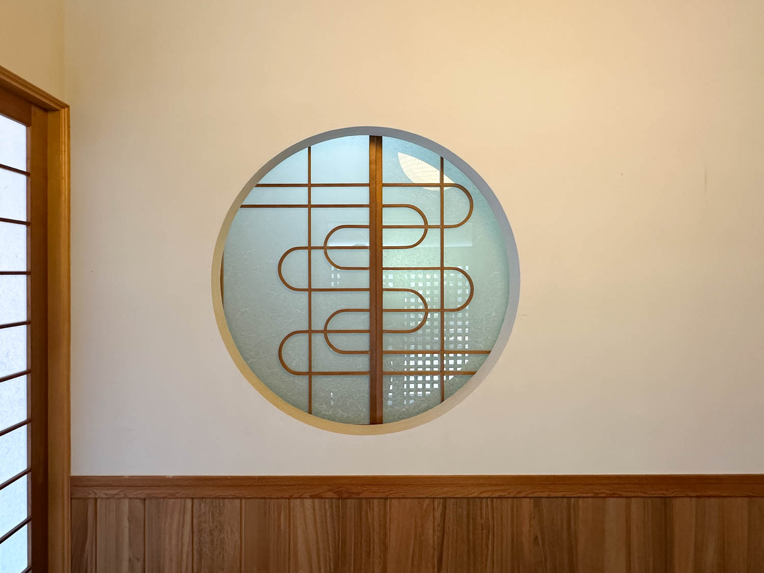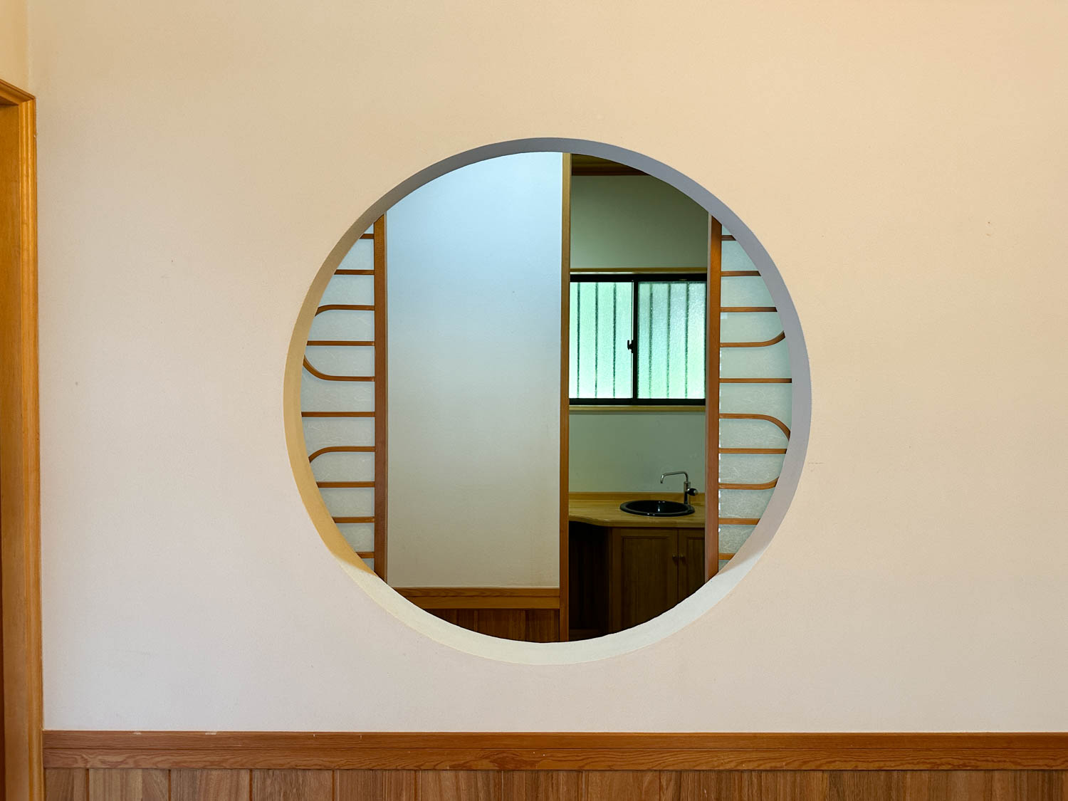 正面にあしらわれている流れるようなデザインの丸窓も、空間に調和と安らぎをもたらしていました。窓は開け閉めすることができ、水回り前の廊下へ繋がります。
