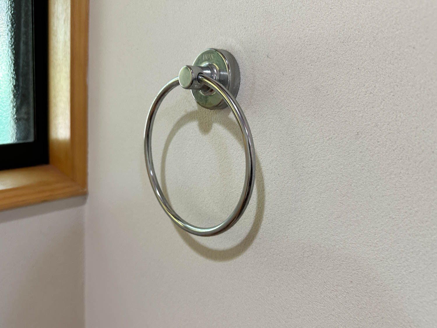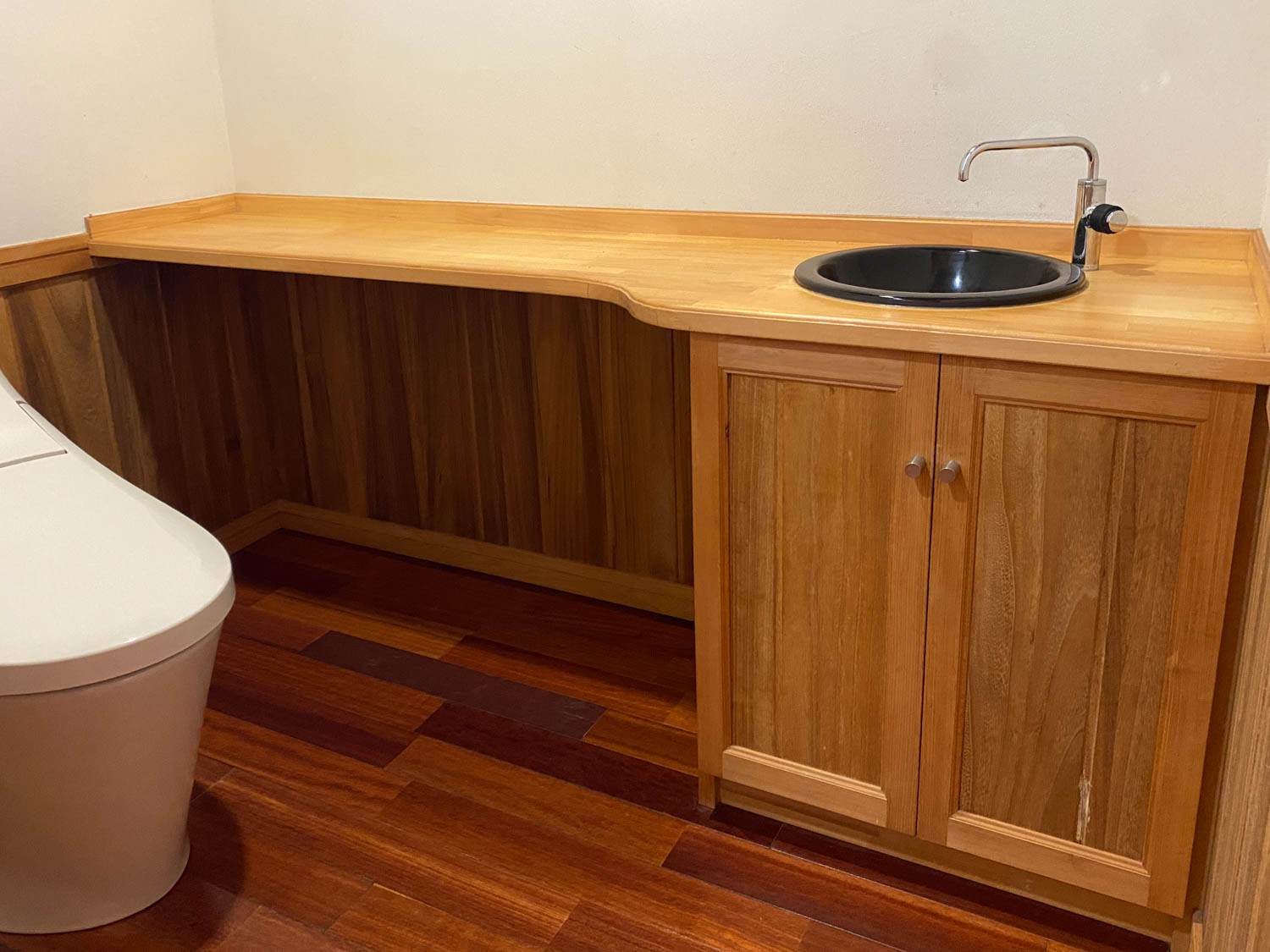 トイレの横には、木製の手洗いカウンターも設置されています。手洗いボウルとタオル掛けが“丸”で揃っているのも、個人的な推しポイント。